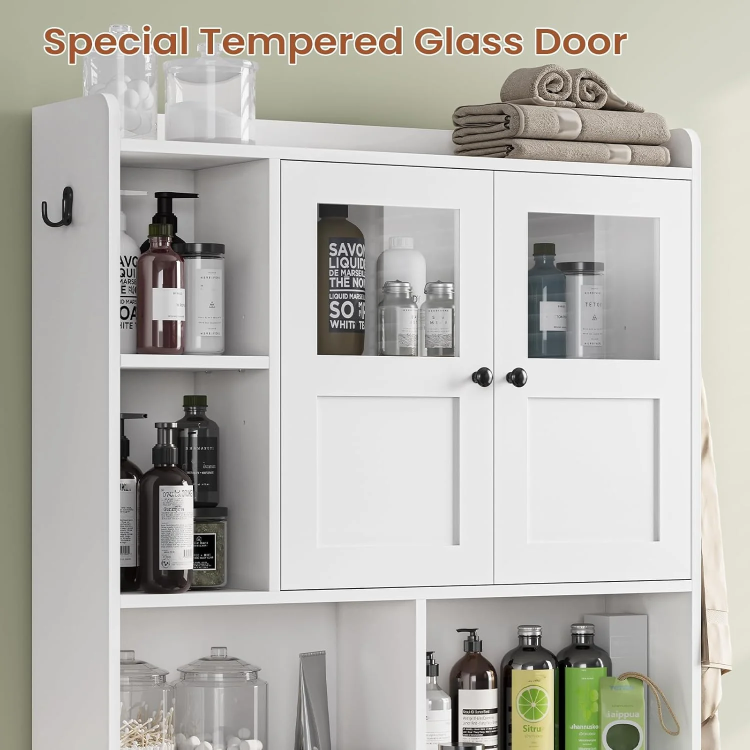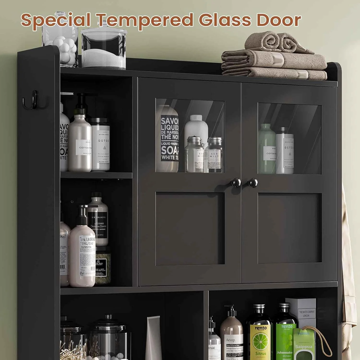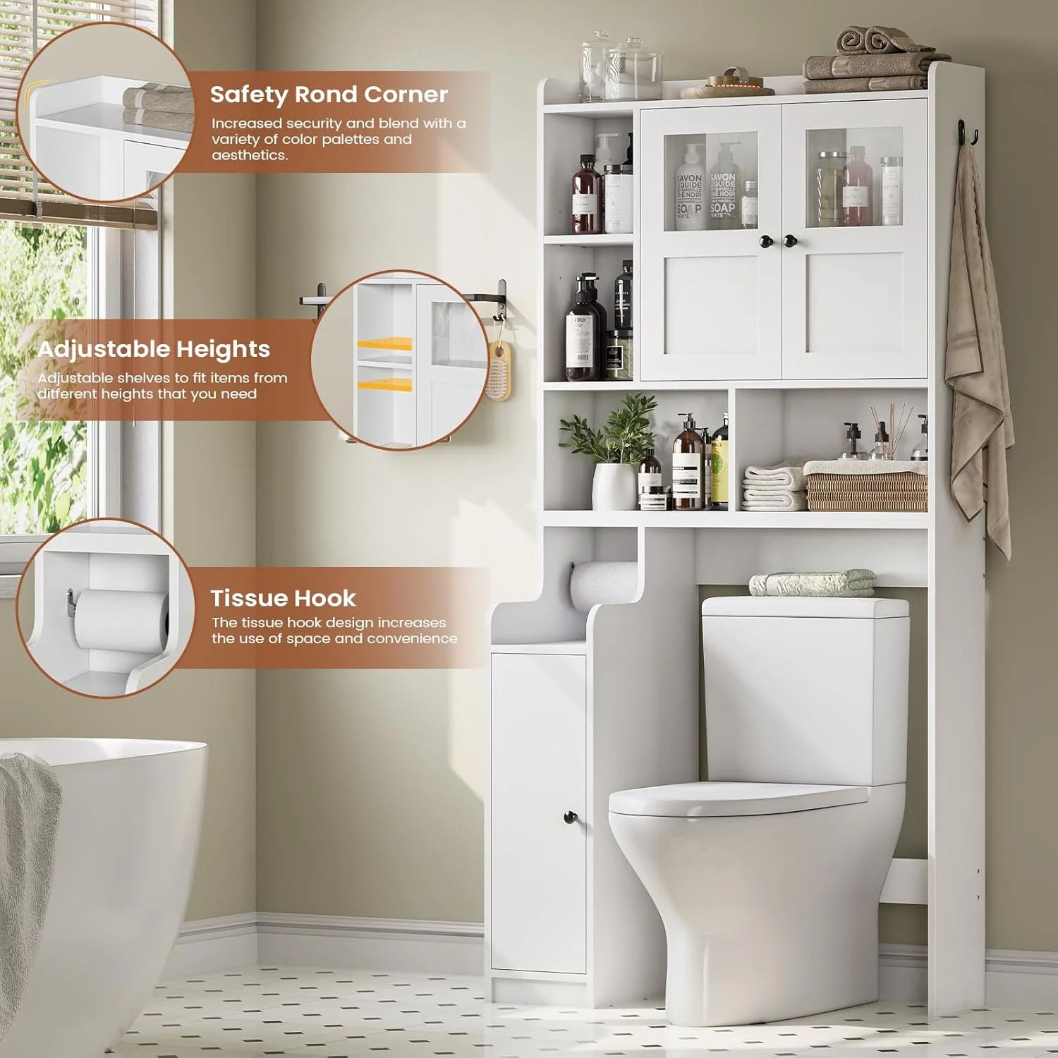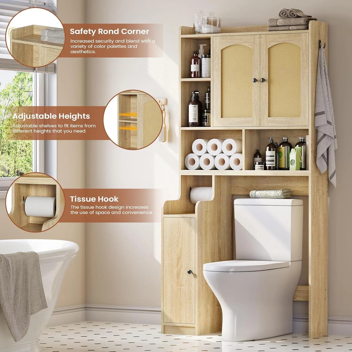 Over the Toilet Storage Cabinet with 3 Doors, Farmhouse Space Saver for Bathroom Organizer with Paper Holder, 10 Shelves and Hooks, 7 - Tier Over Washing Machine Cabinet for Laundry, Bathroom, Natural