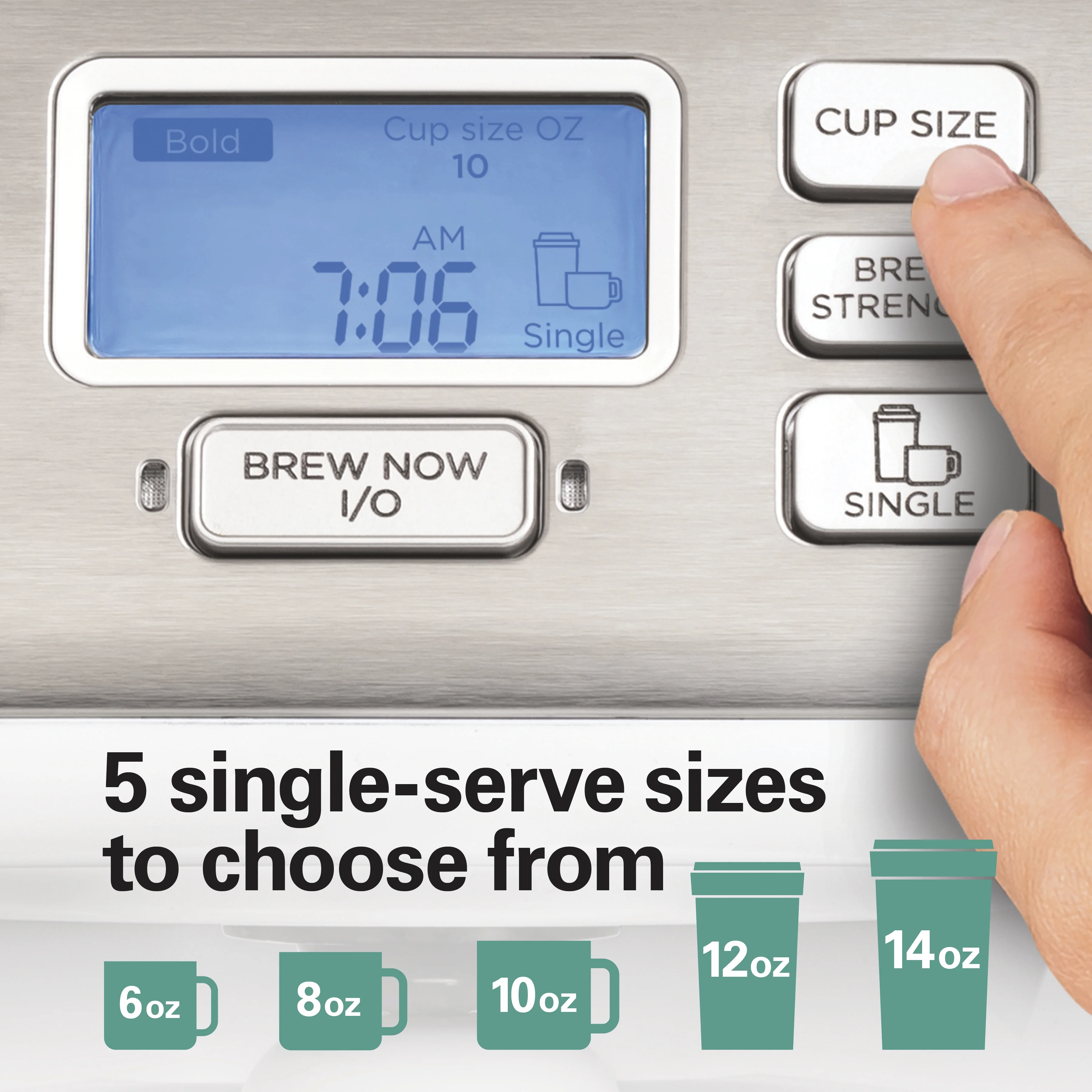 - 3 WAYS TO BREW: Brew a cup with a pod or coffee grounds or brew up to 12 cups using your favorite ground coffee. To brew one cup, you have the option of brewing up to a 10 oz. cup with a pod or brewing into 14 oz., 7" tall travel mug with coffee grounds.