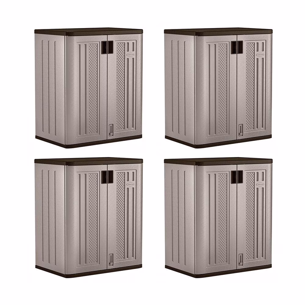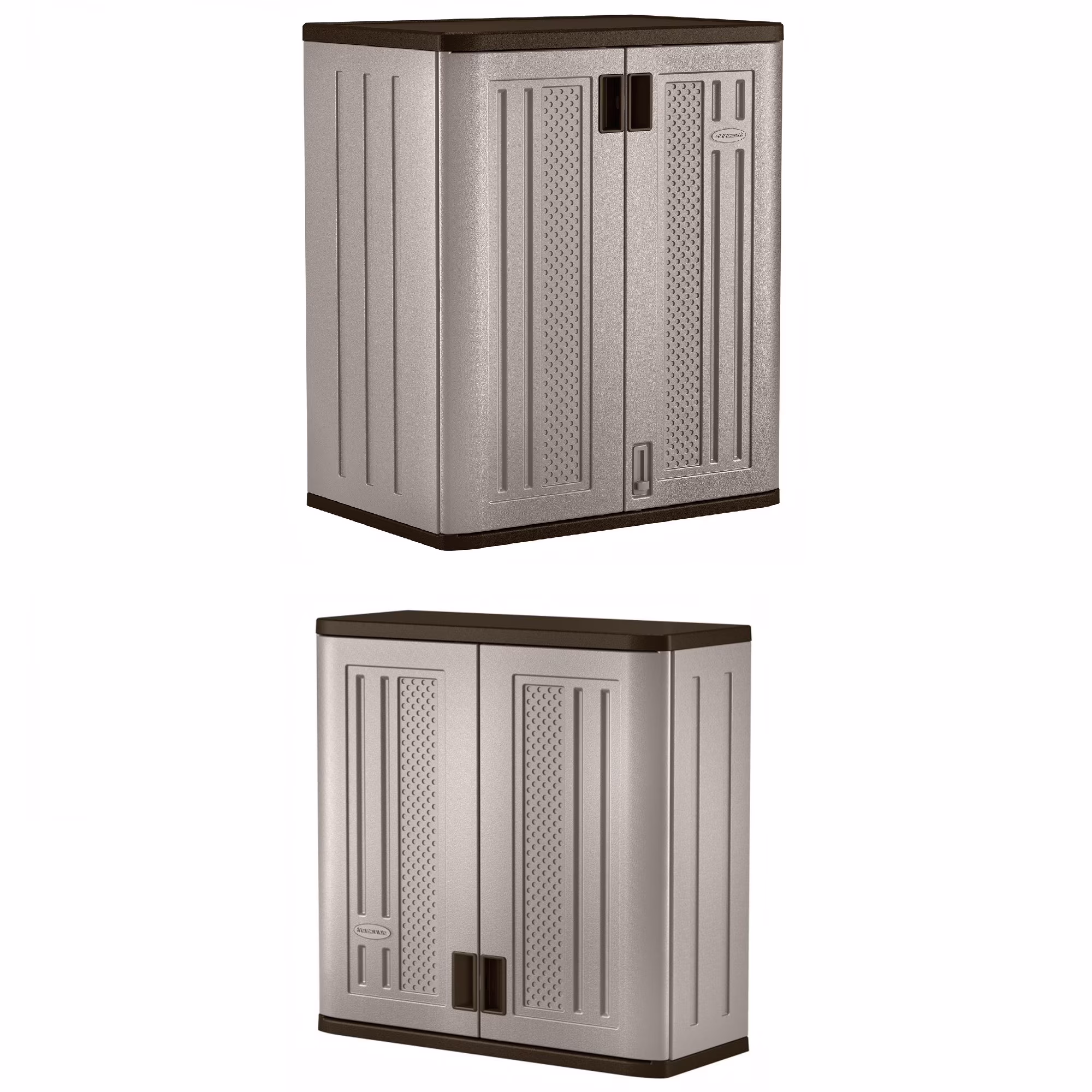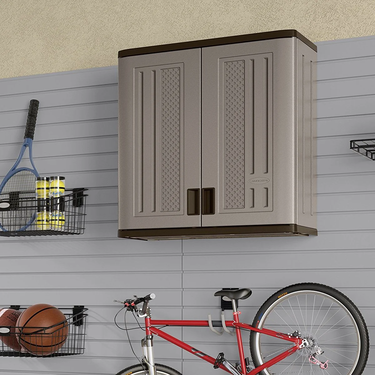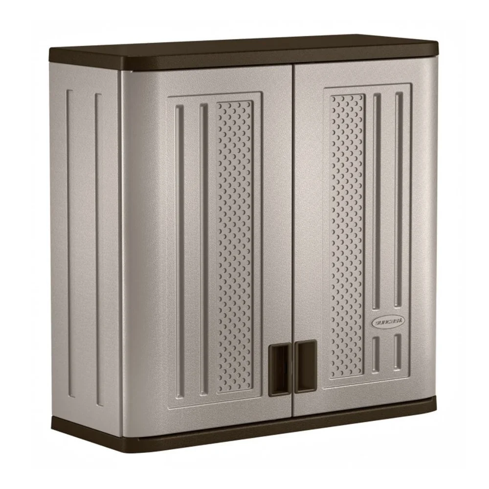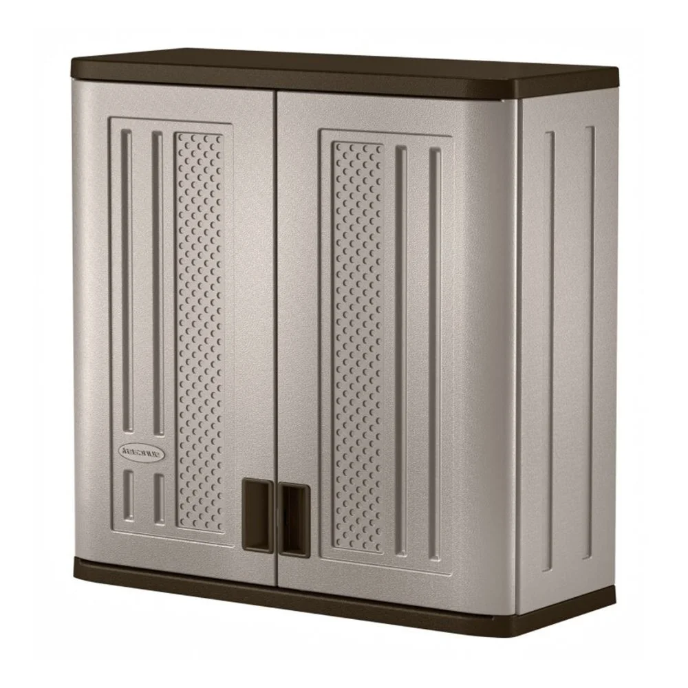 - Platinum storage cabinet that fits into the corner of a garage, creating an attractive space