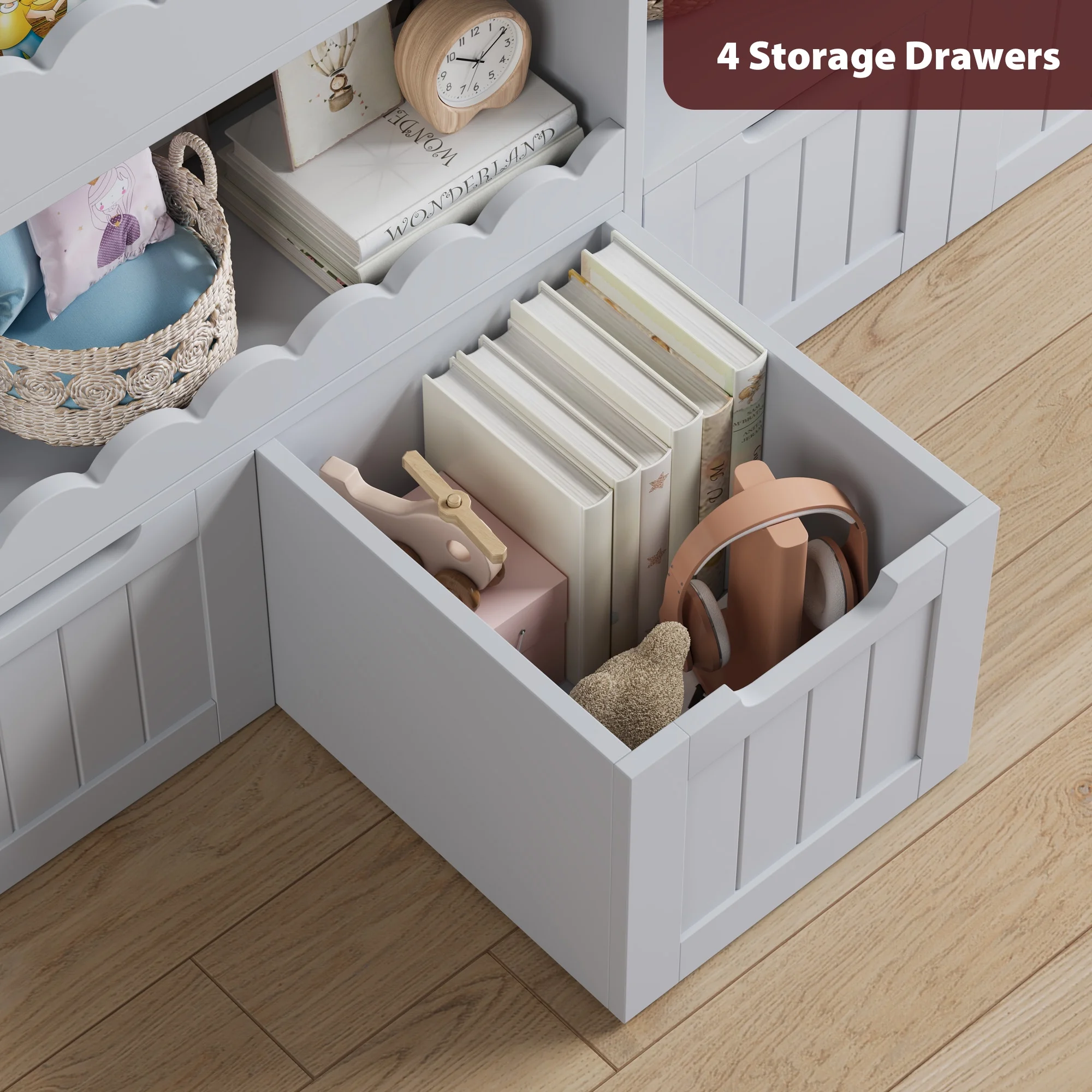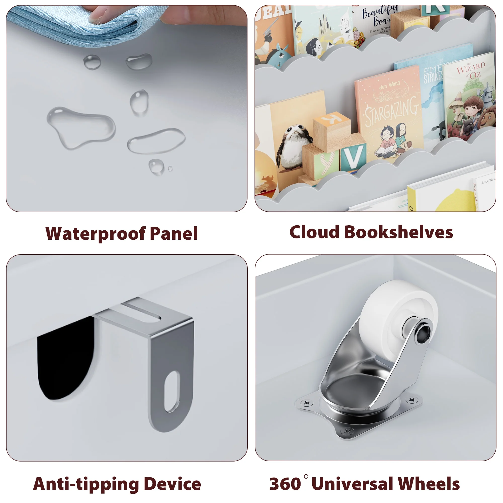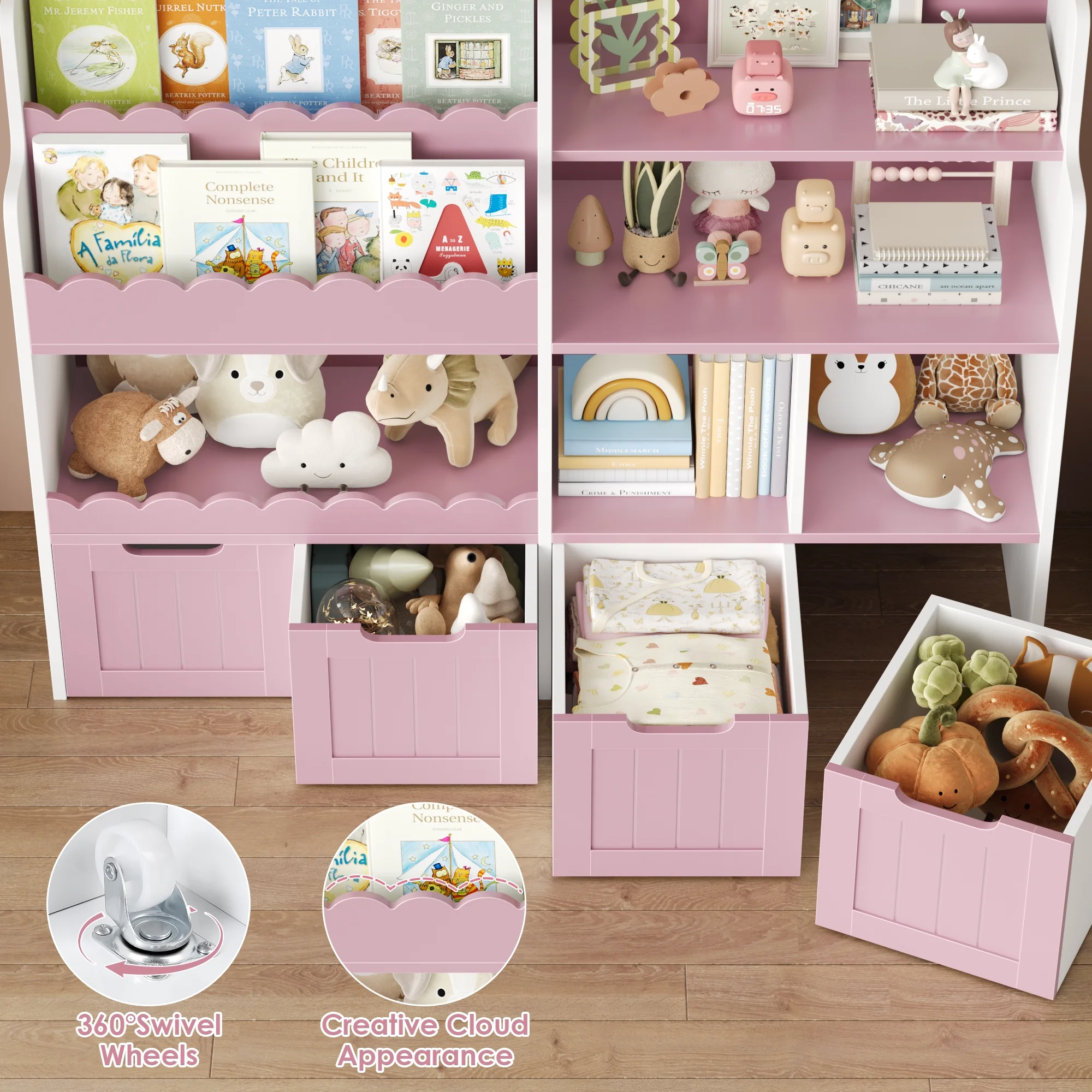 Spacious Storage: Hiphuta kids bookcase contains 3-tier book rack,6 storage compartments and 4 movable drawers with 360 degree swivel wheels. Different sized compartments and drawers can be flexibly placed according to the size of the items, making it easier for children to organize and find them independently.
