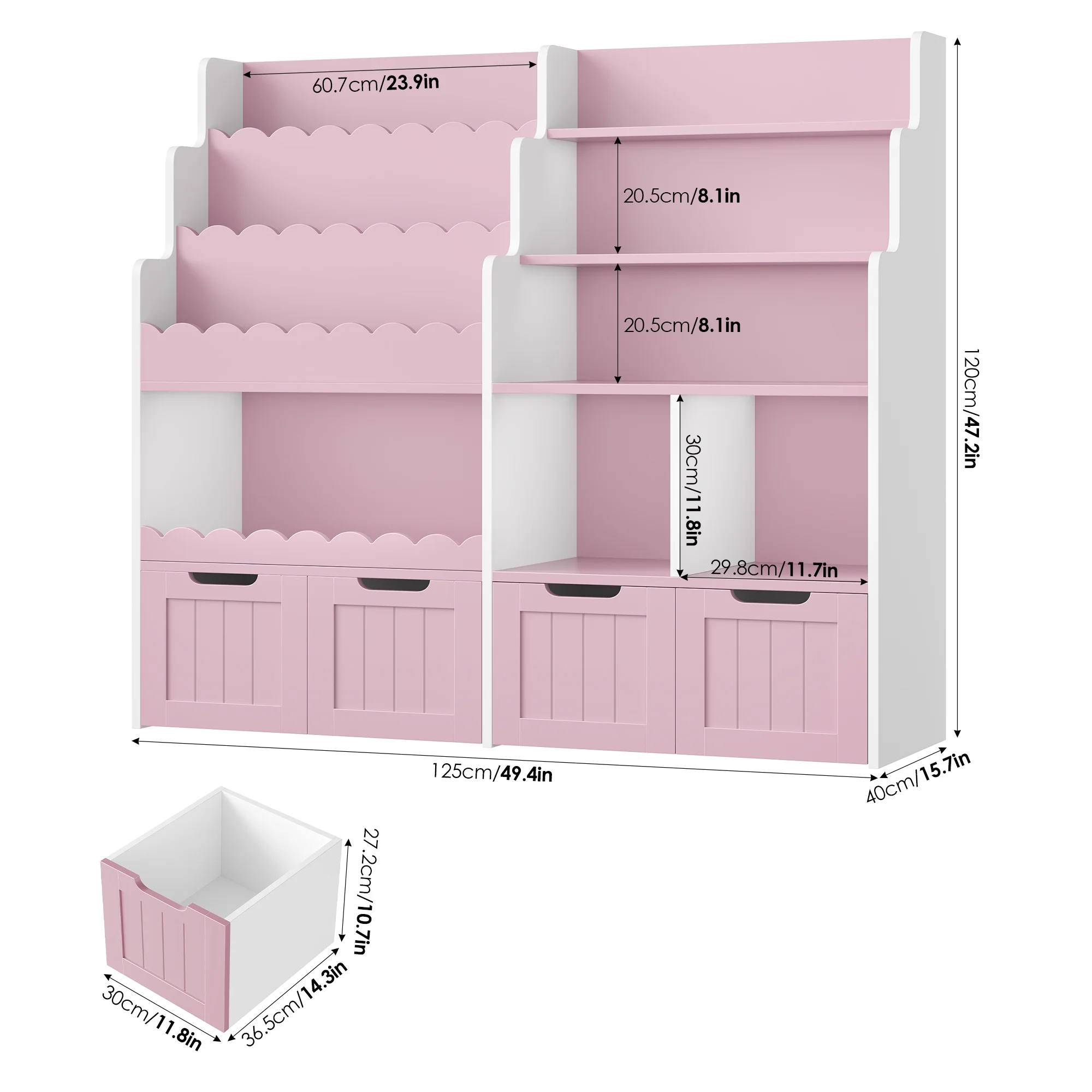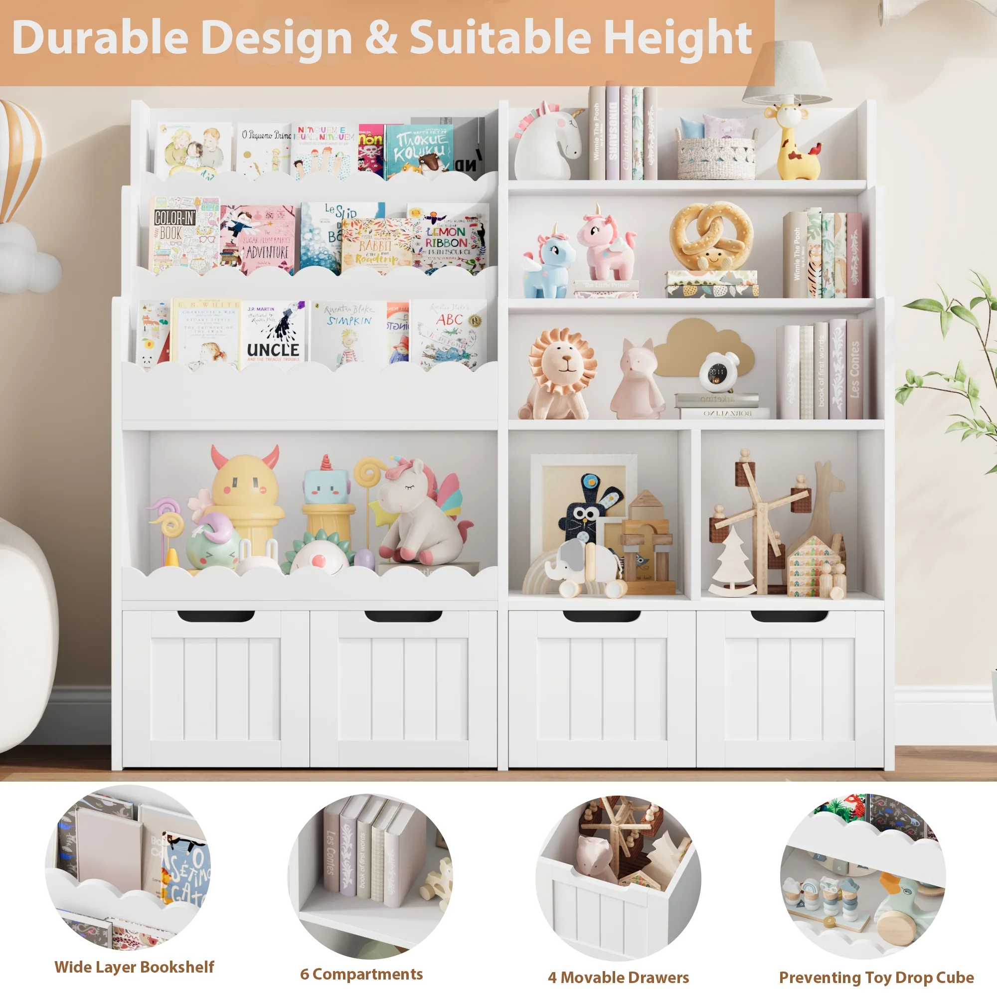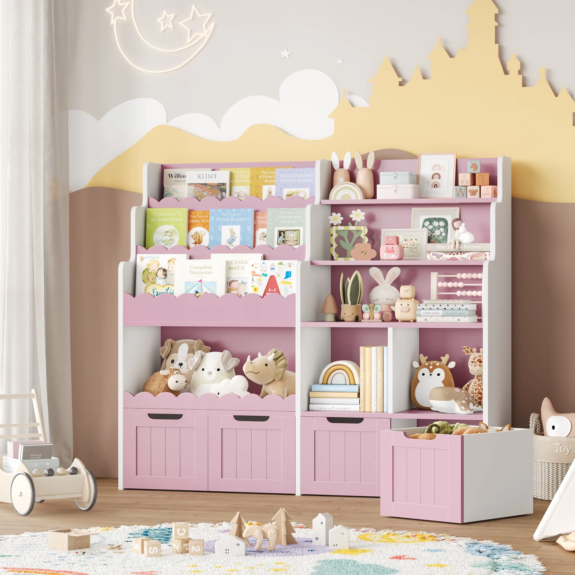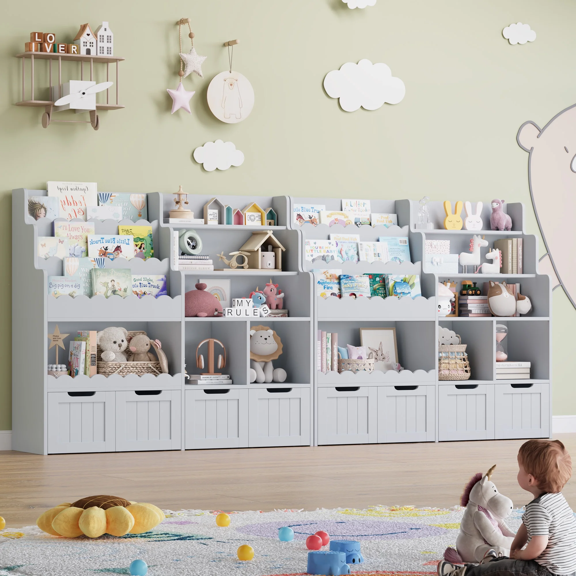Spacious Storage: Hiphuta kids bookcase contains 3-tier book rack,6 storage compartments and 4 movable drawers with 360 degree swivel wheels. Different sized compartments and drawers can be flexibly placed according to the size of the items, making it easier for children to organize and find them independently.