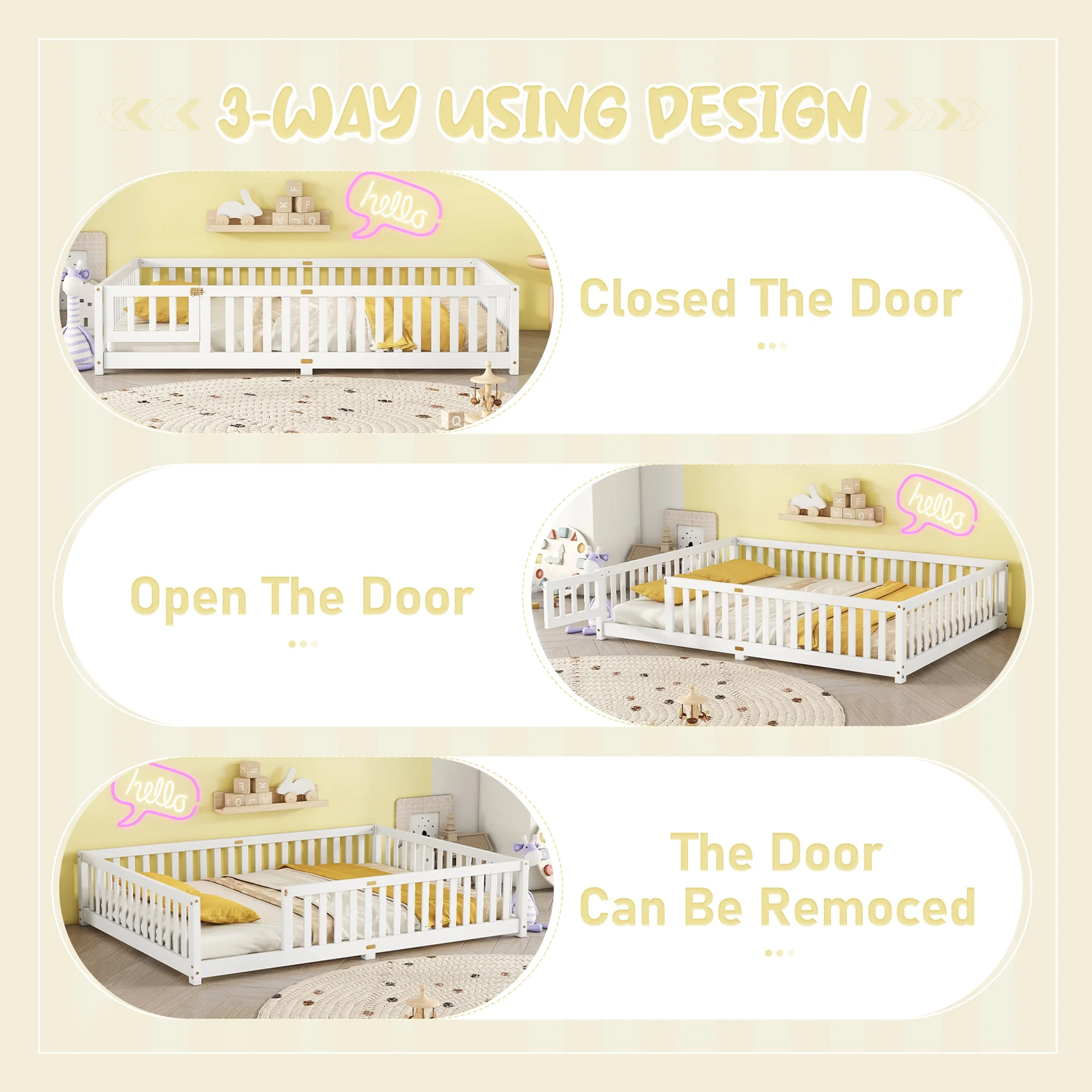 - [Switched Design for the Door]-There is a small door attached can be opened and closed, which increases the interest of the twin floor bed and creates a more safety sleeping space. The door can be taken off if no need to meet meet different requirements.