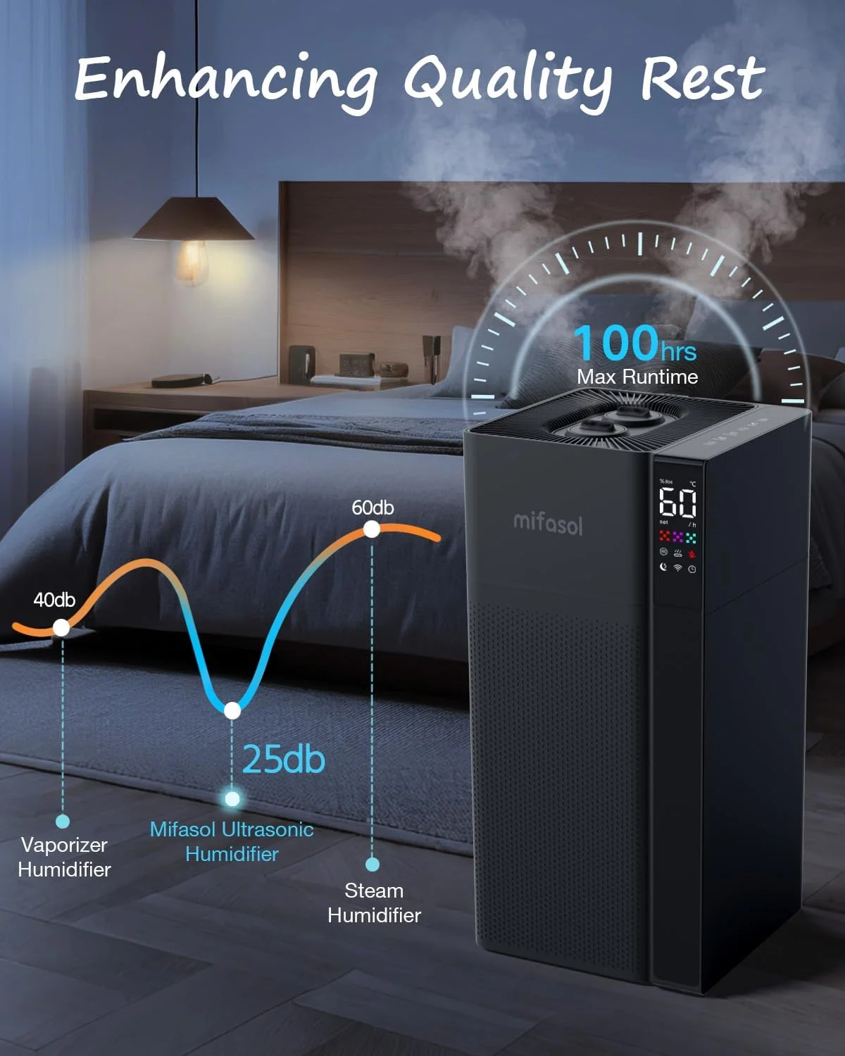 - Adjust your environment with three humidity modes. The built-in humidistat offers the ideal settings for sleep, work, or relaxation, with low, medium, and high mist speeds and a 45%-90% humidity range. Warm mist reaches a comfortable 104��F in just 5 minutes. Additional features include a 1-24 hour timer and a sleep mode for added convenience.