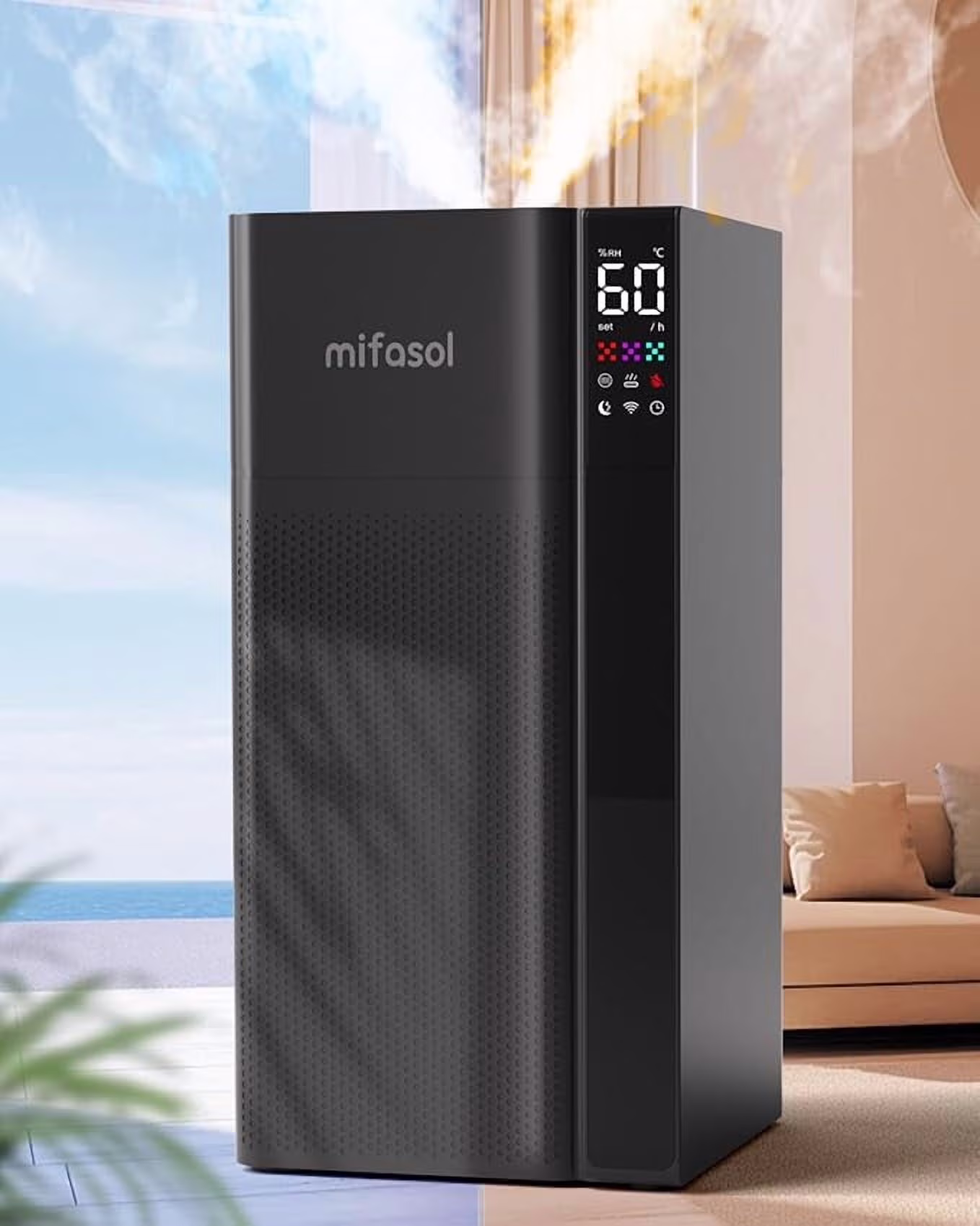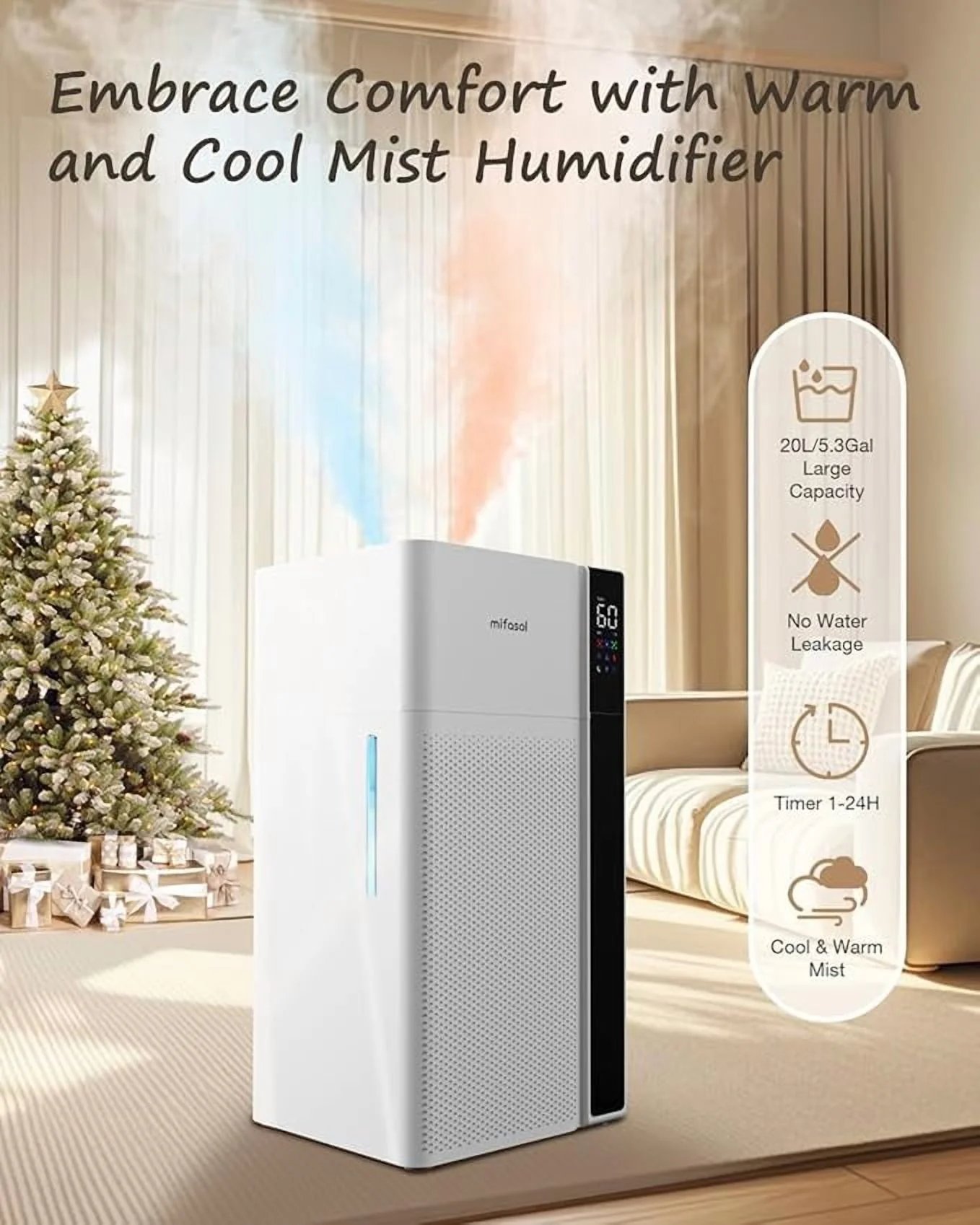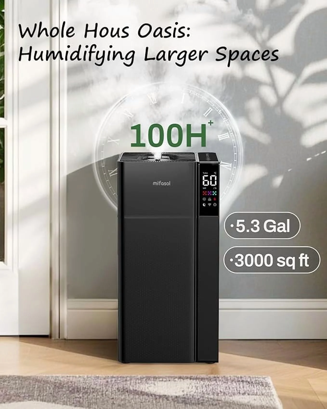 - Transform spaces up to 3000 sq. ft. with our 20L/5.3Gal floor humidifier, ideal for your entire home, large rooms, offices, greenhouses, factories, warehouses, or music rooms. Breathe easy with up to 48 hours of continuous mist, eliminating dry air concerns. Create a peaceful, comfortable environment that everyone��whether family, baby, or pets��will love. Enjoy effortless control with an intuitive LED touch panel and convenient remote access.