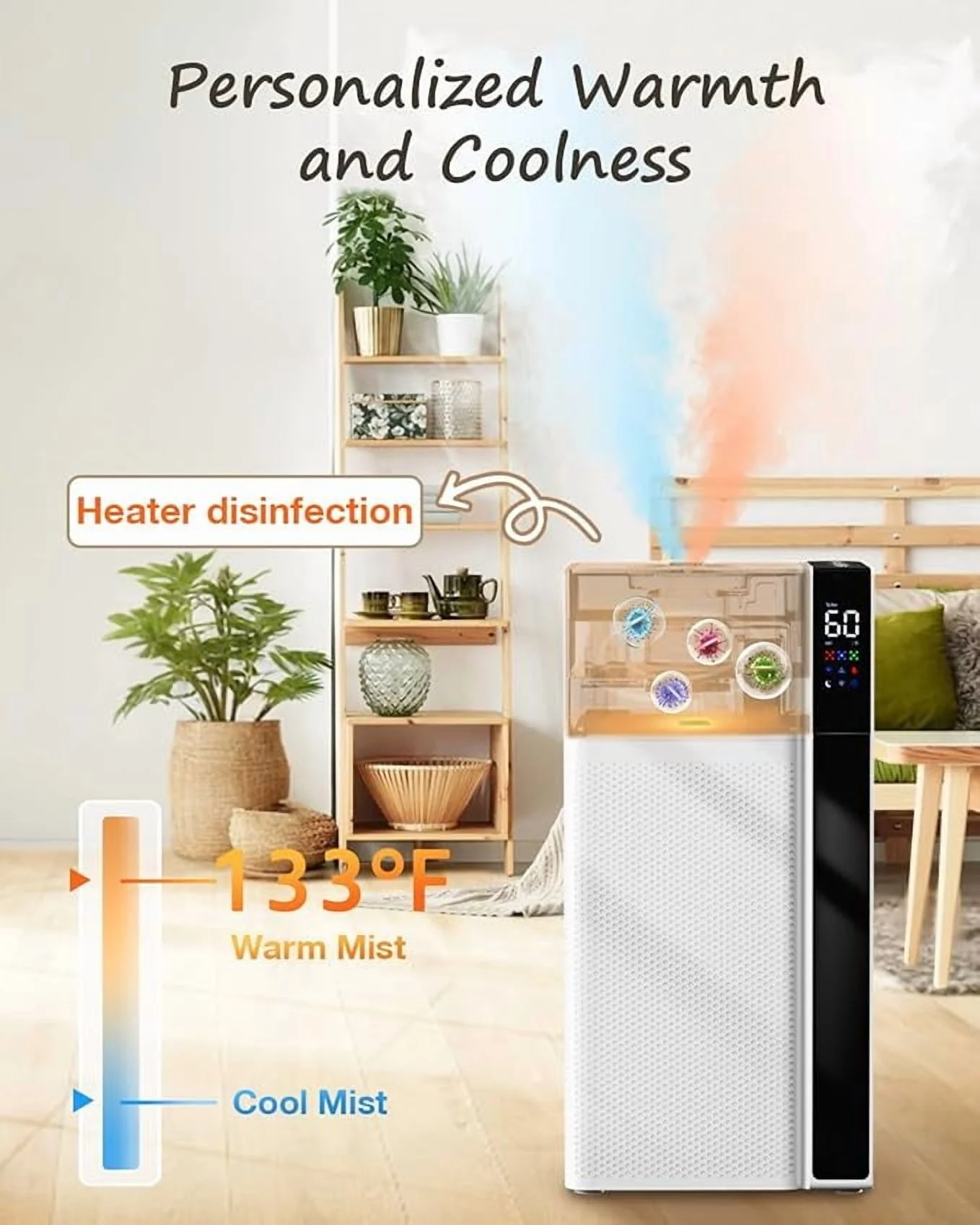 - This 2-in-1 Cool and Warm Mist Humidifier strikes the perfect balance of warmth and refreshment. Choose cool mist to boost humidity without altering room temperature, or opt for warm mist to enjoy a cozy atmosphere while the low-temperature cleaning function kills harmful elements, releasing a safe, refreshing mist. Experience fresher air and customizable comfort with ease.