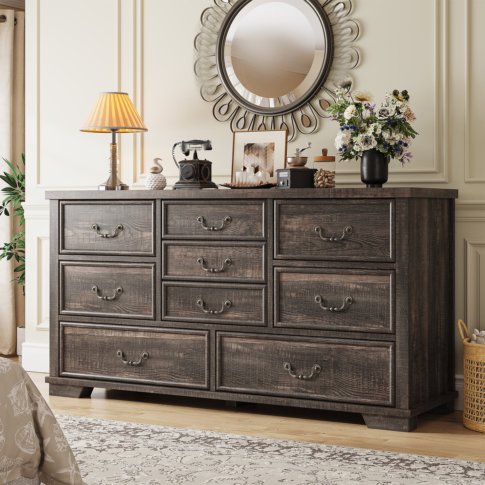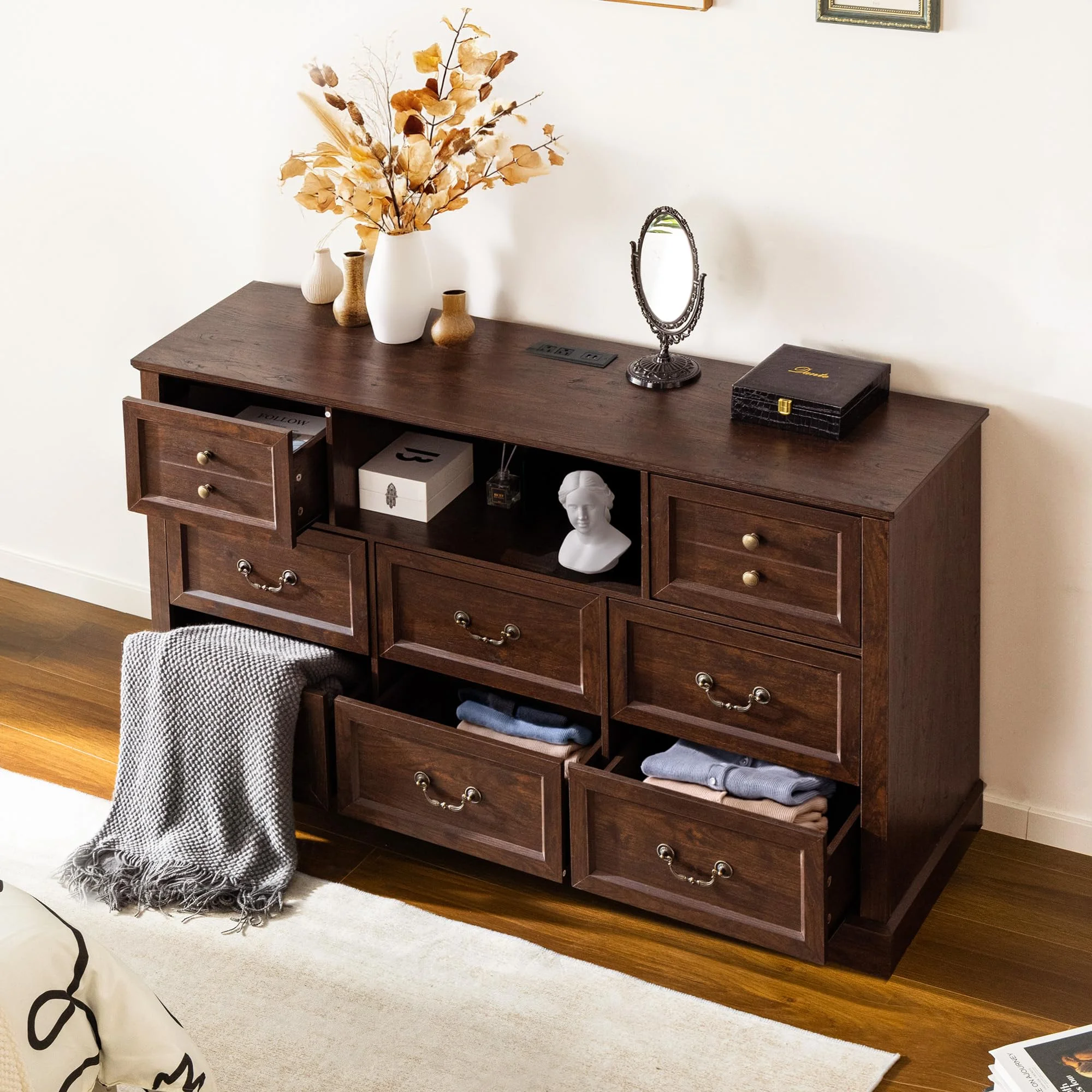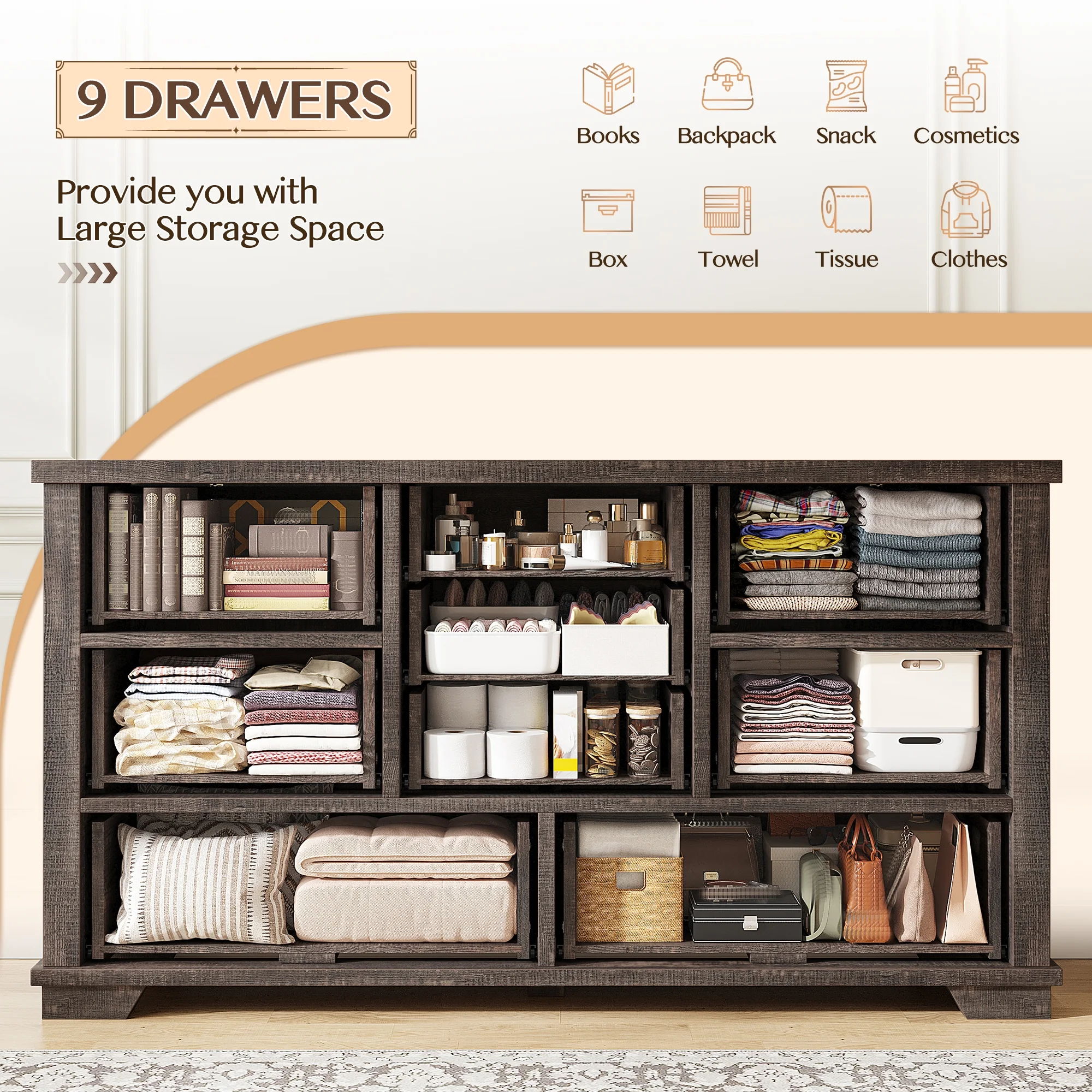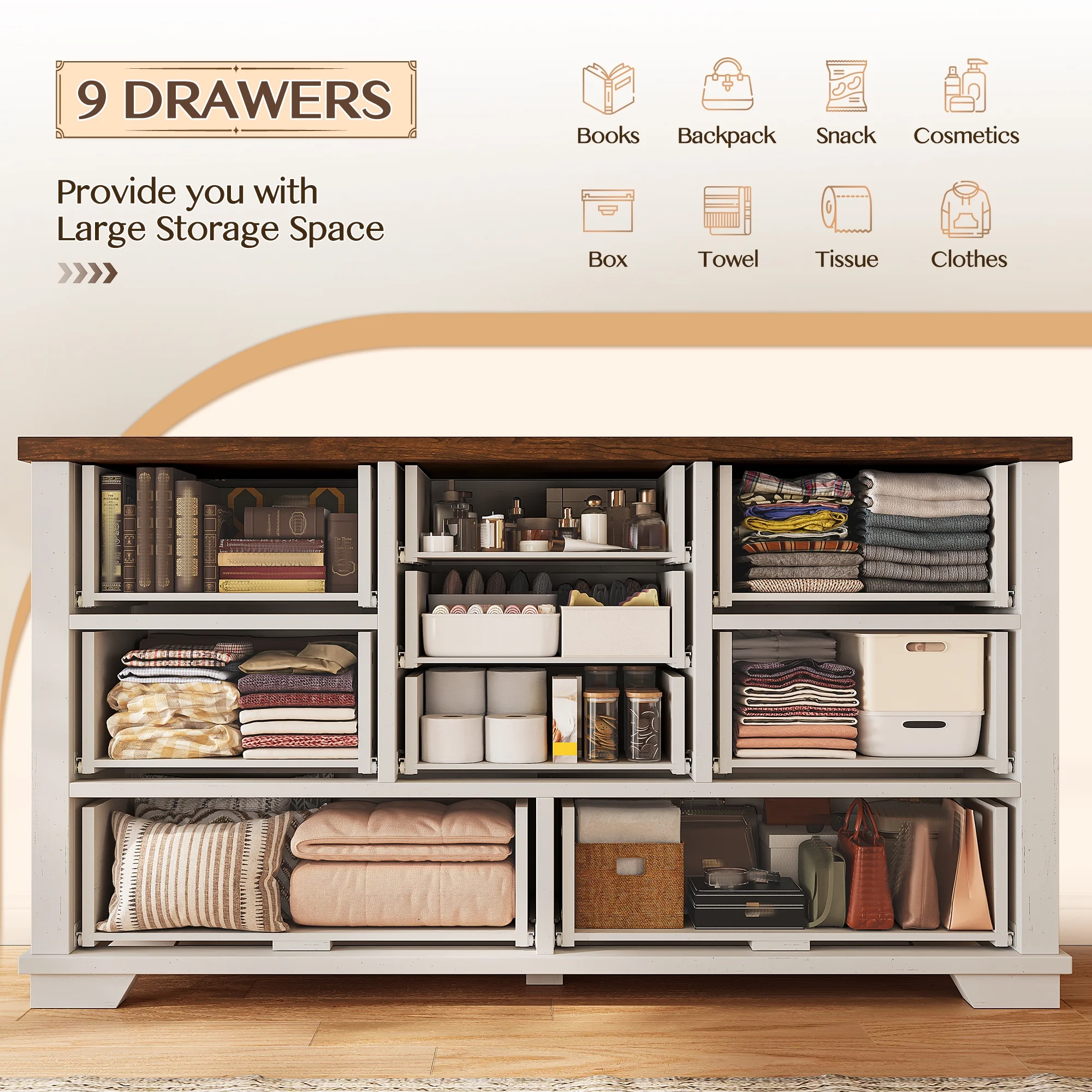 - ???Wooden 9 Drawers Dresser???Differently sized drawers offer the flexibility to neatly store objects of various sizes, from small accessories to larger items, ensuring that everything has a perfect place.