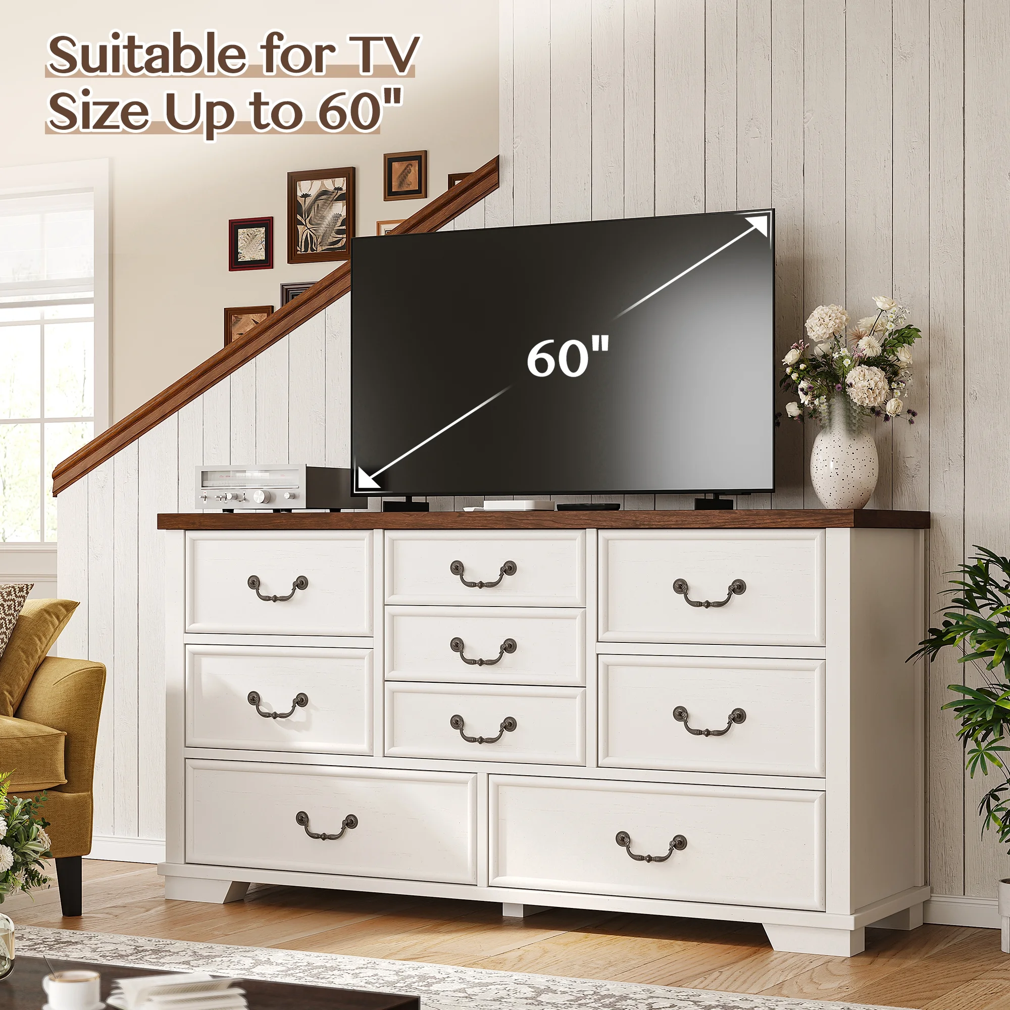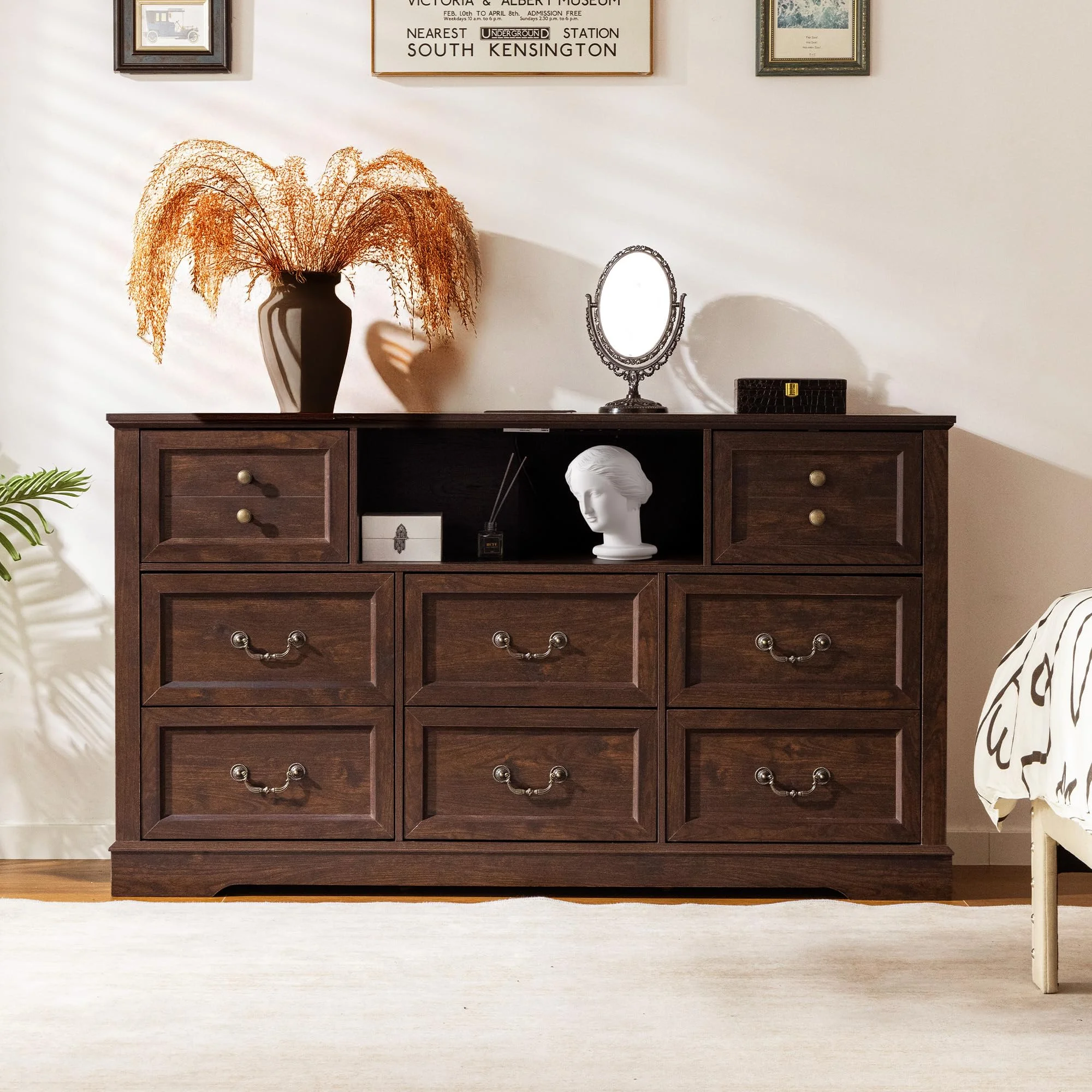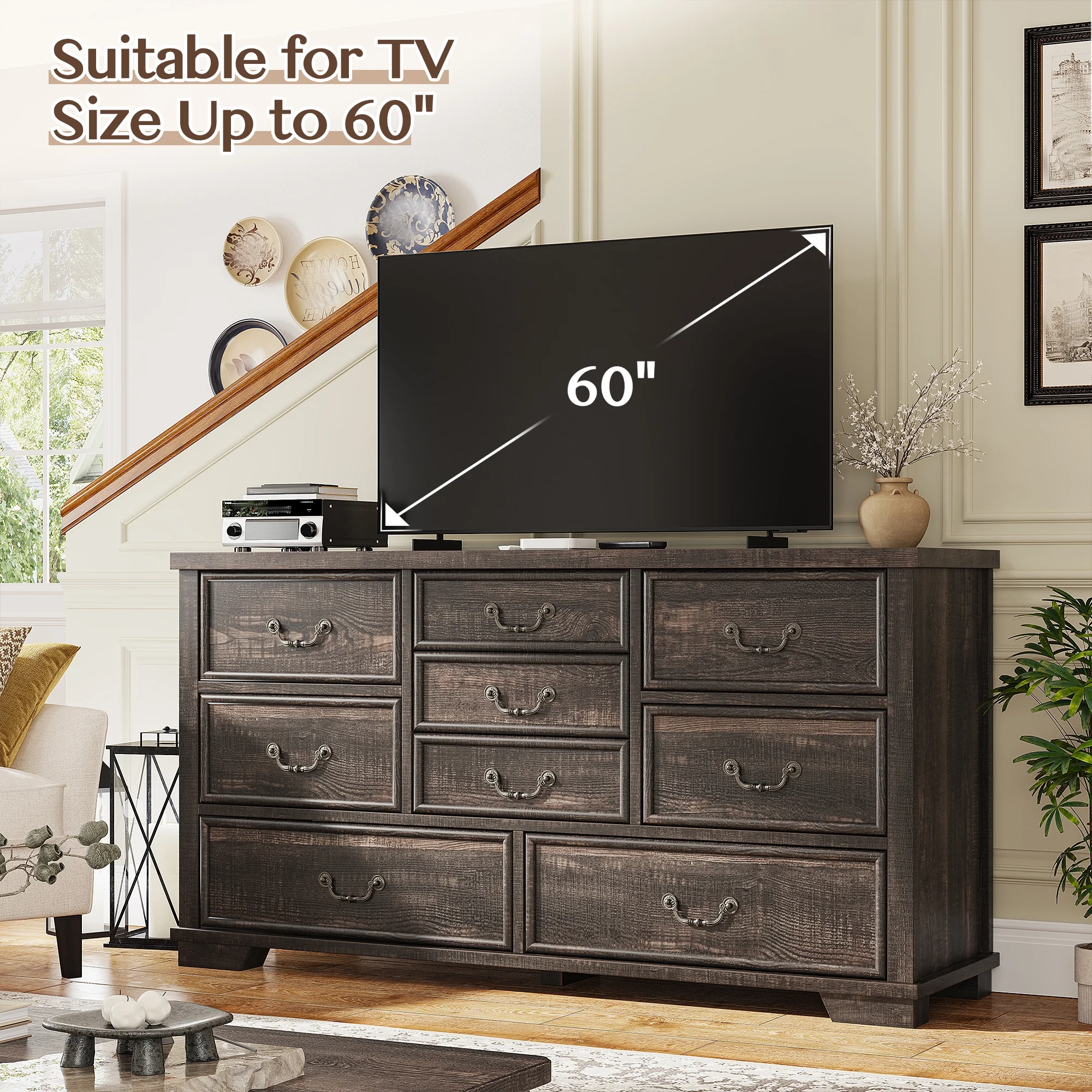 - ???Multi-functional Dresser???This 9-drawer dresser is a versatile piece of furniture suitable for any room. It can serve as a bedroom dresser, an entryway accent cabinet, a hallway organizer, and even function as a TV stand in the living room.
