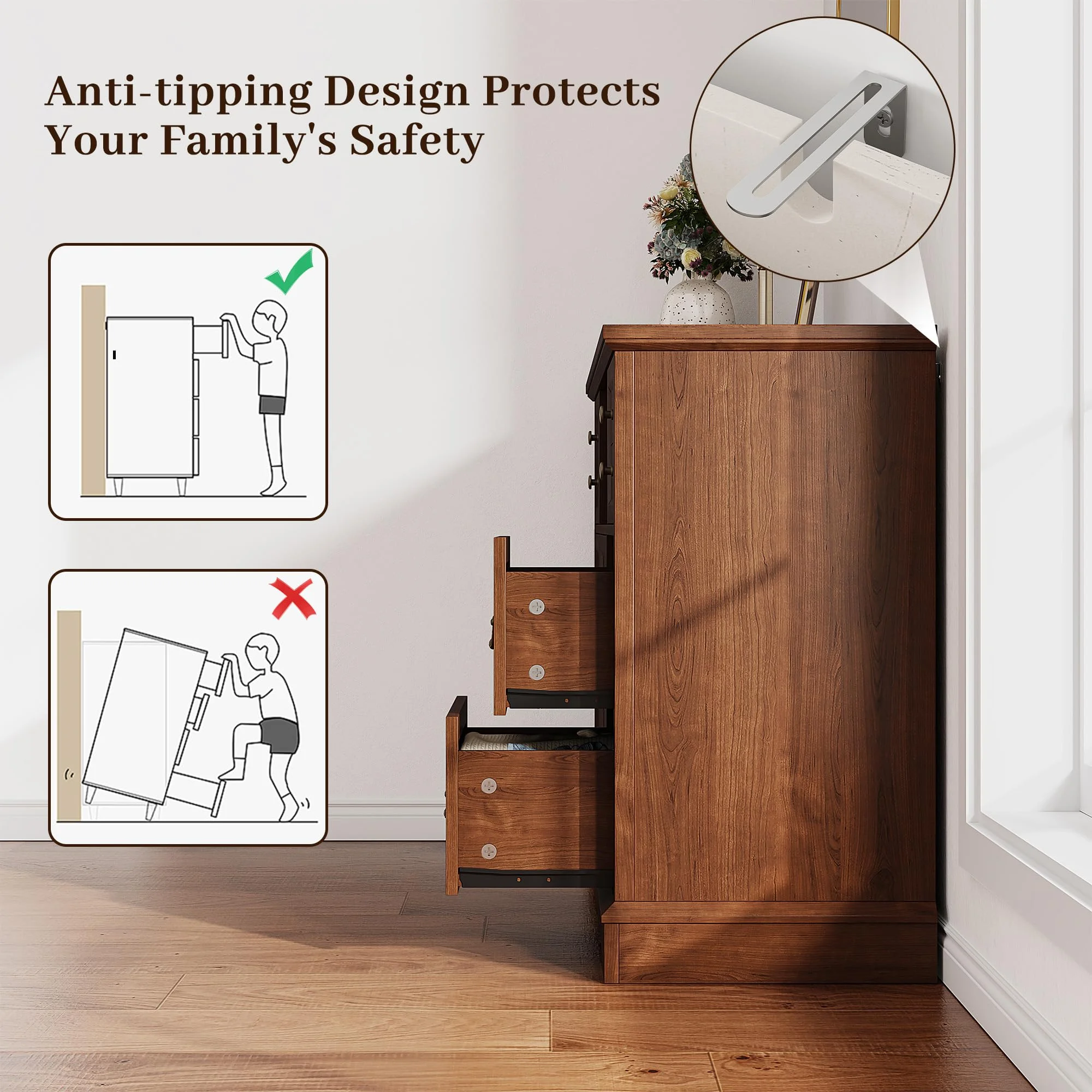 - ???Built to Last, Designed for Stability???Its robust wooden frame ensures long-lasting performance and the anti-tipping device ensures stability,providing you with a reliable storage solution that stands the test of time.