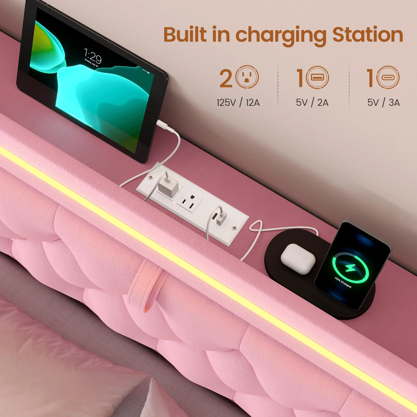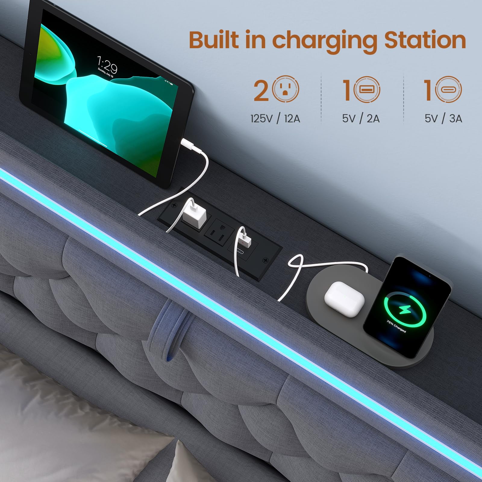 - ???Built-in Outlet???Our storage headboard is tech-savvy with a built-in power outlet. 1 Type-C port, 1 USB-A port and 2 AC outlets caters to a wide range of devices.