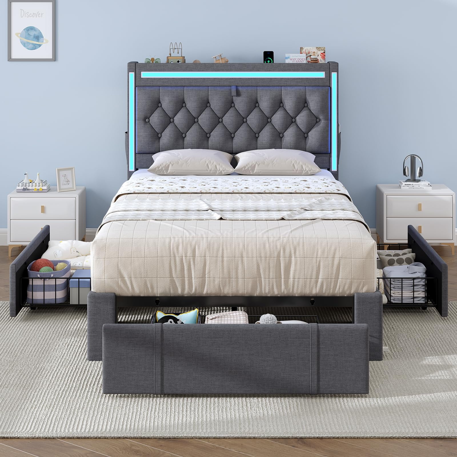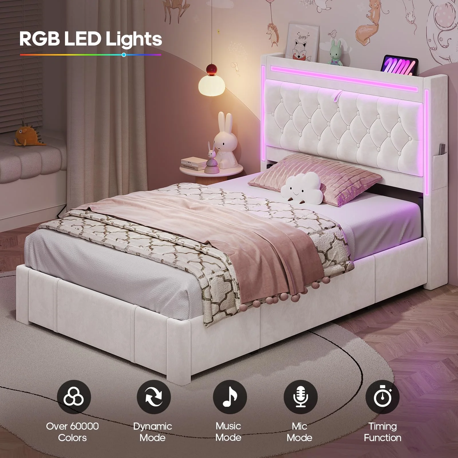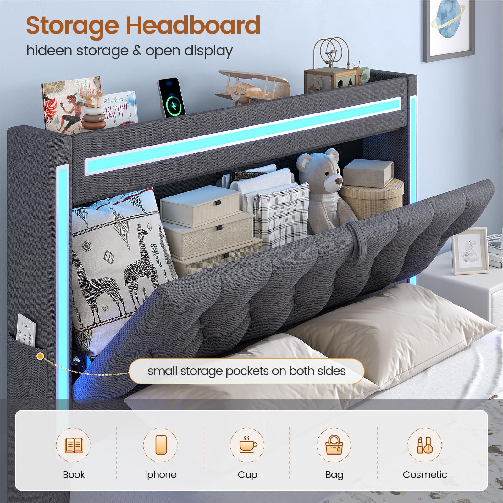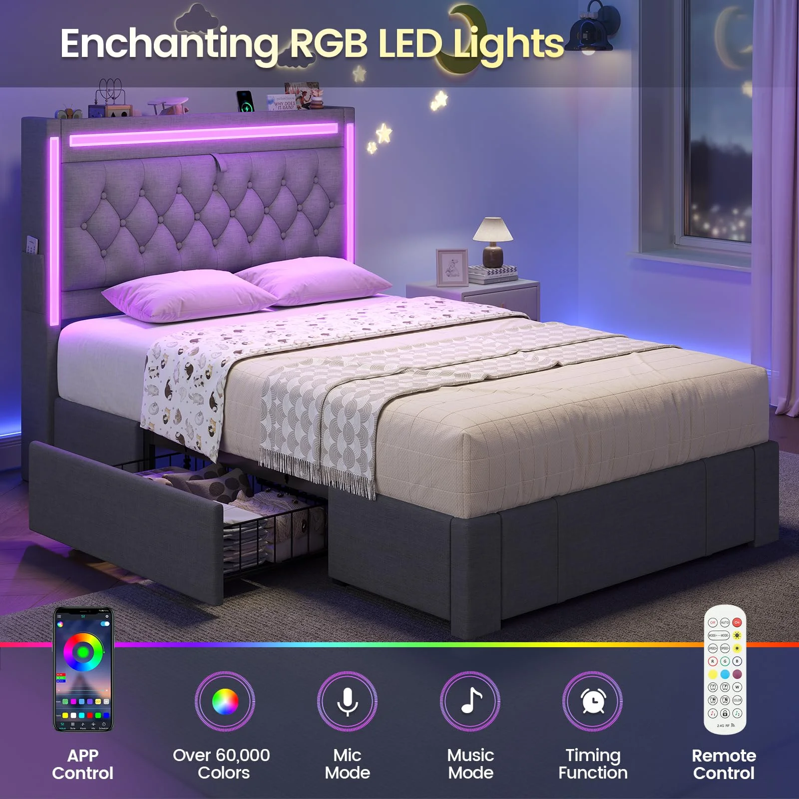 - ???RGB Lighting??? This platform bed frame features three built-in light bars on the storage headboard. Set the mood just how you like it.