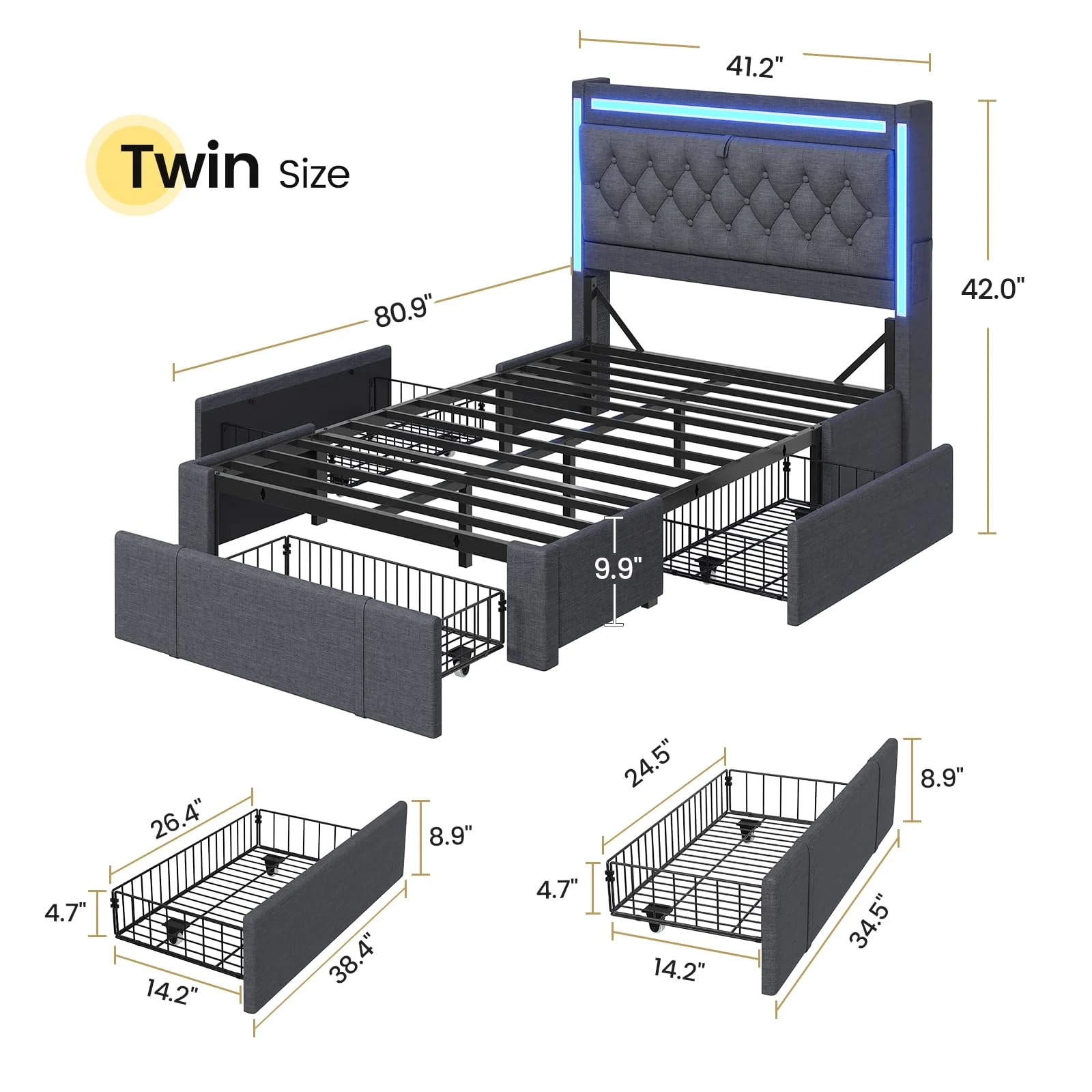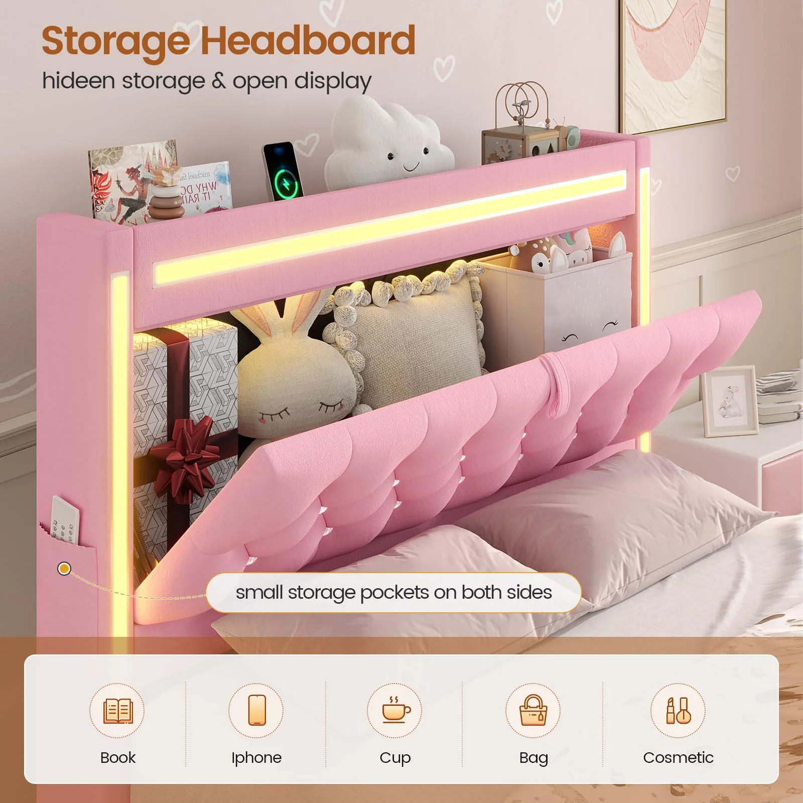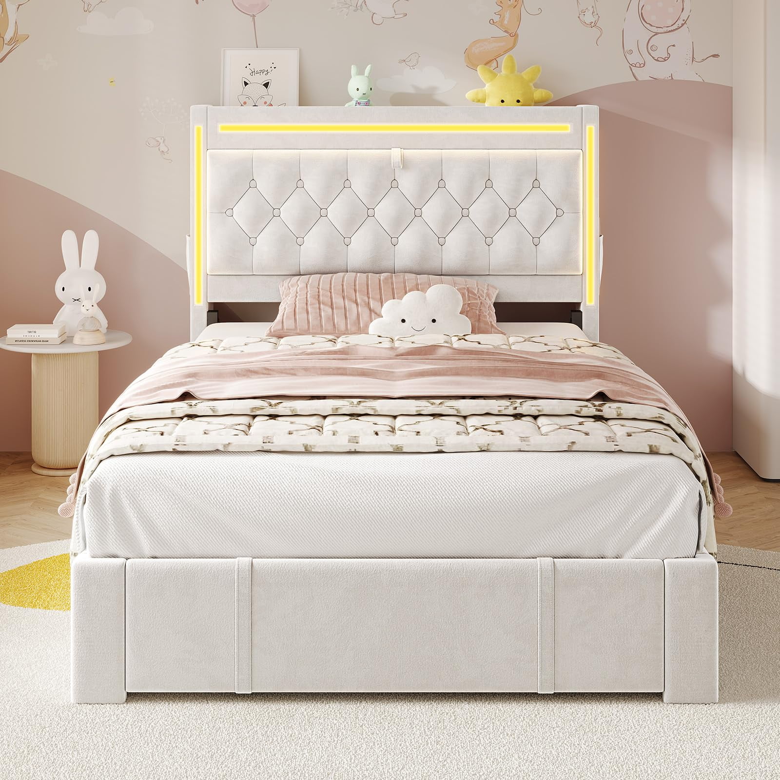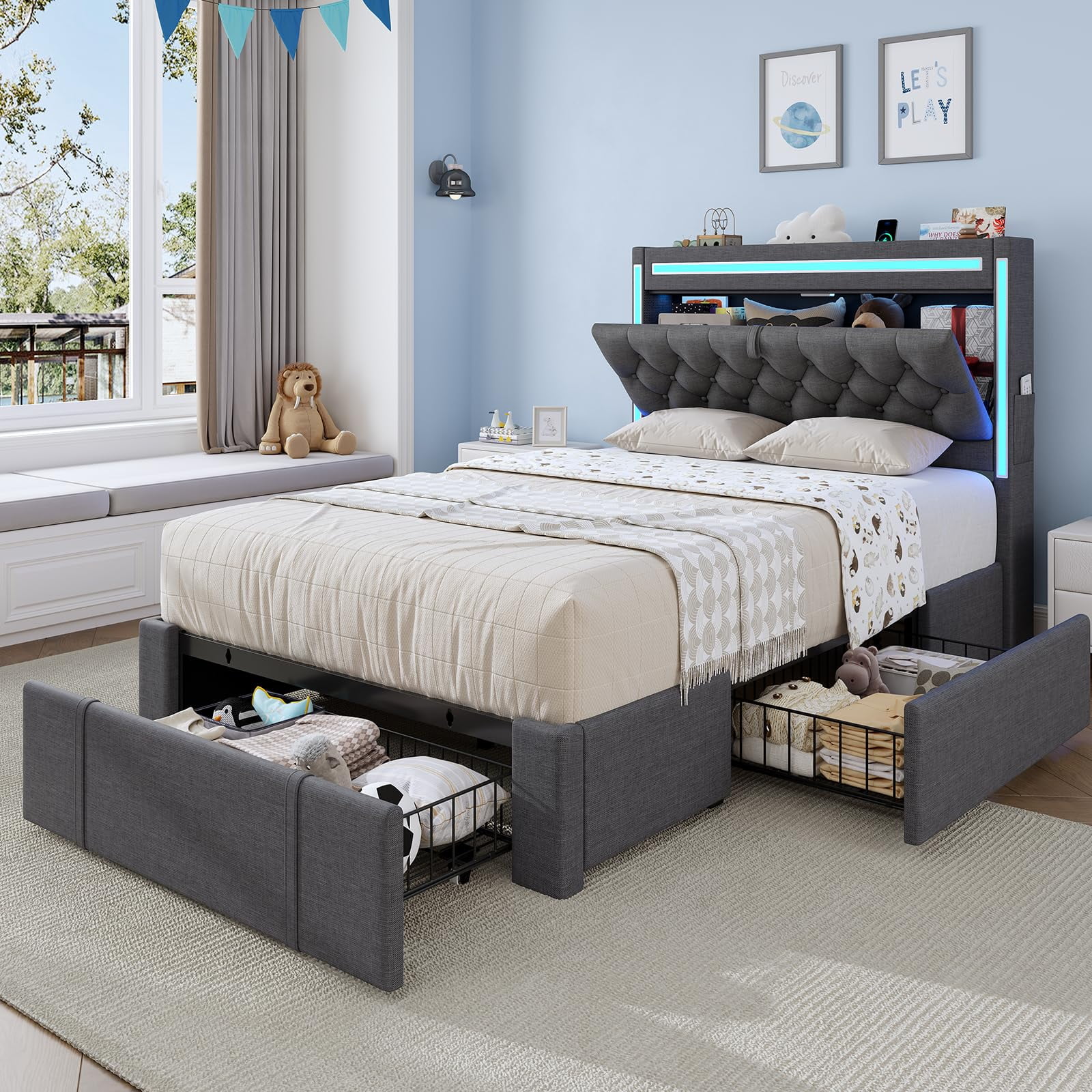- ???RGB Lighting??? This platform bed frame features three built-in light bars on the storage headboard. Set the mood just how you like it.