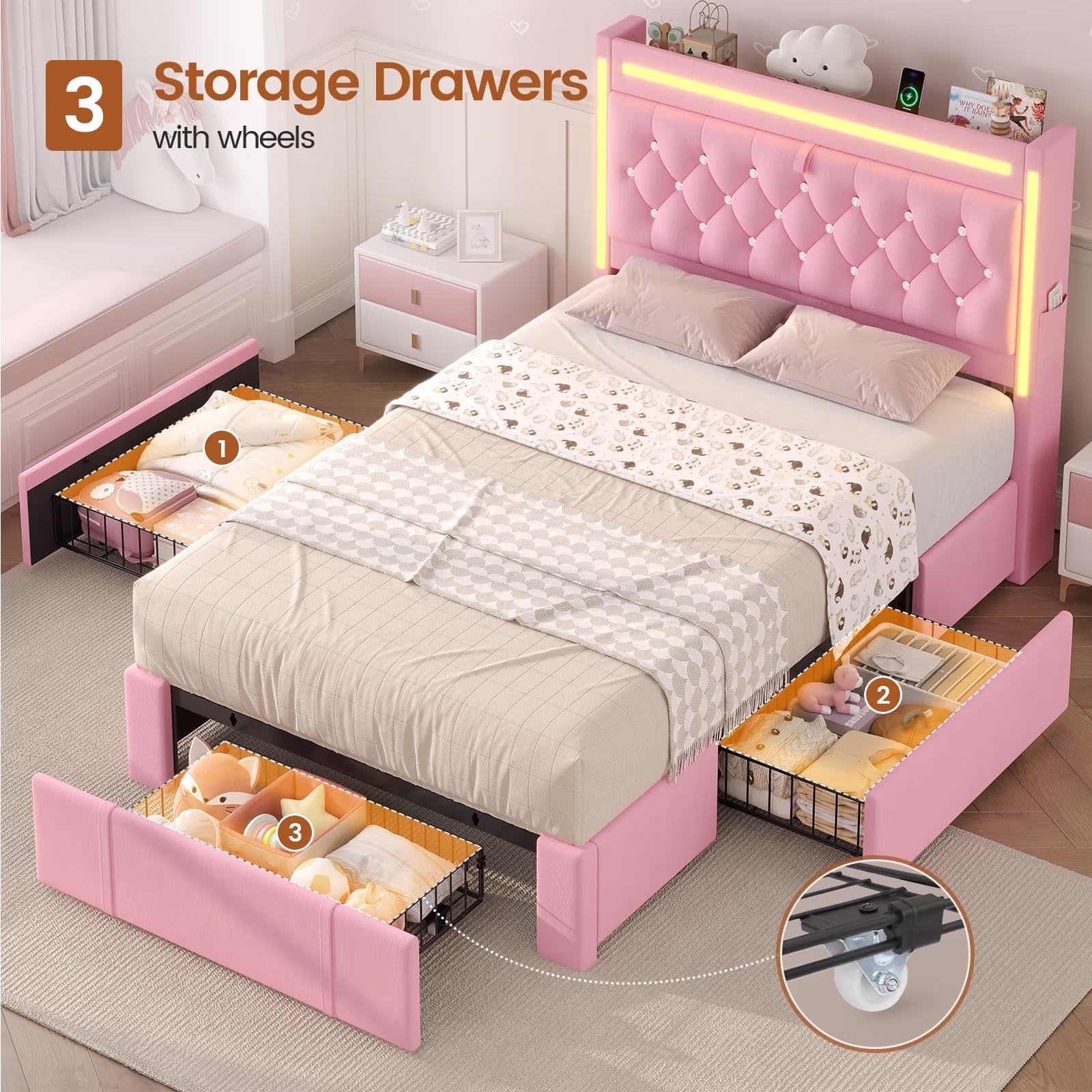 Included Components: Light kit inlcuded, Casters, Headboard, Slat, Drawer