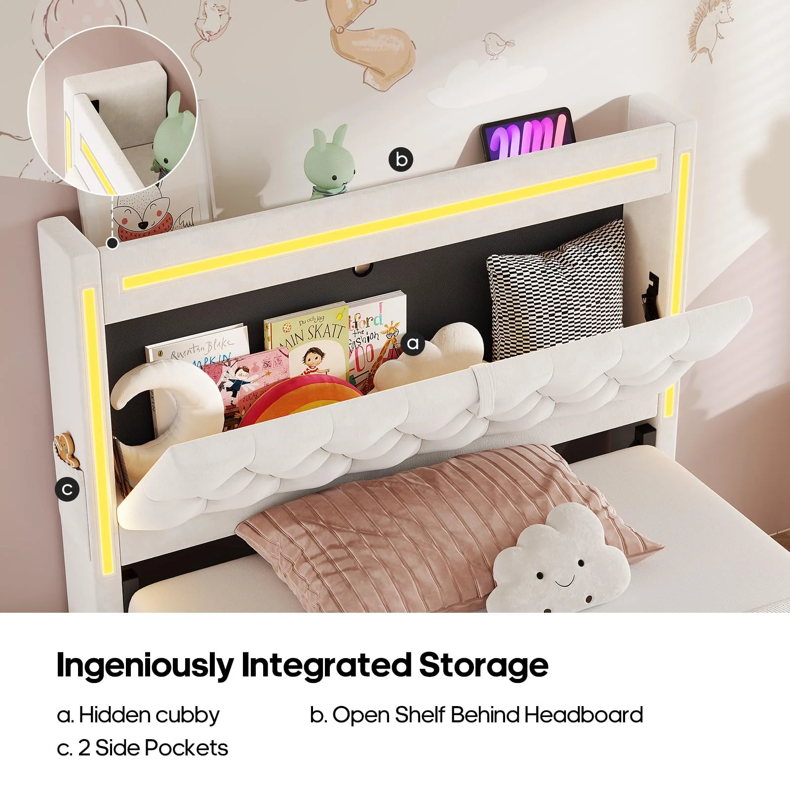 - ???Innovative Design???This bed frame boasts a genius design with a hidden storage cubby, perfect for stashing away your nighttime essentials. The innovative open shelf on the back of the headboard prevents your displays from tumbling onto the bed.