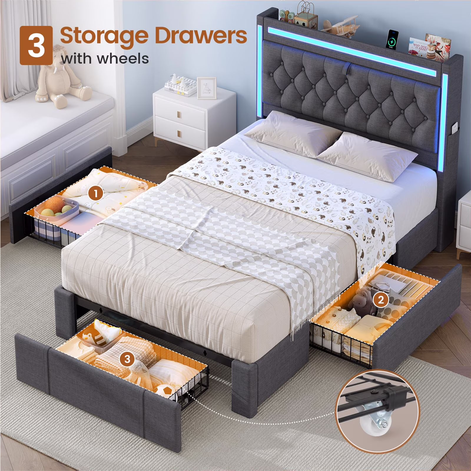 - ???Storage Space???Three extra large caster drawers of this king bed provide all the storage space you need. The drawers roll smoothly in and out, and can be latched to the bed for a clean look, making organizing your space easier than ever