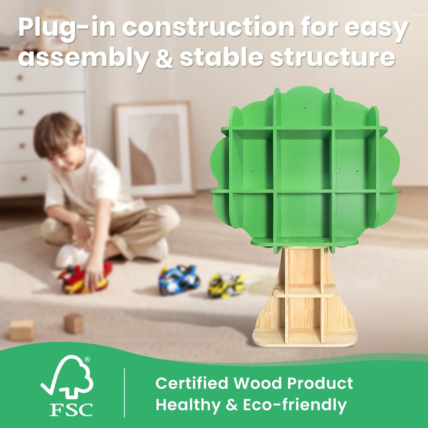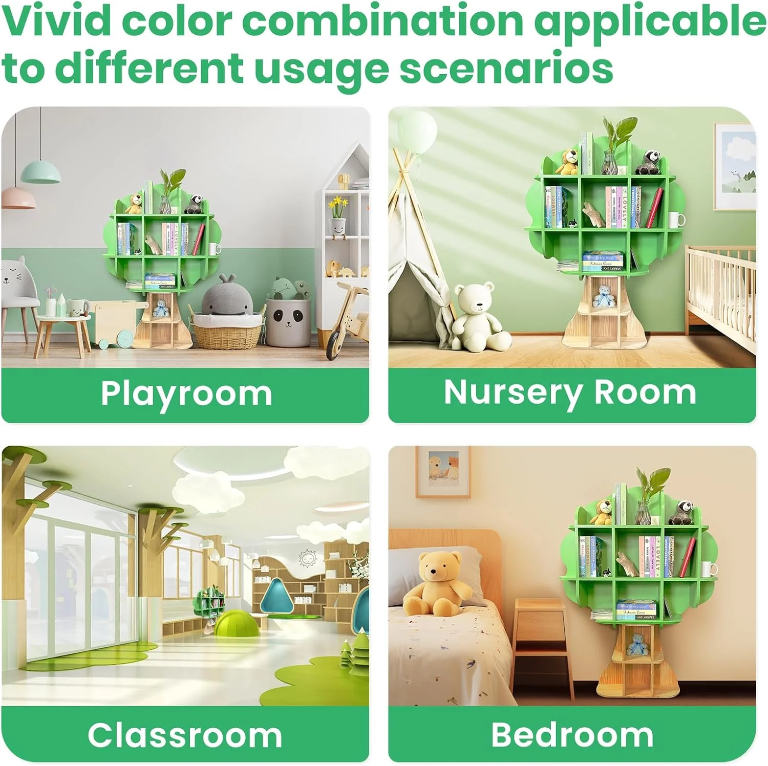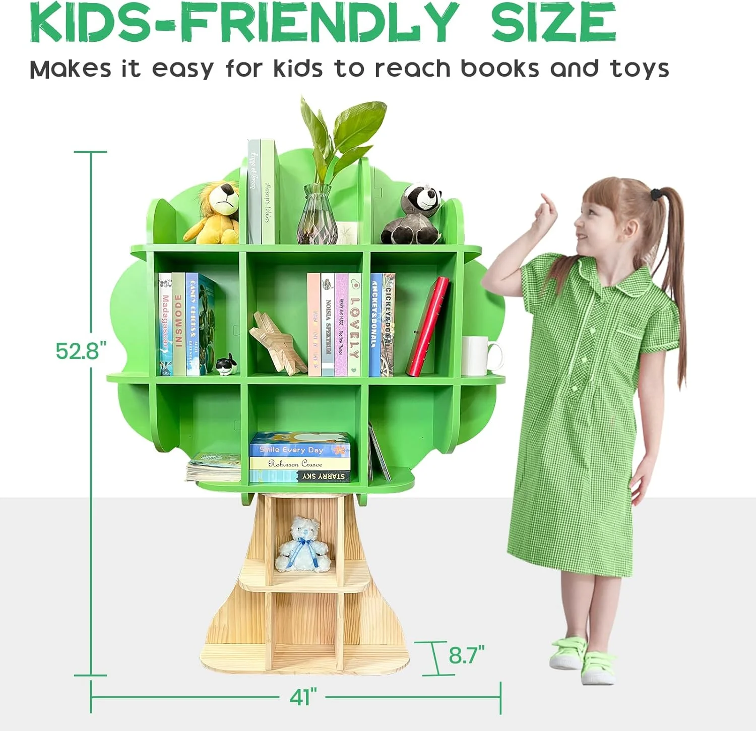 - Room for everything: The kids bookshelf has a tree-like shape and over a dozen storage spaces. This design not only provides ample storage but also enhances the functionality of the bookshelf, making it easy to store children's books and toys.