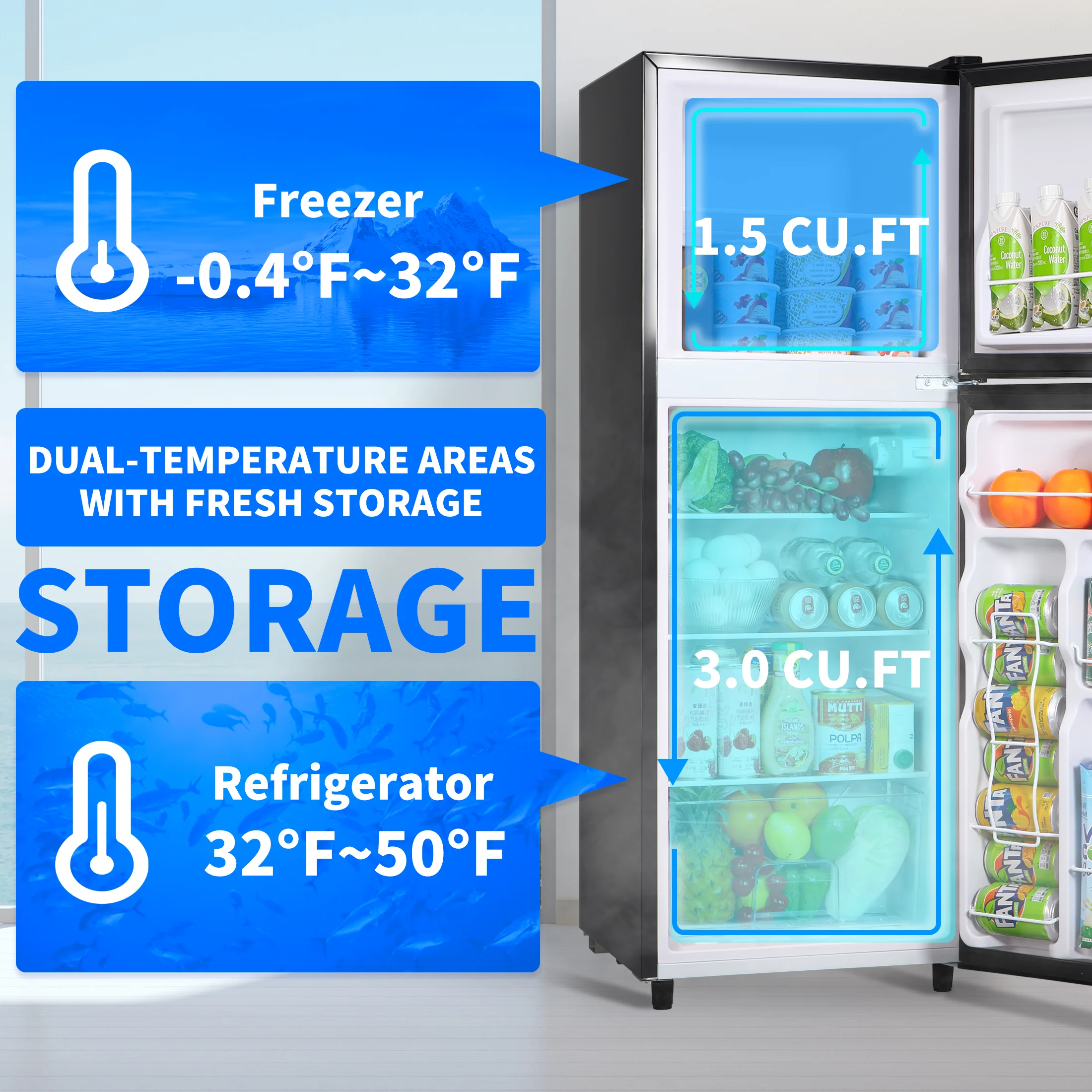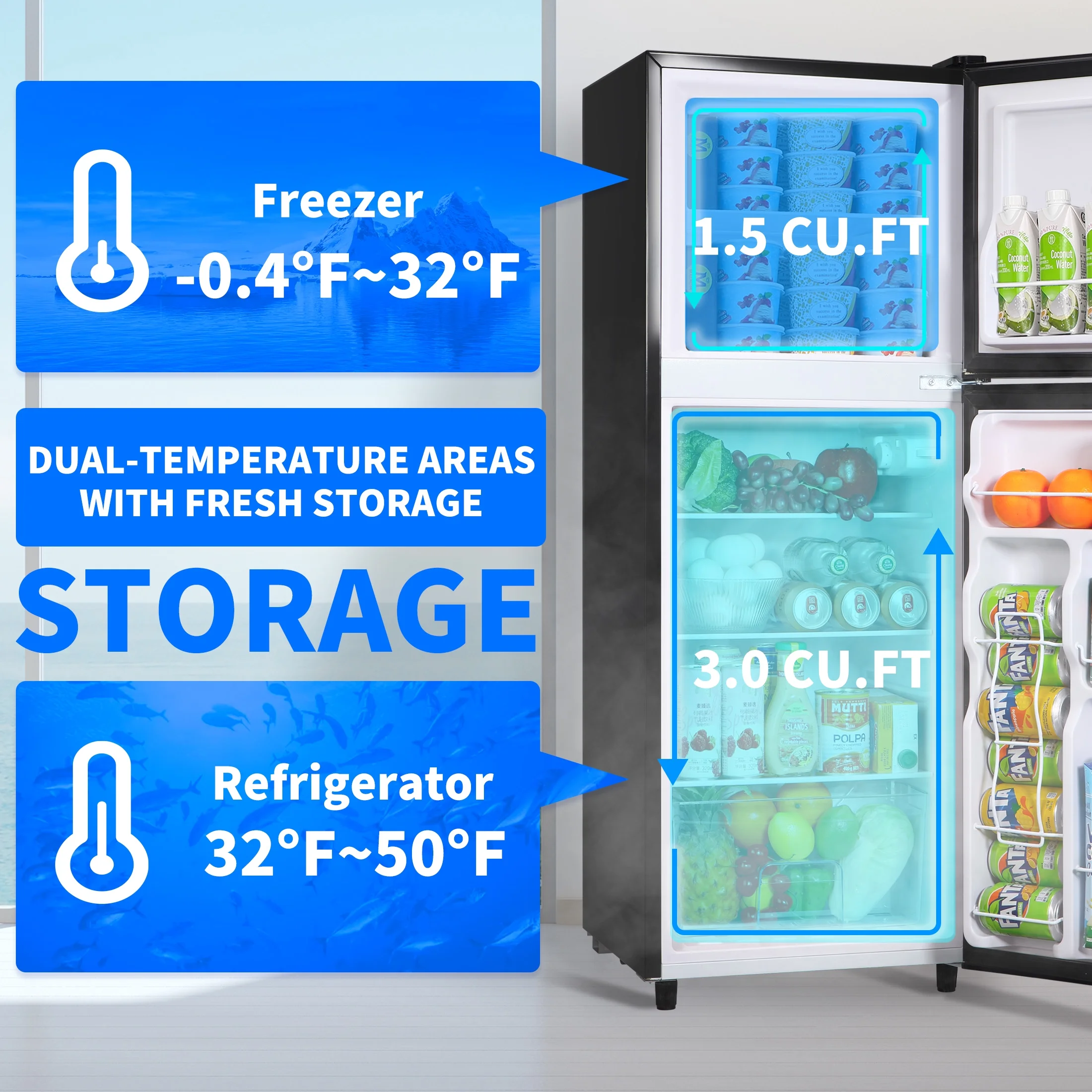 - WANAI mini fridge with freezer combines the advantages of fridge and freezer to design the dorm fridge with freezer 2 door. Mini frdige has two storage zone at the same time. 1.5 Cu.Ft of freezer zone can be used to store ice cream or frozen food. 3.0 Cu.Ft of fridge zone can be used to preserve fresh fruits, vegetables or refrigerated drinks. When you buy a Small fridge it is equivalent to buying a fridge and a freezer at the same time!