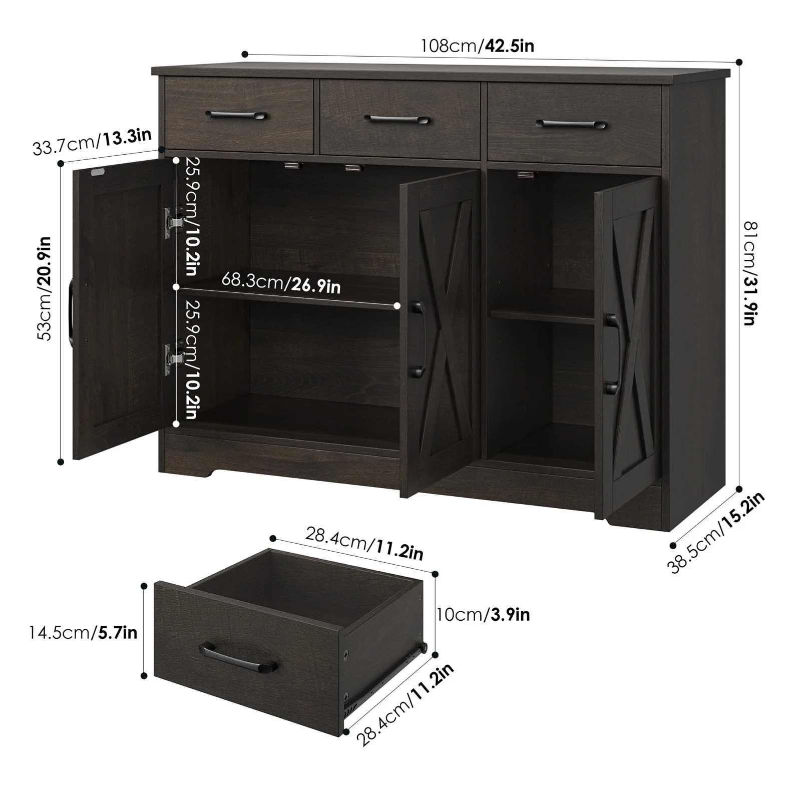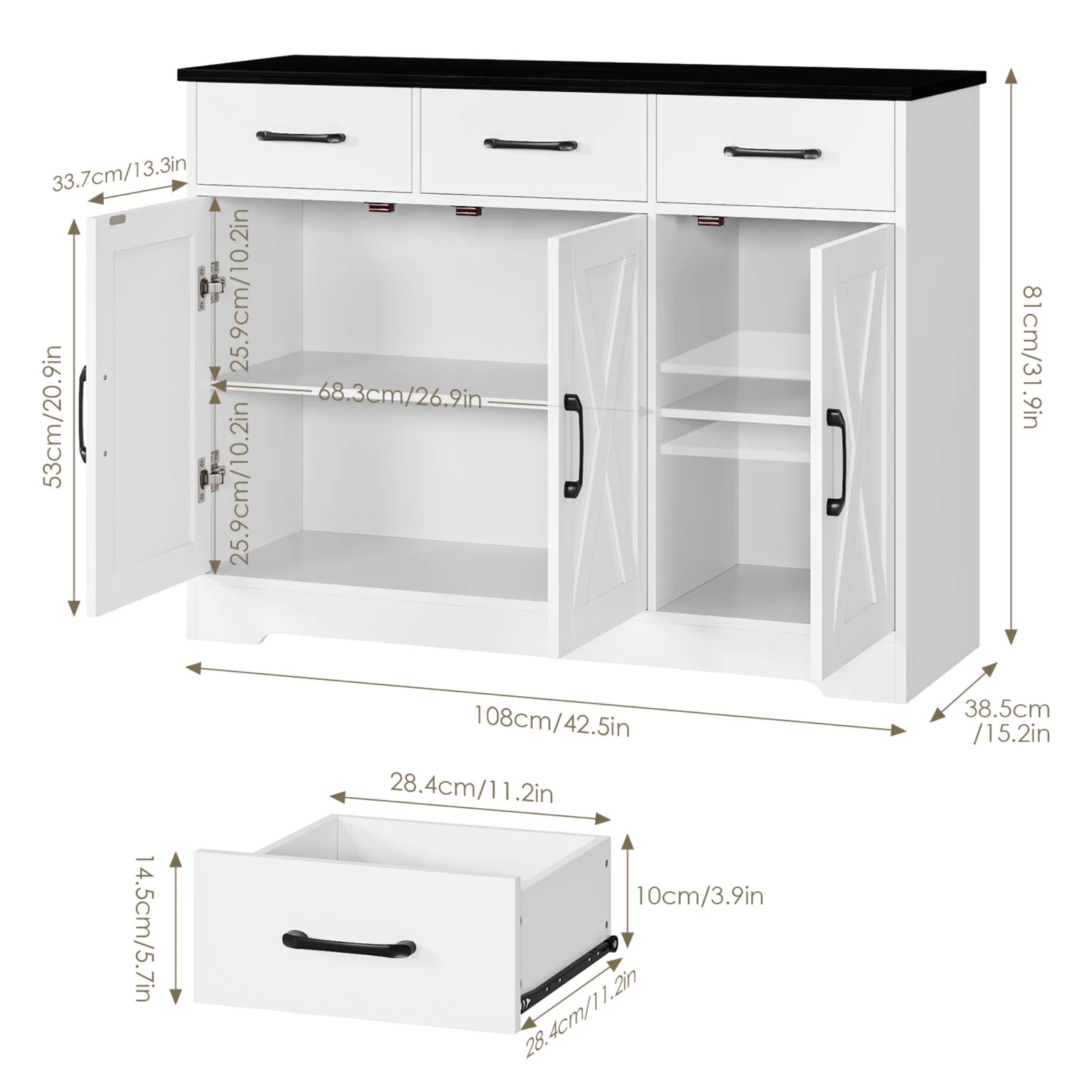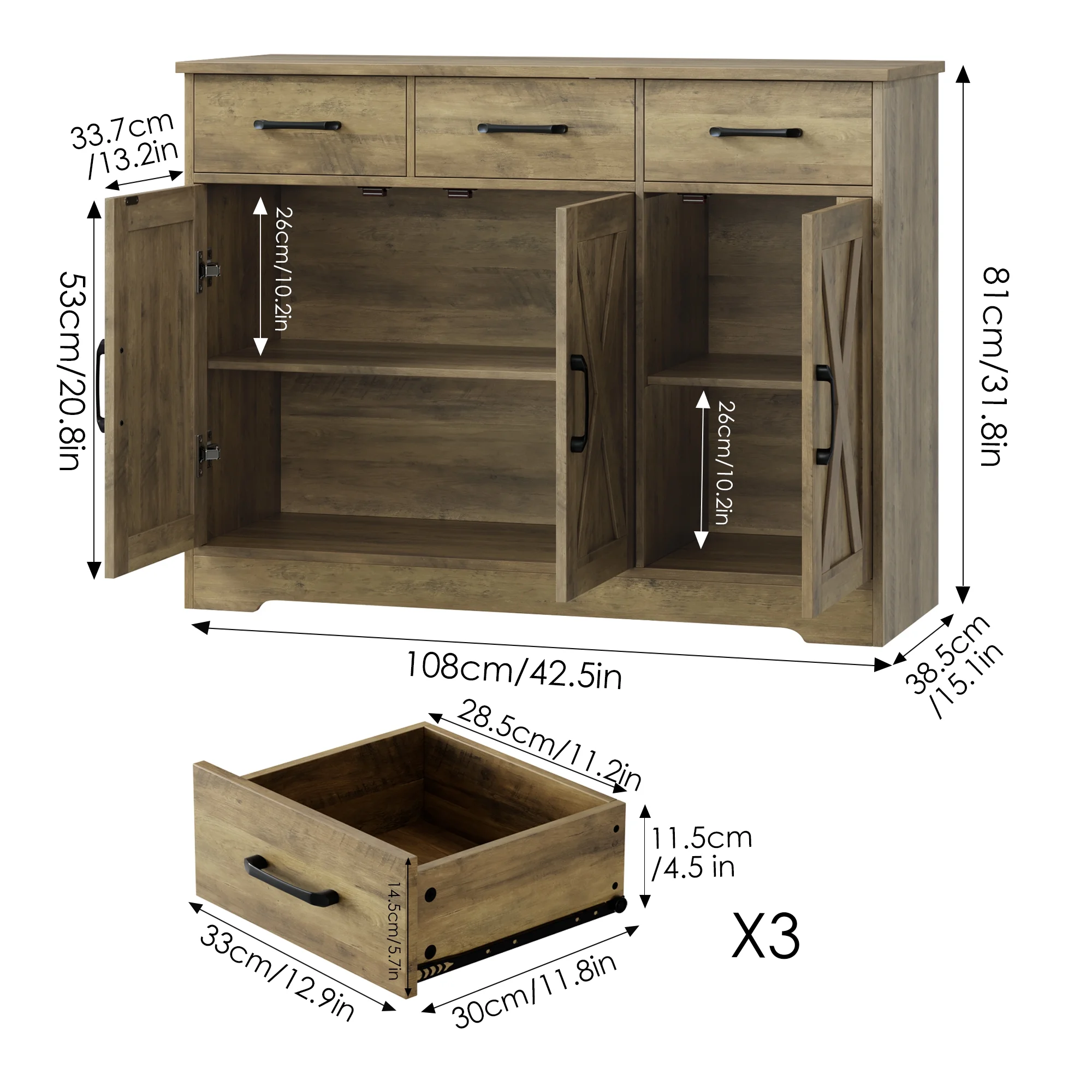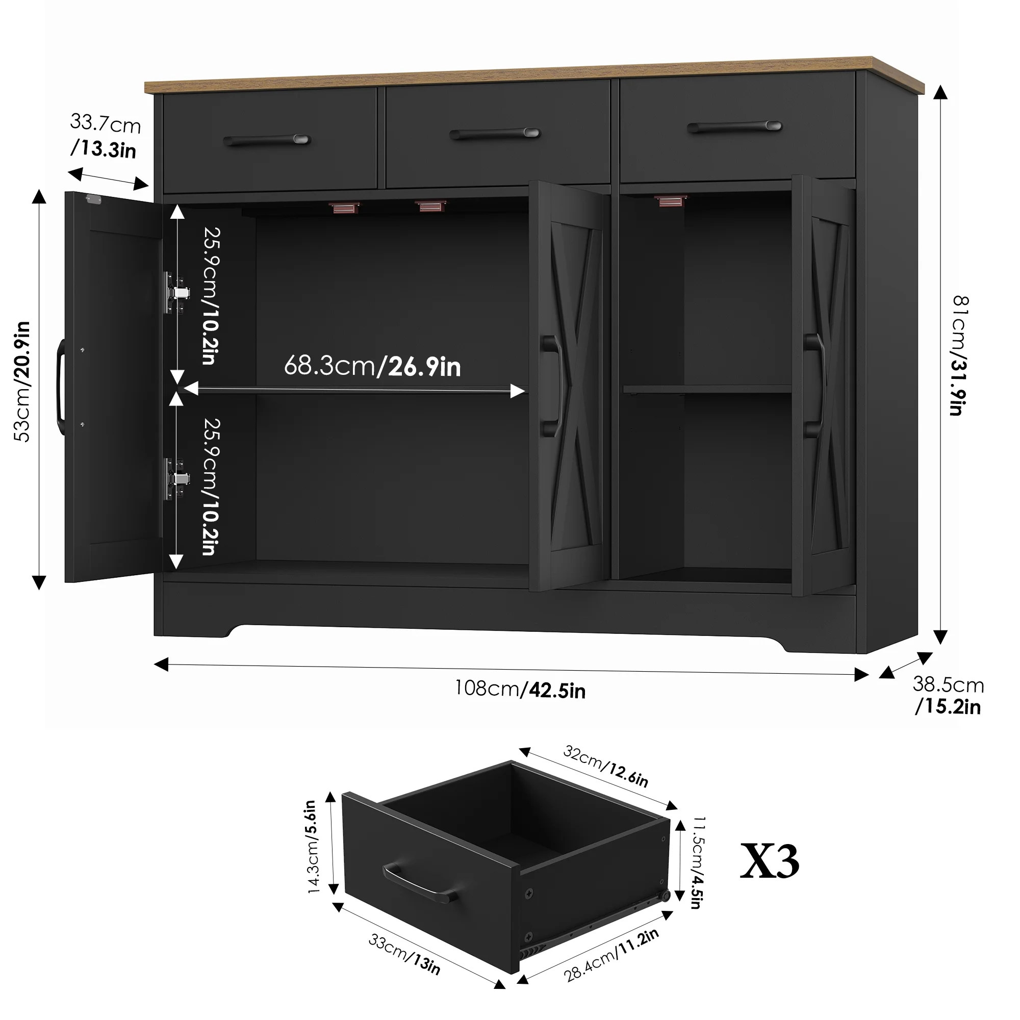 This 42.5'' buffet cabinet 3 spacious drawers and storage shelves provide amazing hidden storage for your plates, cutlery or any other items. One of the shelves inside the farmhouse storage cabinet is adjustable at 3 fixed levels, so you can change the layout of the space Depending on the size of your items. Meet your different storage needs.