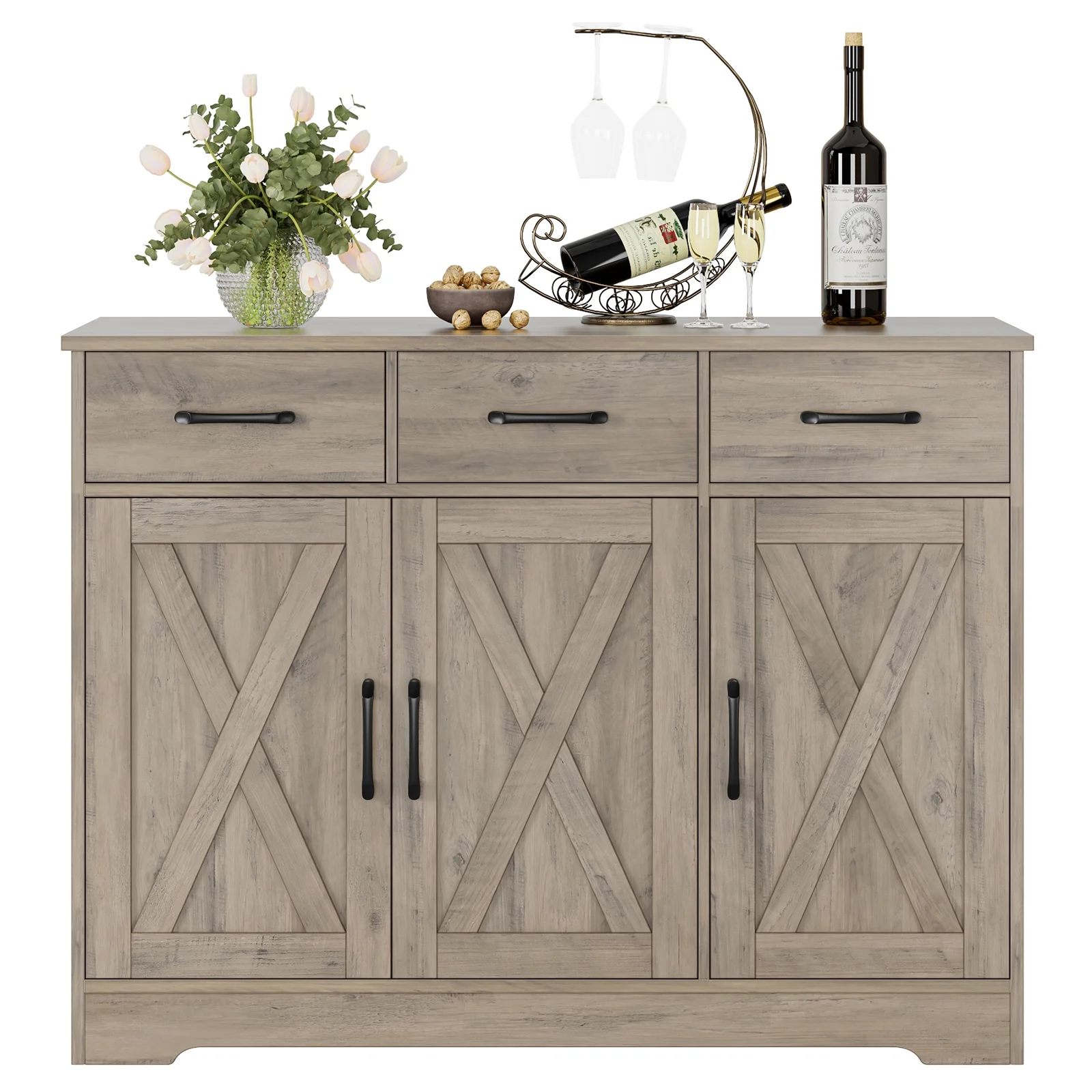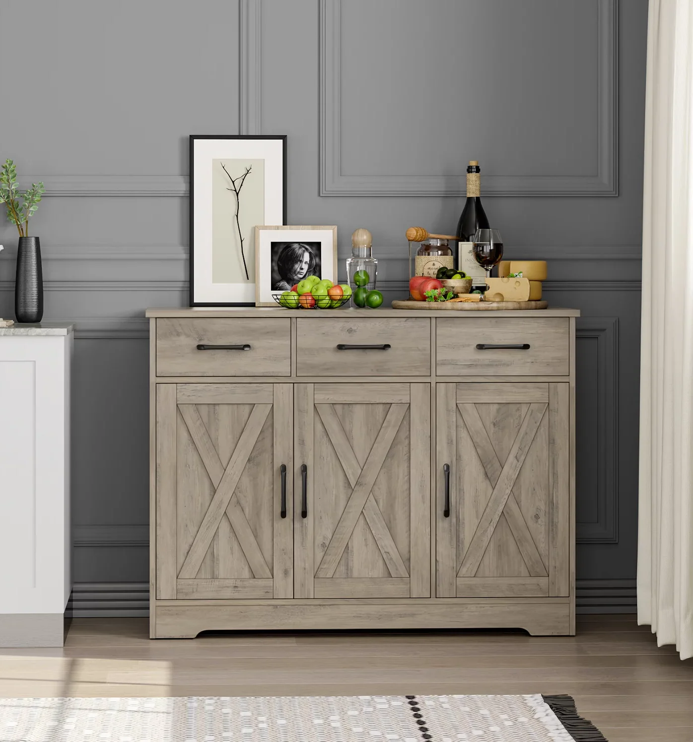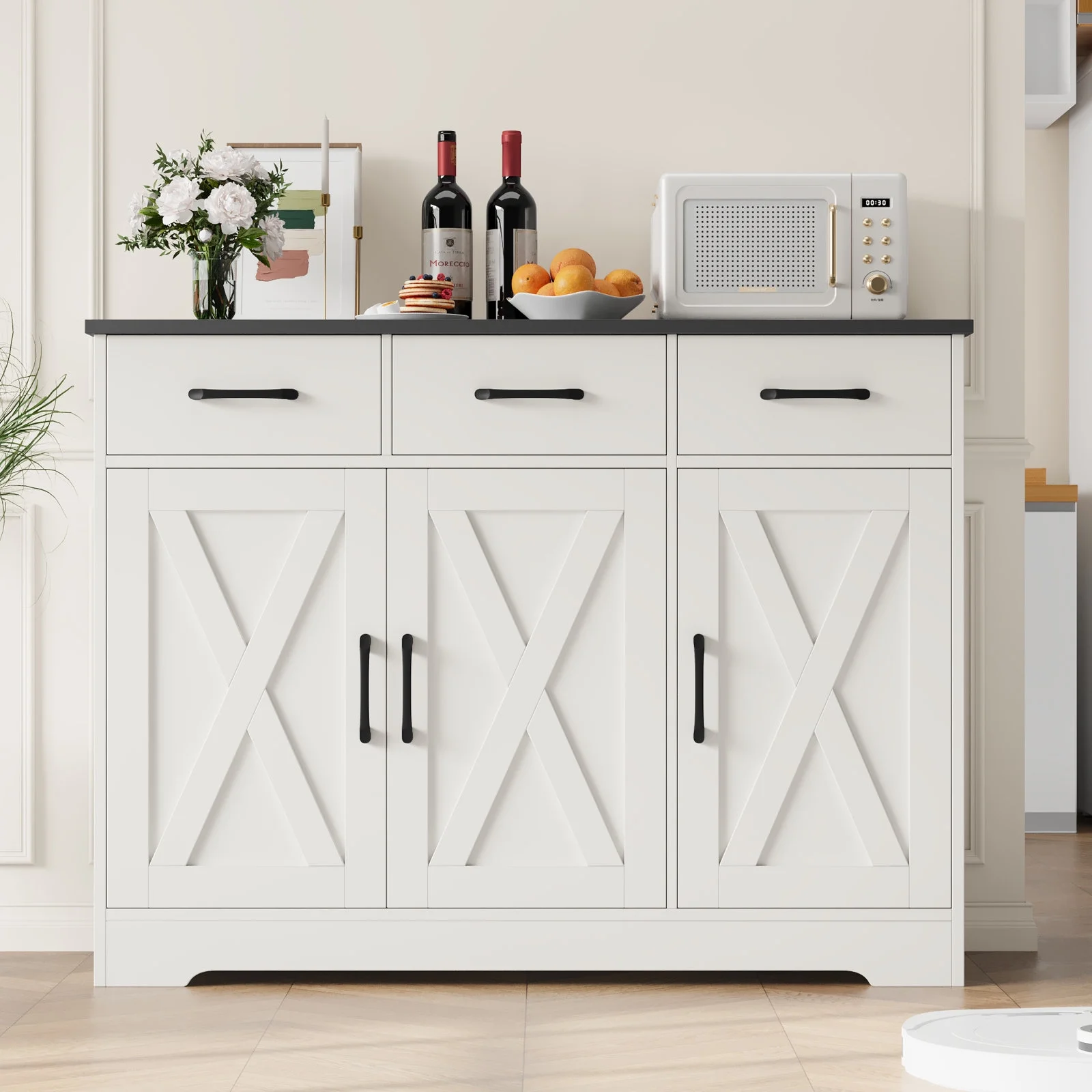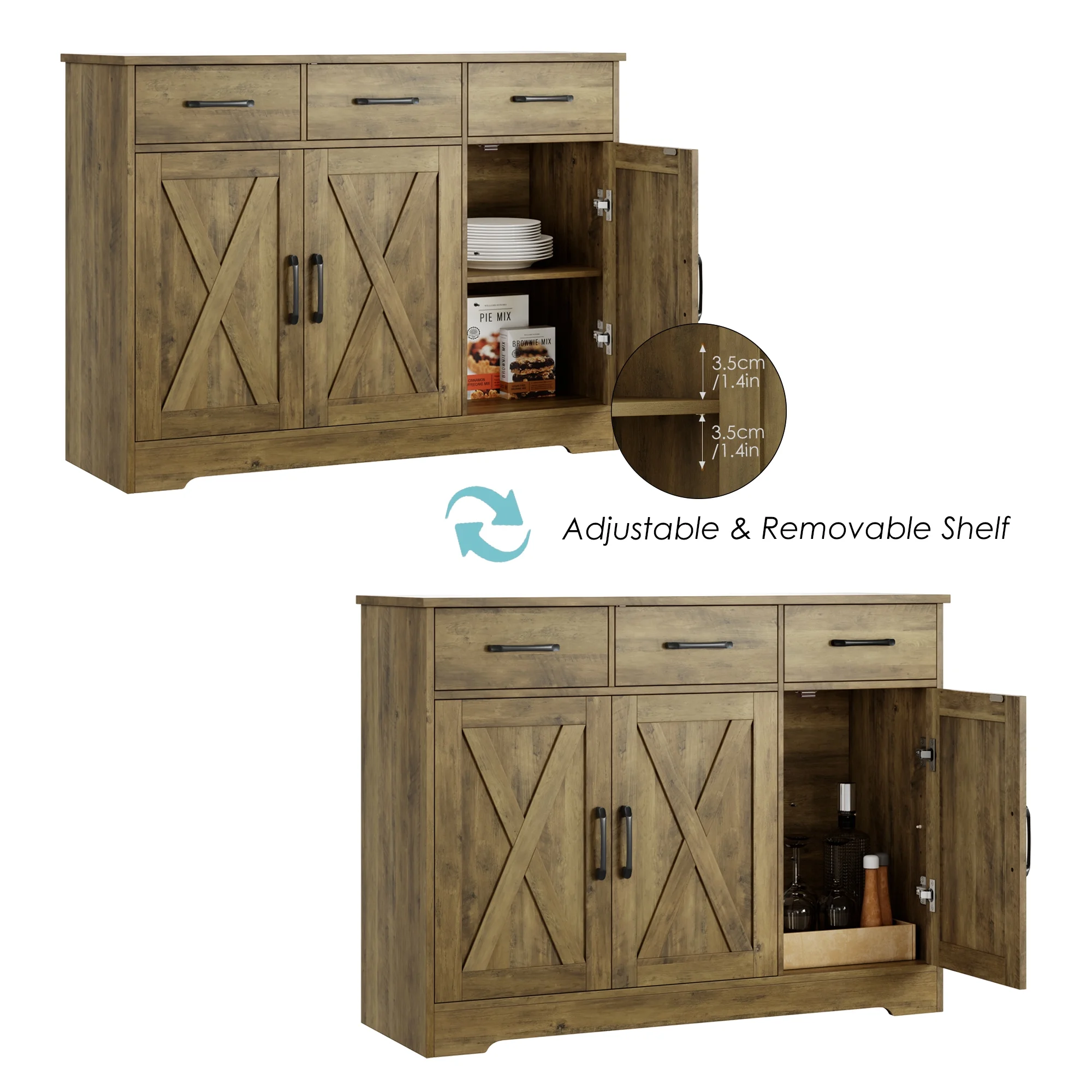 This 42.5'' buffet cabinet 3 spacious drawers and storage shelves provide amazing hidden storage for your plates, cutlery or any other items. One of the shelves inside the farmhouse storage cabinet is adjustable at 3 fixed levels, so you can change the layout of the space Depending on the size of your items. Meet your different storage needs.