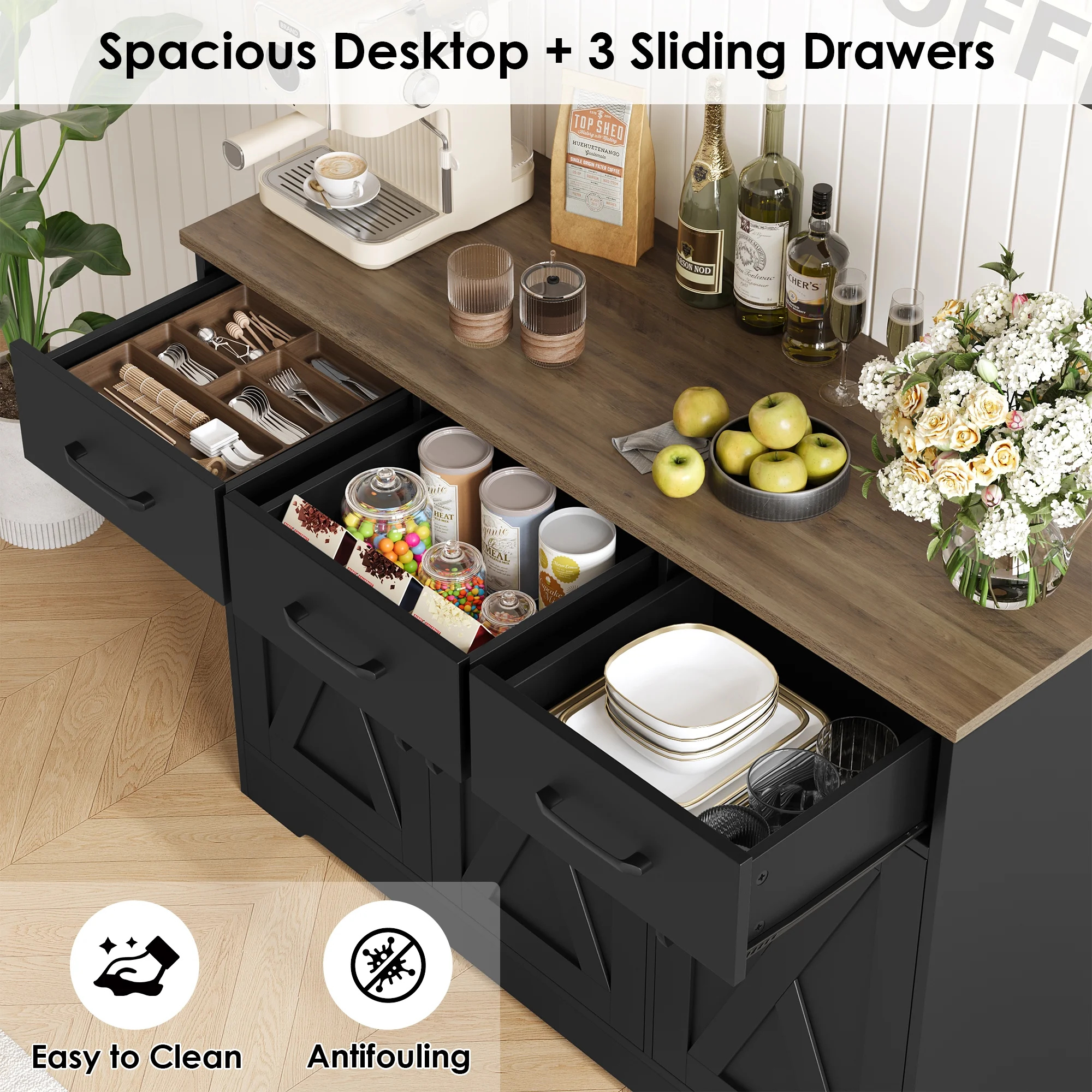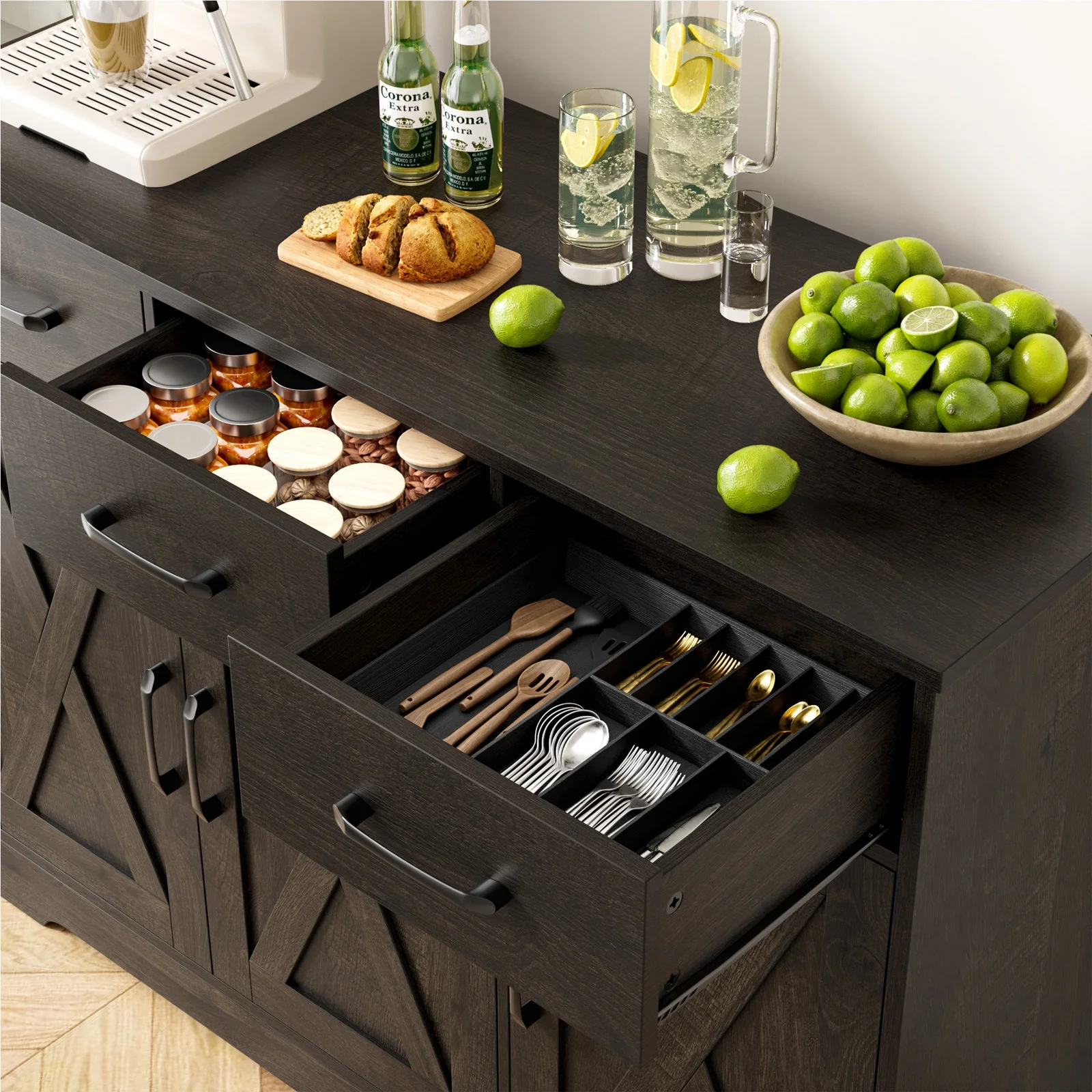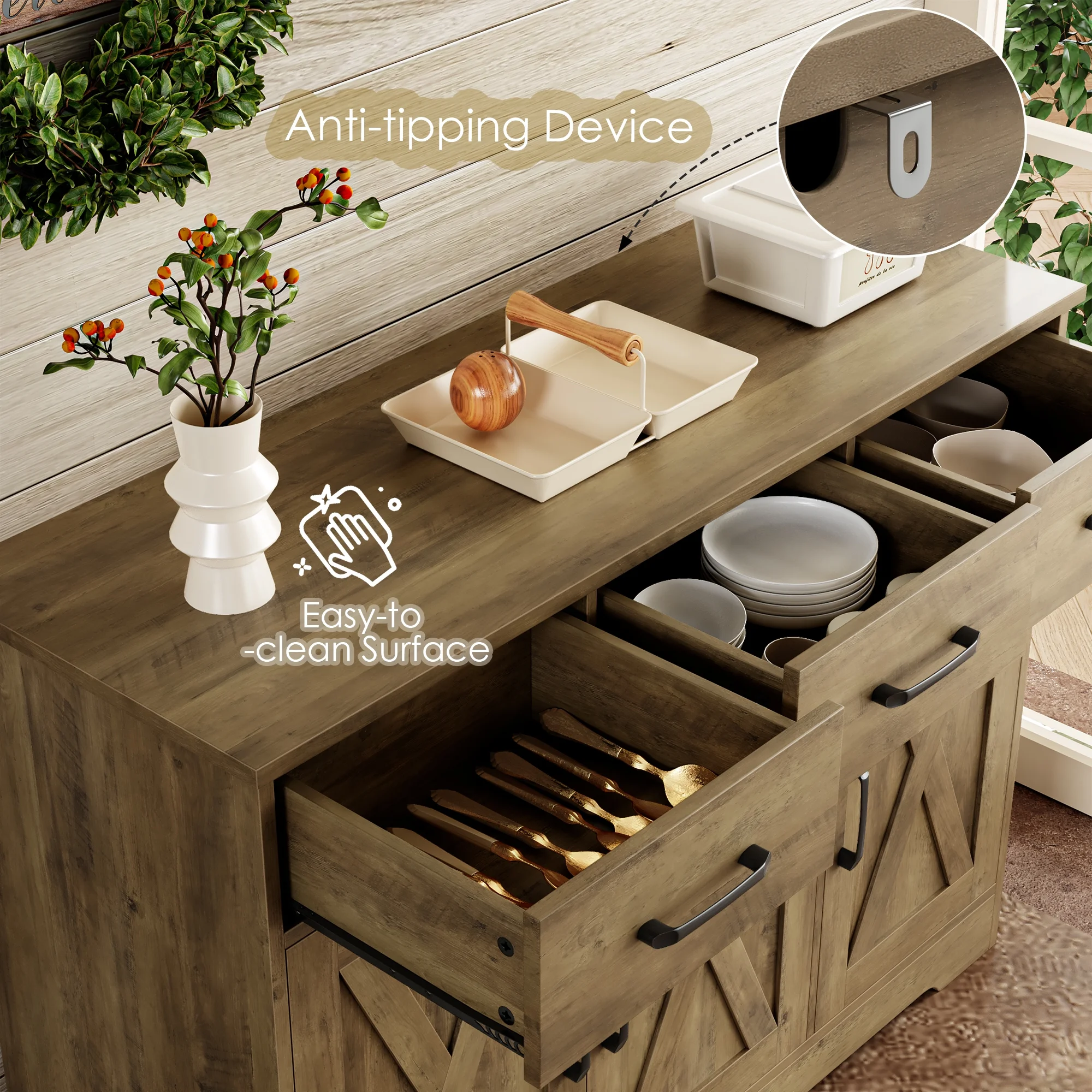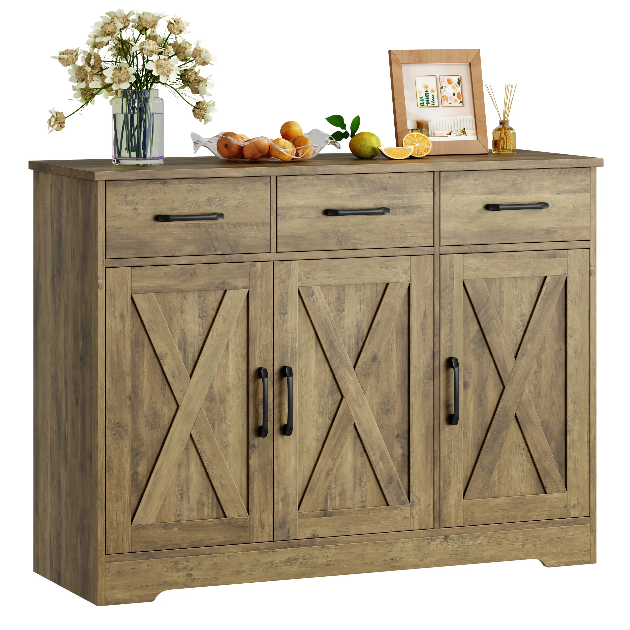This 42.5'' buffet cabinet 3 spacious drawers and storage shelves provide amazing hidden storage for your plates, cutlery or any other items. One of the shelves inside the farmhouse storage cabinet is adjustable at 3 fixed levels, so you can change the layout of the space Depending on the size of your items. Meet your different storage needs.