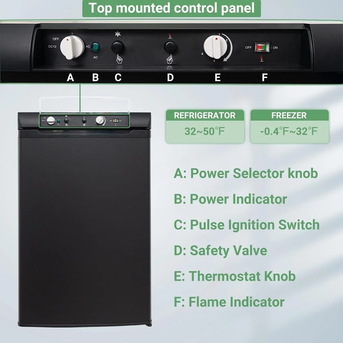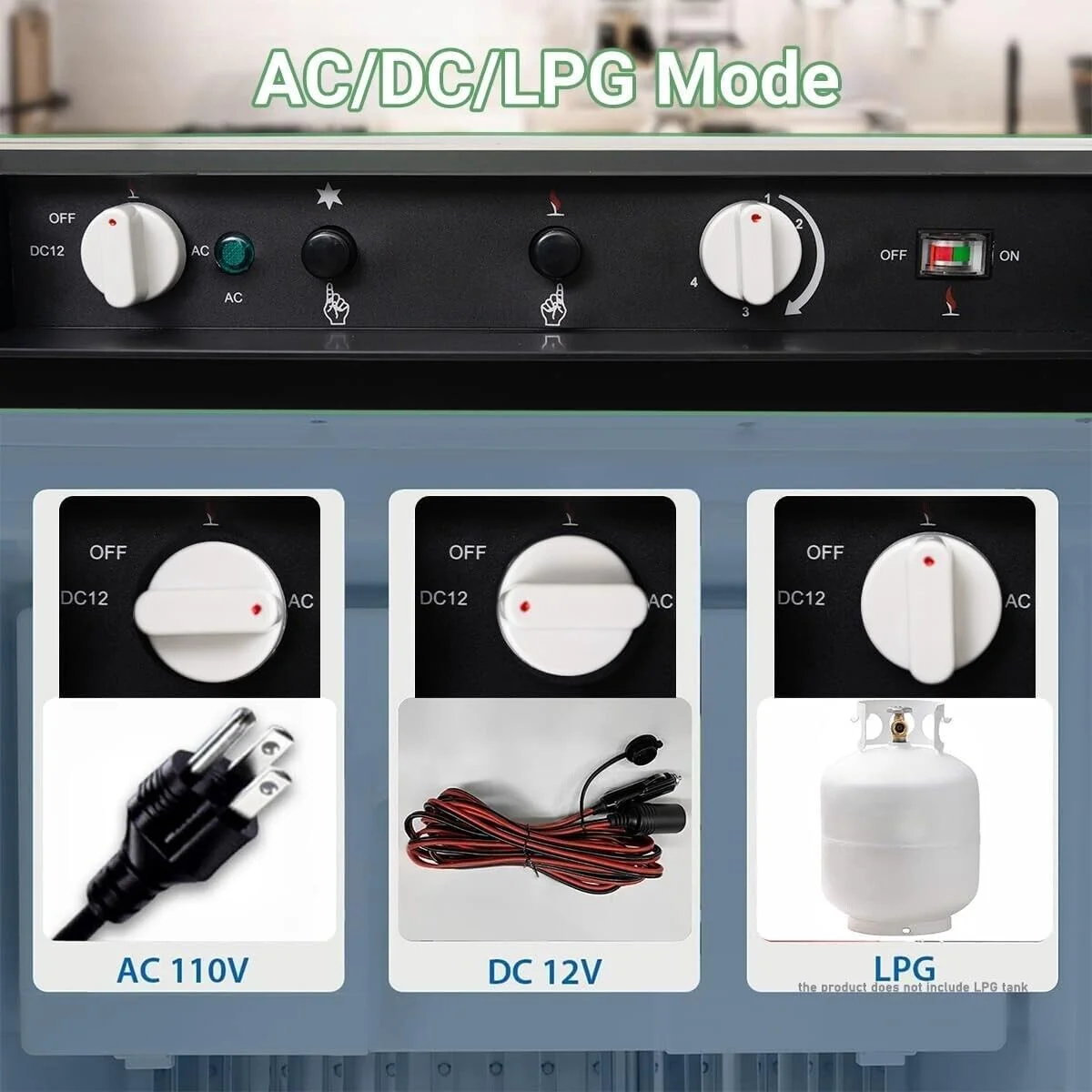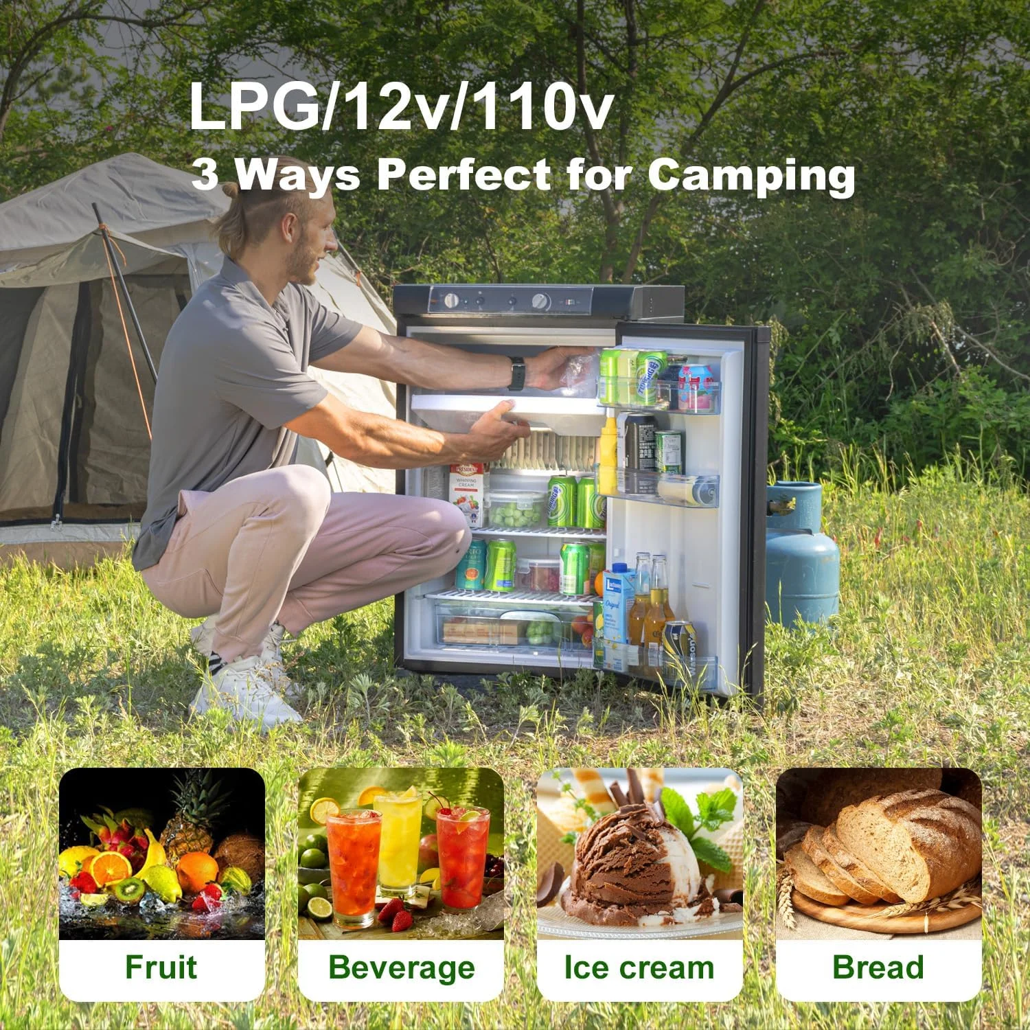 ???3 Way Powered???110 V, 12 V, and propane input. Approximate gas consumption: 0.65 kg/24h. A propane refrigerator is perfect for off-grid places. Thanks to gas refrigeration, you can be unshackled from powered camping sites to enjoy the automotive, off-grid places, camping, and fishing. LPG gas pressure requirement is 2.8Kpa (28mbar).