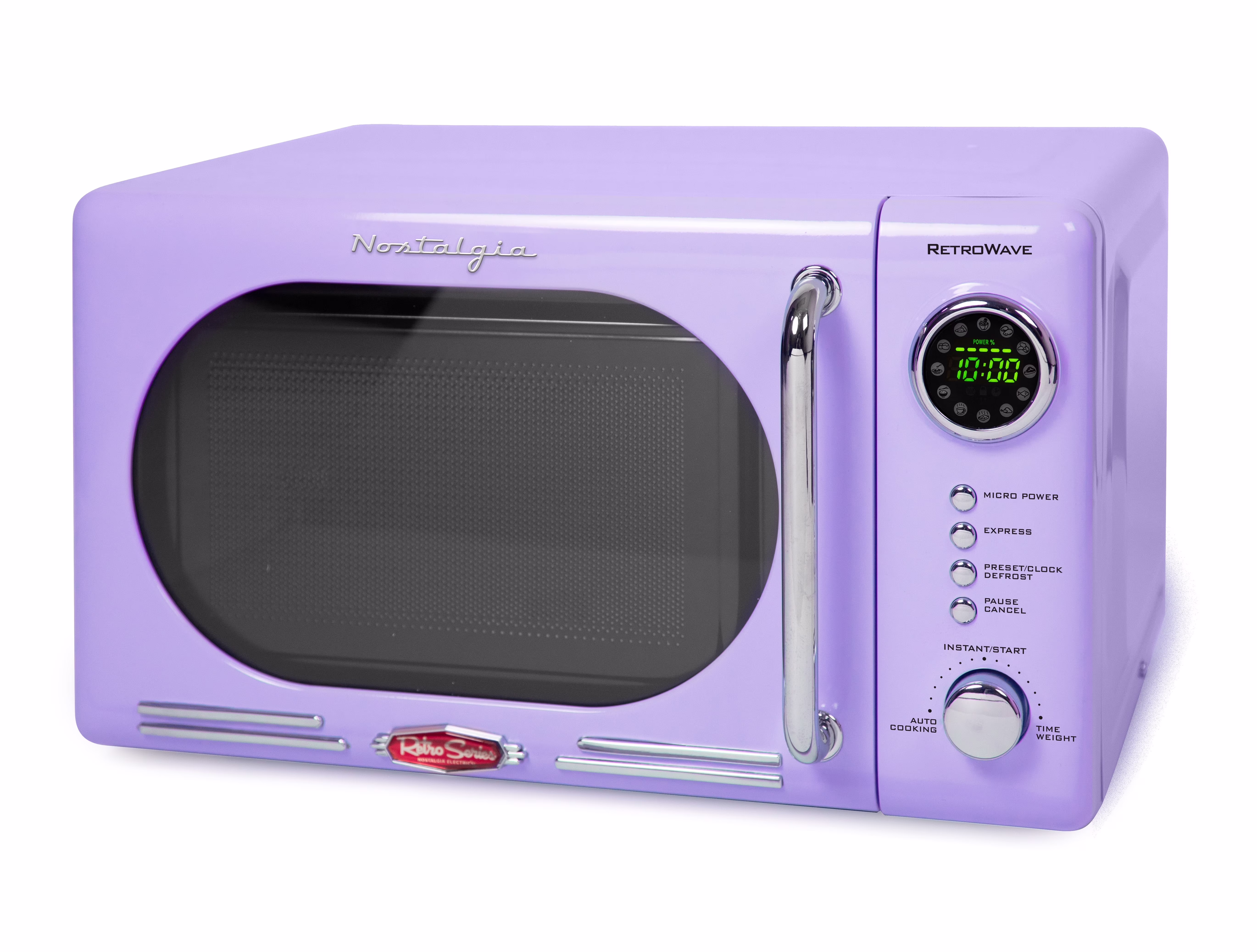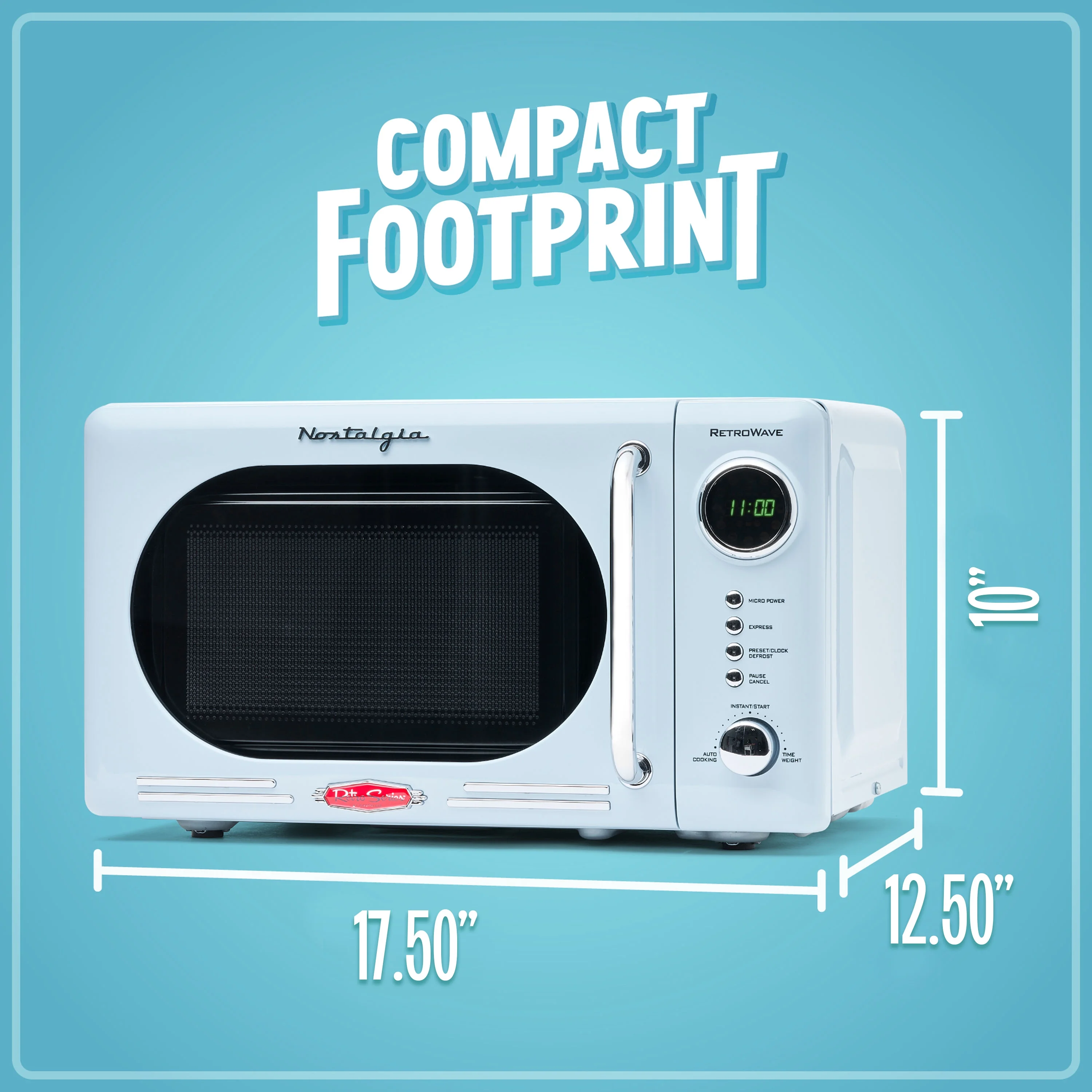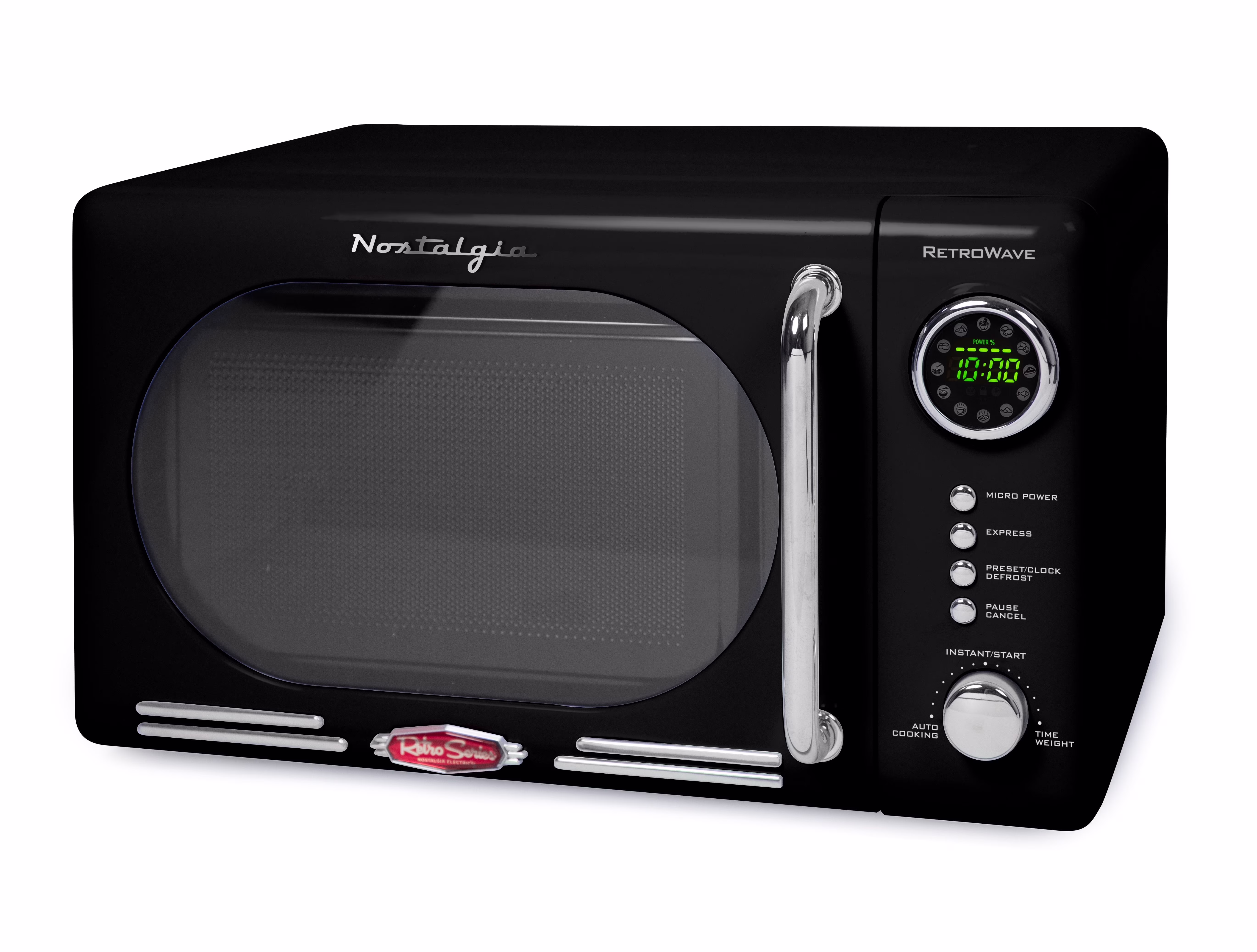 - Retro Accents: A sleek chrome door handle, control panel and accents add fun and flair to this unique retro-styled appliance