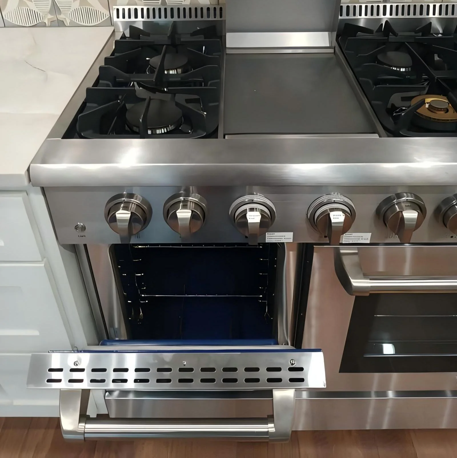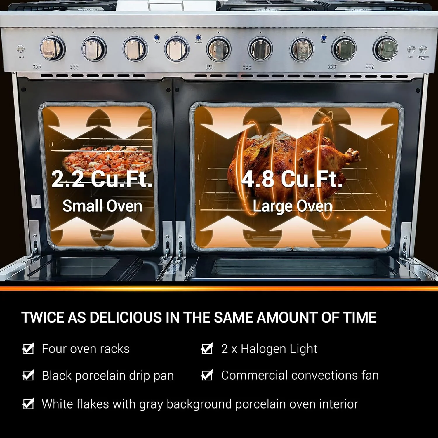 - CONVECTION OVEN: Spacious 6.0 cubic foot oven features a fan to distribute heat evenly around the food and eliminate cold spots in the oven cavity, food cooks more evenly in less time and at a higher temperature than a standard oven. Oven is equipped with two Burners: 18,500 BTU and 13,500 BTU.