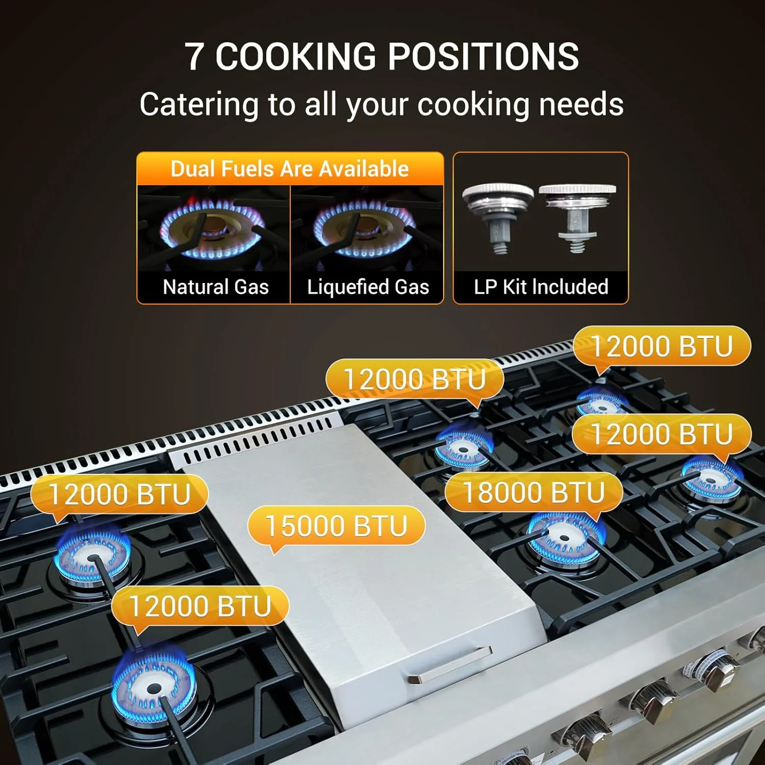 - 6 SEALED BURNERS: Black porcelain gas cooktop features 6 sealed burners that give you the precision and control while cooking, from simmering to boiling to frying: one 18,000 BTU Burners, three 12,000 BTU Burners, two 9,000 BTU Burners.
