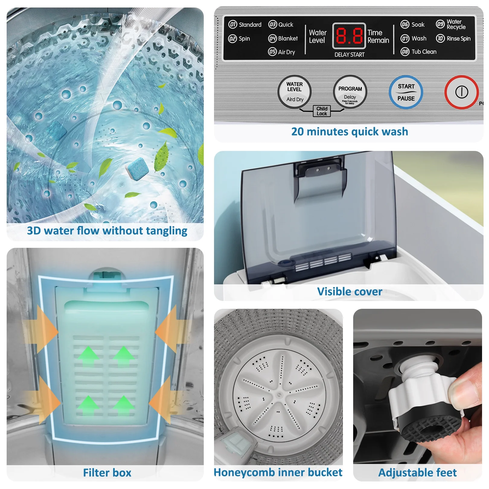 e?��|Humanized design: The portable washing machine has a transparent top cover, which allows you to monitor the washing situation and the status of the clothes at any time. With handles on both sides, it is easy to move around, and the child lock function adds security to your home. The 24-hour delayed start function allows you to arrange the washing time flexibly. The self-cleaning drum allows you to have a clean laundry environment and avoid secondary clothes pollution. The inner drum of the compact washing machine adopts a stainless steel honeycomb design, which can effectively avoid the wear and tear of clothes, prevent rust, and have a longer service life.