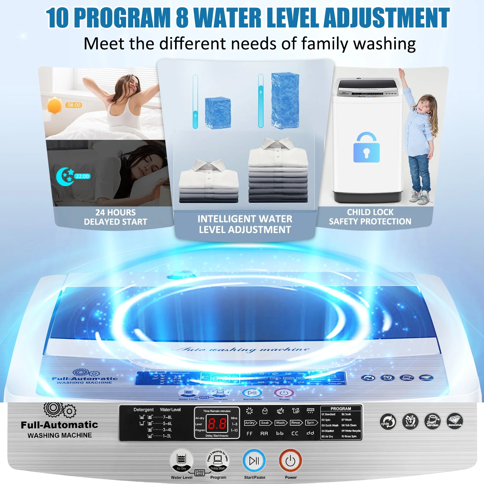 e???Easy to operate: With 8 water levels and 10 programs, the washer machine allows you to customize your laundry process, and the LED display gives you a clear view of the wash process. You can choose the right program for different fabrics and the right amount of water for the number of loads, saving energy and keeping your clothes looking new. It is easy to operate the washing machine by simply programming it to work by itself during the washing process.