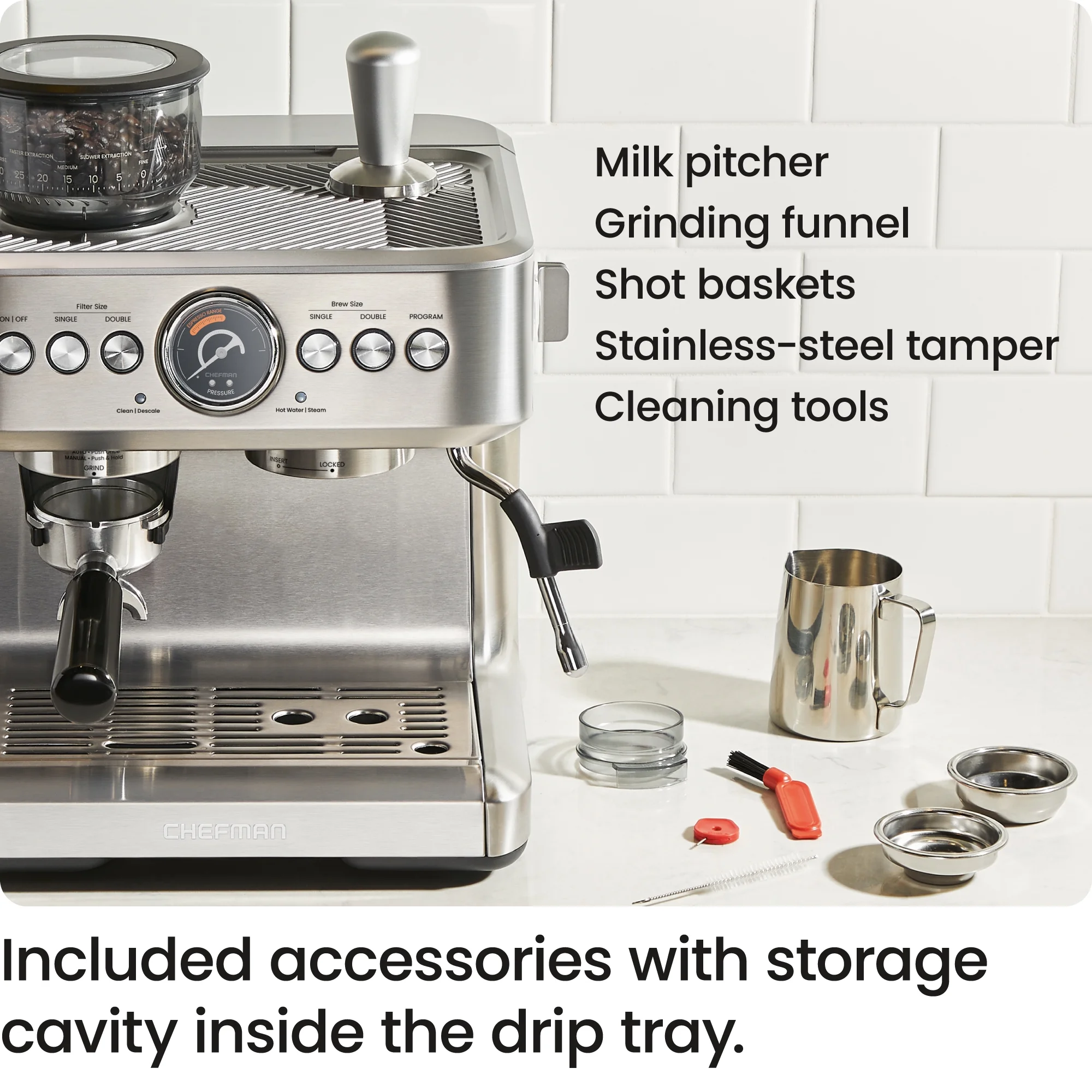 - INCLUDED ACCESSORIES: The machine comes fully kitted with all the espresso accessories you need, including a milk pitcher, stainless-steel tamper, cleaning tools, and a grinding funnel. Store it all inside of the detachable drip tray.