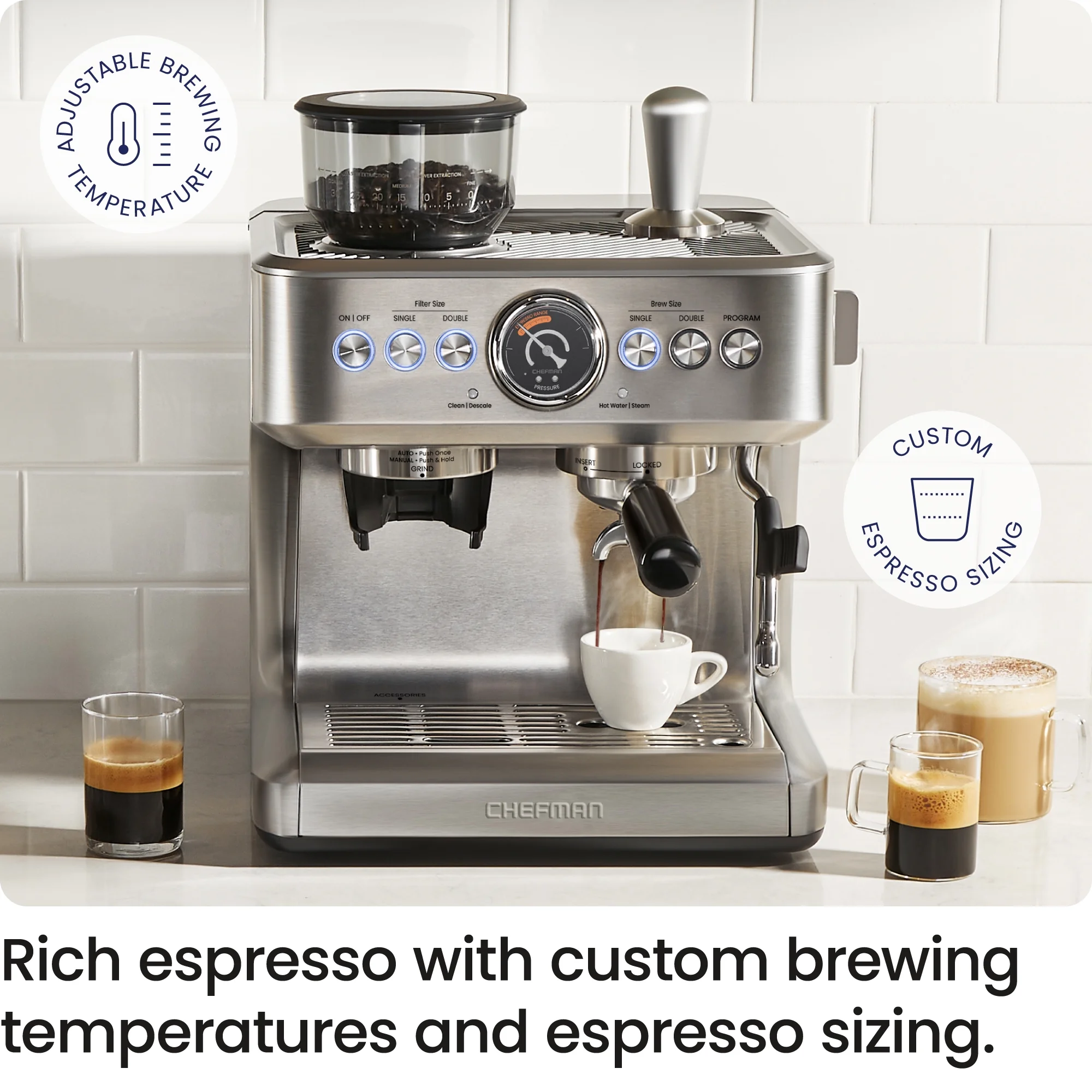 - RICH, FLAVORFUL ESPRESSO: The 15-bar pump produces beautiful espresso, with customizable shot temperature and volume settings for your ideal morning cup. Monitor it all with the pressure gauge display on the user interface.