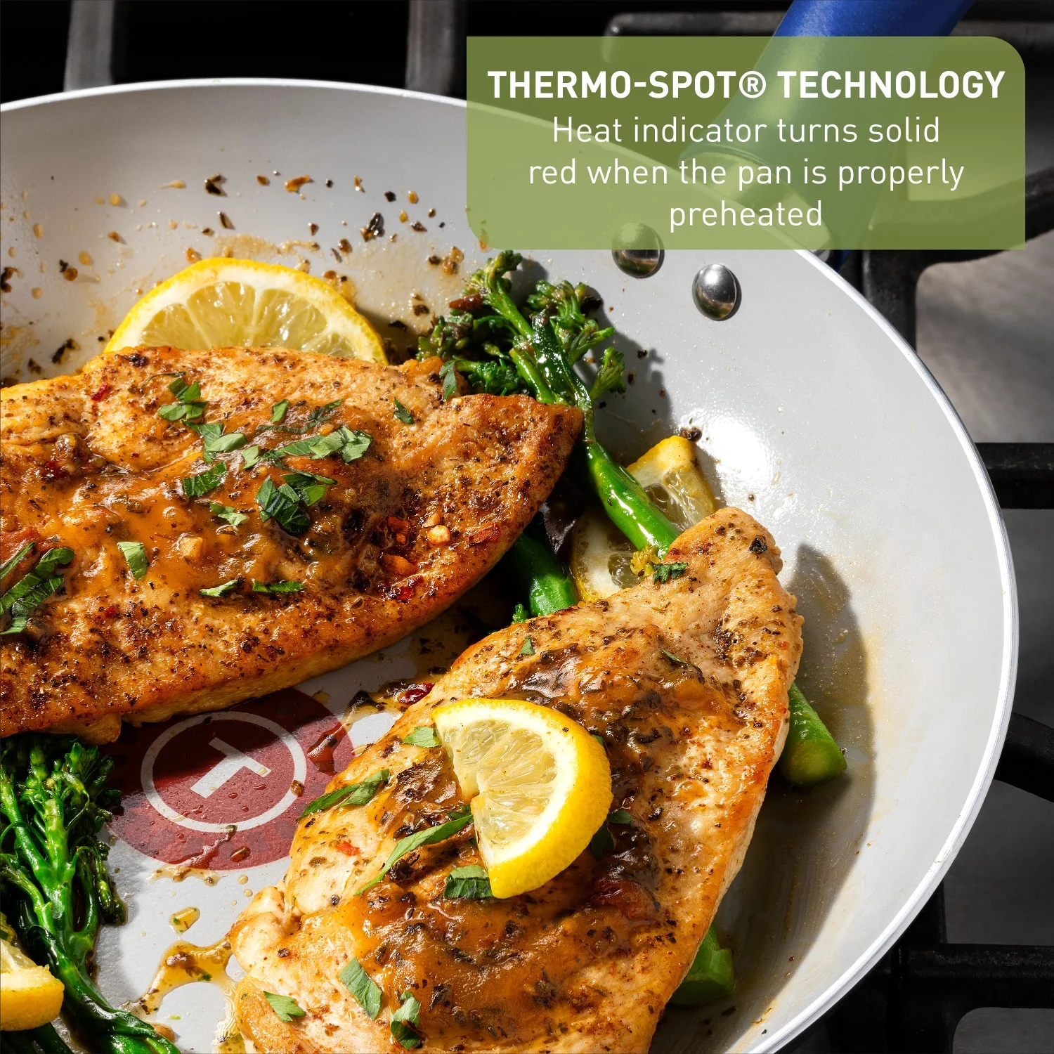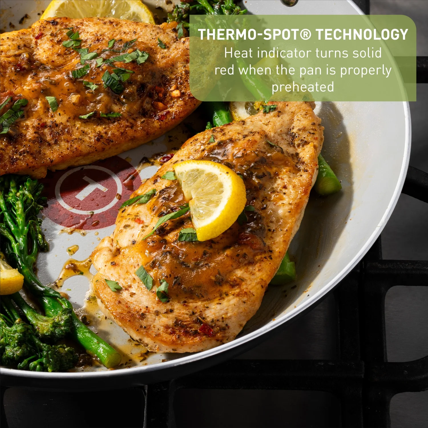 - Thermo-Spot?? Technology: Our unique heat indicator turns solid red when the pans are perfectly pre-heated. Additionally, this cookware has an even heat base, preventing hot spots for optimal cooking results.