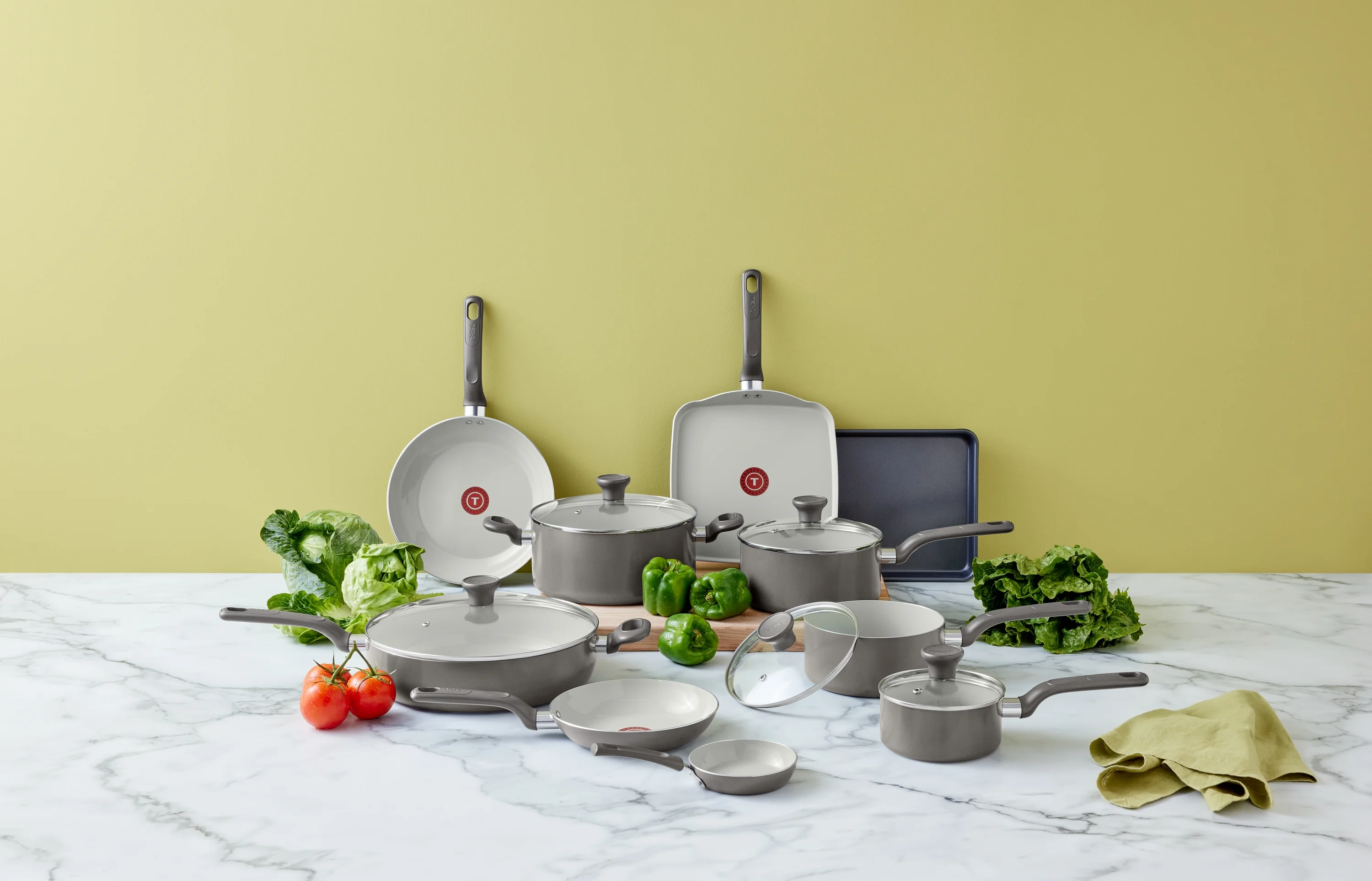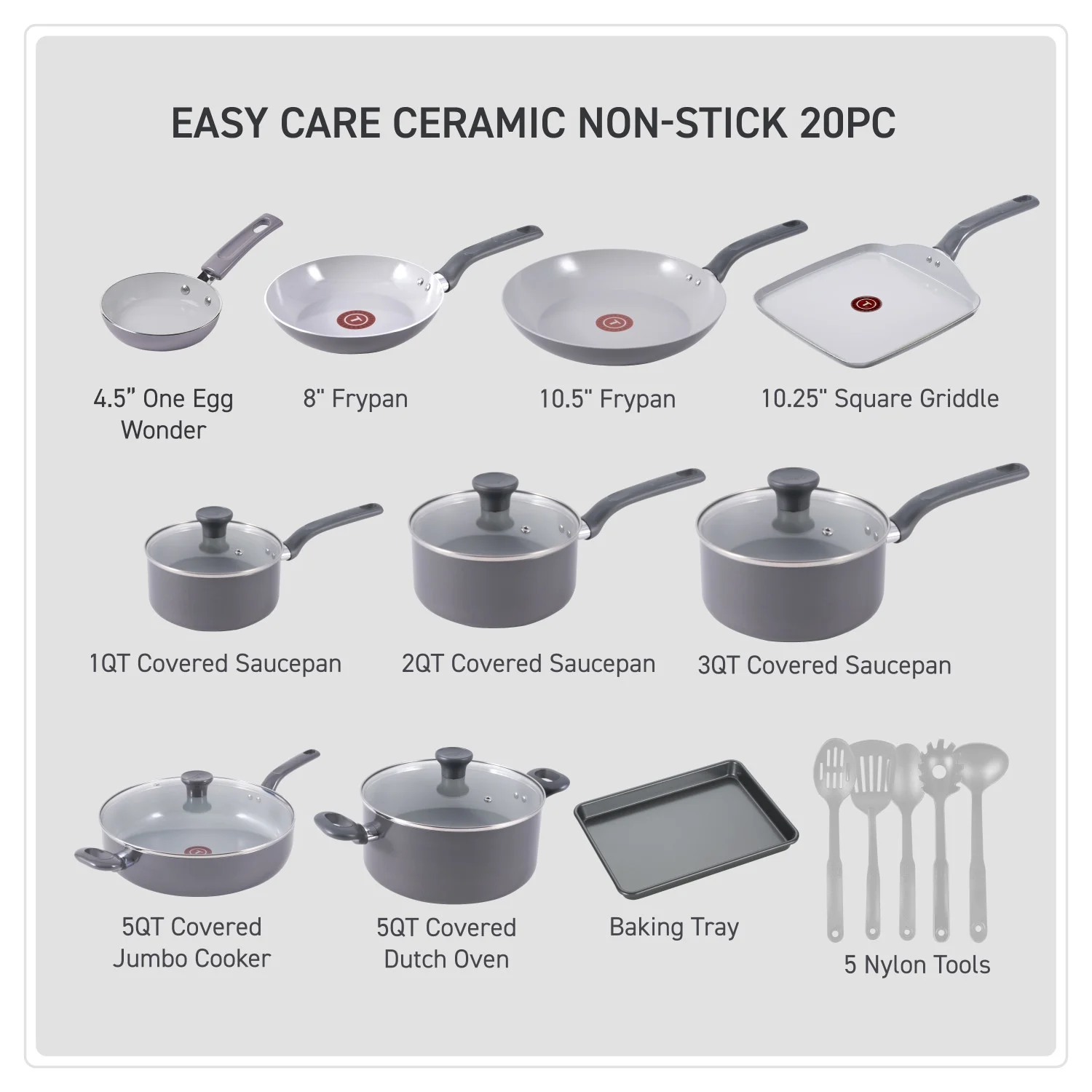 - All You Need: This 20 piece set includes 4.7 inch One Egg Wonder, 8 inch and 10.5 inch Frypans, 1 Quart, 2 Quart and 3 Quart Covered Saucepan, 5 Quart Covered Jumbo Cooker, 5 Quart Covered Dutch Oven, 12.5 inch x 9 inch Baking Tray, 10.25 Inch Square Griddle, and 5 Nylon tools, making this set the perfect addition to your kitchen!