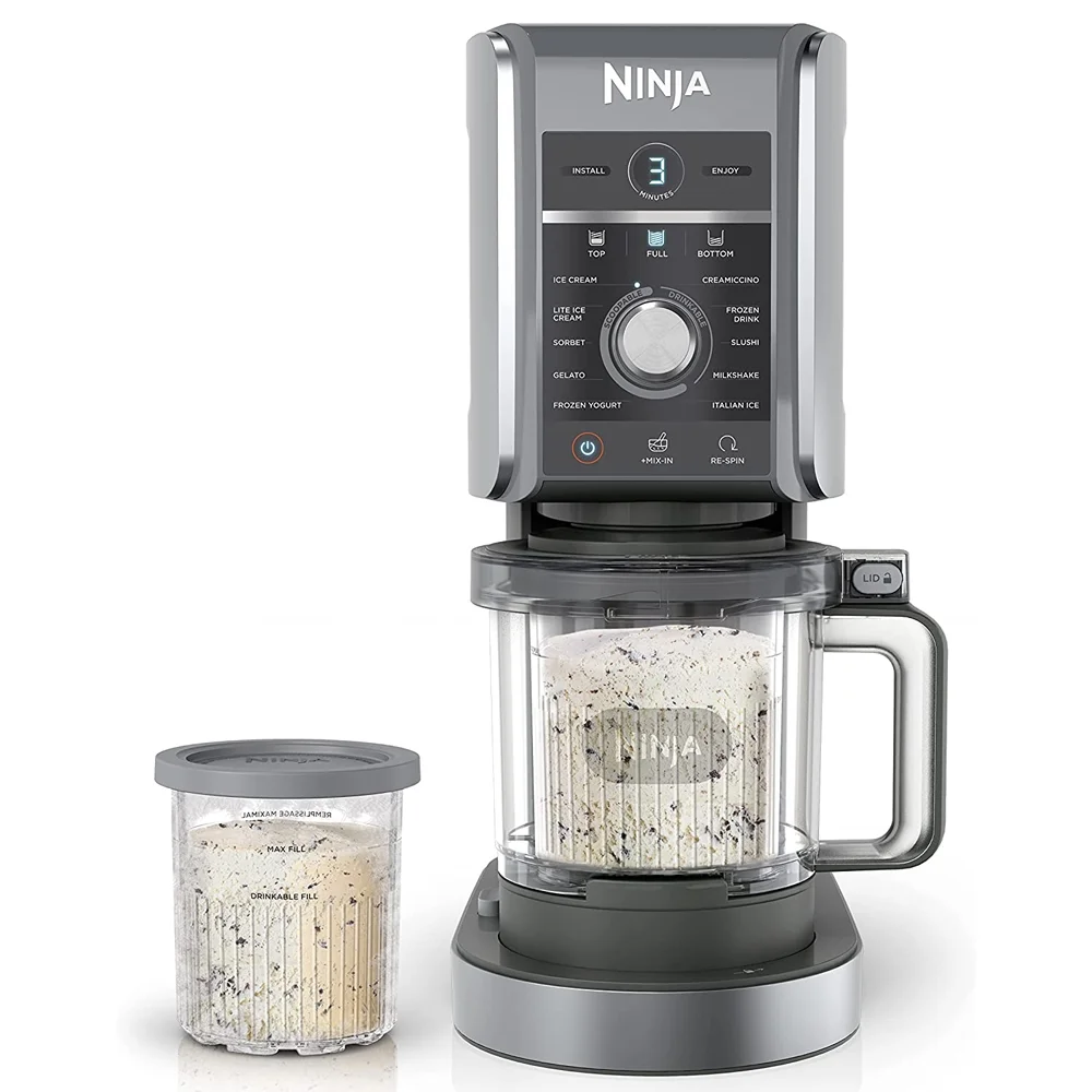 CRTE99NJNC501RB Ninja CREAMi Deluxe 11-in-1 XL Ice Cream Maker, Silver (NC501) - Refurbished Deluxe Creamerizer Paddle(2) 24 oz. CREAMi Deluxe Pints with Storage LidsOuter bowl and lid11 One- Touch ProgramsRecipe inspiration guide with 30 recipesRefurbishedBundle Includes Ninja CREAMi Deluxe 11-in-1 XL Ice Cream Maker Silver With the Ninjaa?�� CREAMi?? Deluxe, make classic CREAMi?? treats like ice cream, sorbet, and gelato, and mix-in masterpieces. And now, make new CREAMi?? treats like Italian Ice, Slushi, Creamiccinoa?��, Frozen Yogurt, and Frozen Drinks right at home.Product Highlights 5 Exclusive Ninja CREAMi Deluxe Functions: Frozen drink, slushi, frozen yogurt, creamiccino, and Italian iceMake ice cream in 4 easy stepsIncludes two 24-oz. deluxe pints and lidsDishwasher safeProduct Features New Functionality Make CREAMi?? scoopable and drinkable treats with the addition of the Slushi, Italian Ice, Frozen Drink, Creamiccino, and Frozen Yogurt functions.Capacity New Larger CREAMi?? Deluxe Pints hold 3 cups each a?? 50% more capacity than the original CREAMi??. Make more treats for the whole family to enjoy. Flexibility With two flavors, one base, you can turn every frozen base into two finished flavors with different mix-ins, one on top and one on the bottom. You can also process the top half to enjoy now and save the rest for later Customization Create completely customizable treats. With the Ninjaa?�� CREAMi?? Deluxe, you can have total control of your ingredients for low sugar, keto, dairy-free, and vegan options.Easy to Use Create a CREAMi?? treat in three simple steps. Simply prepare your base, freeze overnight, process, and enjoy. Advanced Creamify Technologya?��The Professional Creamerizer Paddle finely shaves and transforms ice particles into the creamiest treats like Slushies, Italian Ice, Frozen Drinks, Creamiccinos, and more.MIX-INSCustomize your flavor and texture by mixing in your favorite chocolate, nuts, candy, fruit, and more to personalize any CREAMi?? treat.Easy To Containers, lids and paddle are all top-rack dishwasher safe to make cleanup a breeze.RE-SPINChoose your preferred texture with the Re-spin function which makes your frozen treat even softer and creamier after the first round of processing.