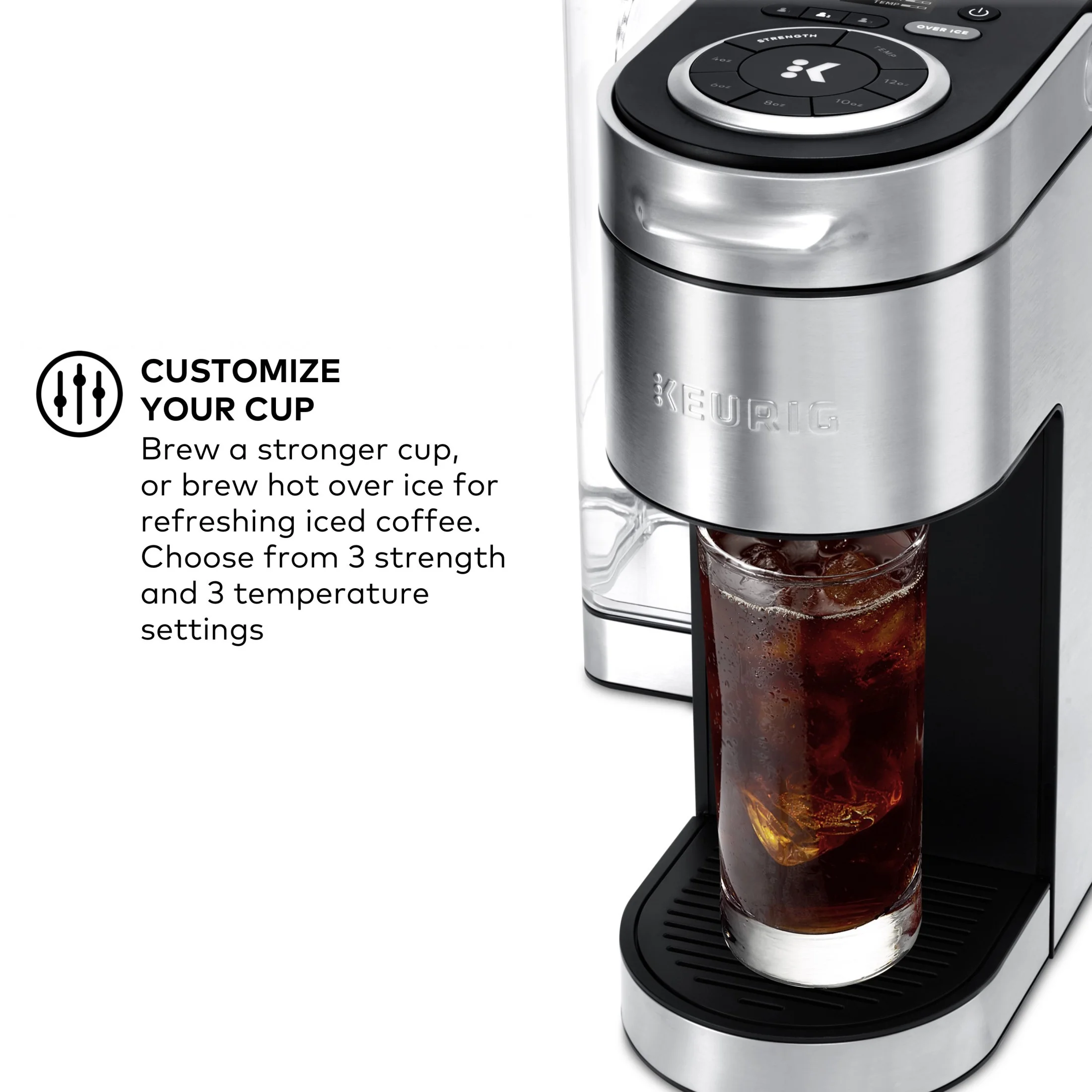 - CUSTOMIZE YOUR CUP: Brew a stronger cup, or brew hot over ice for refreshing iced coffee. Choose from 3 strength and 3 temperature settings.