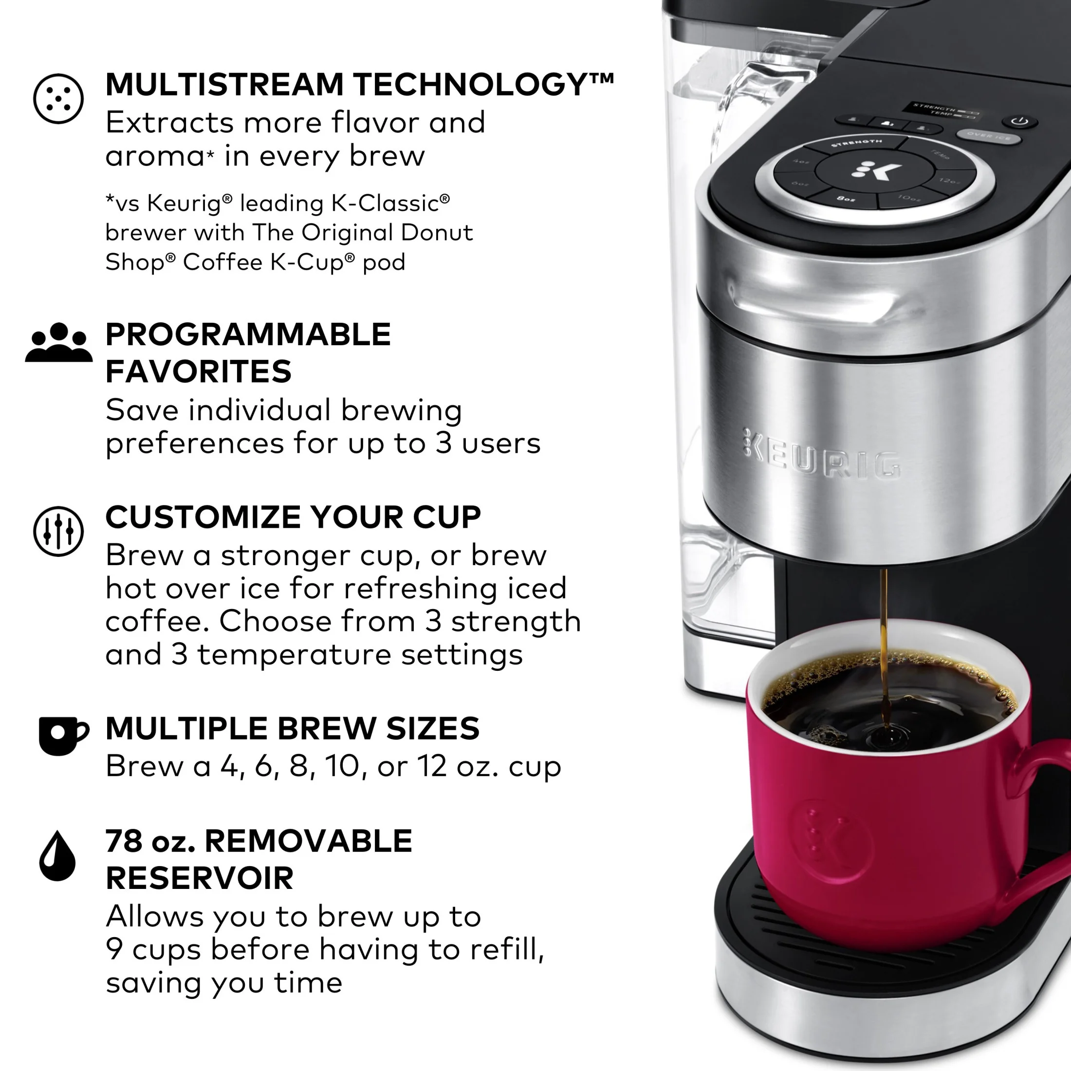 - MULTISTREAM TECHNOLOGY: Extracts more flavor and aroma* in every brew. *vs. Keurig leading K-Classic brewer with The Original Donut Shop Coffee K-Cup pod