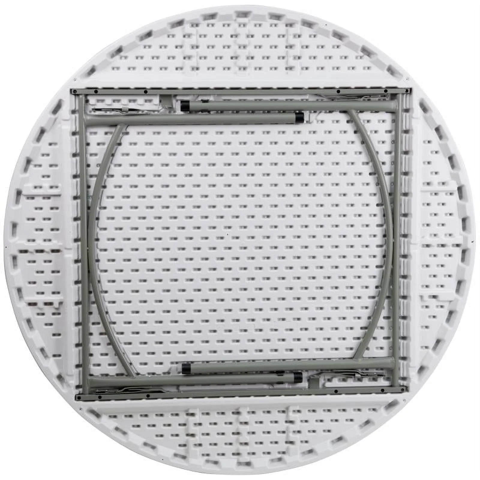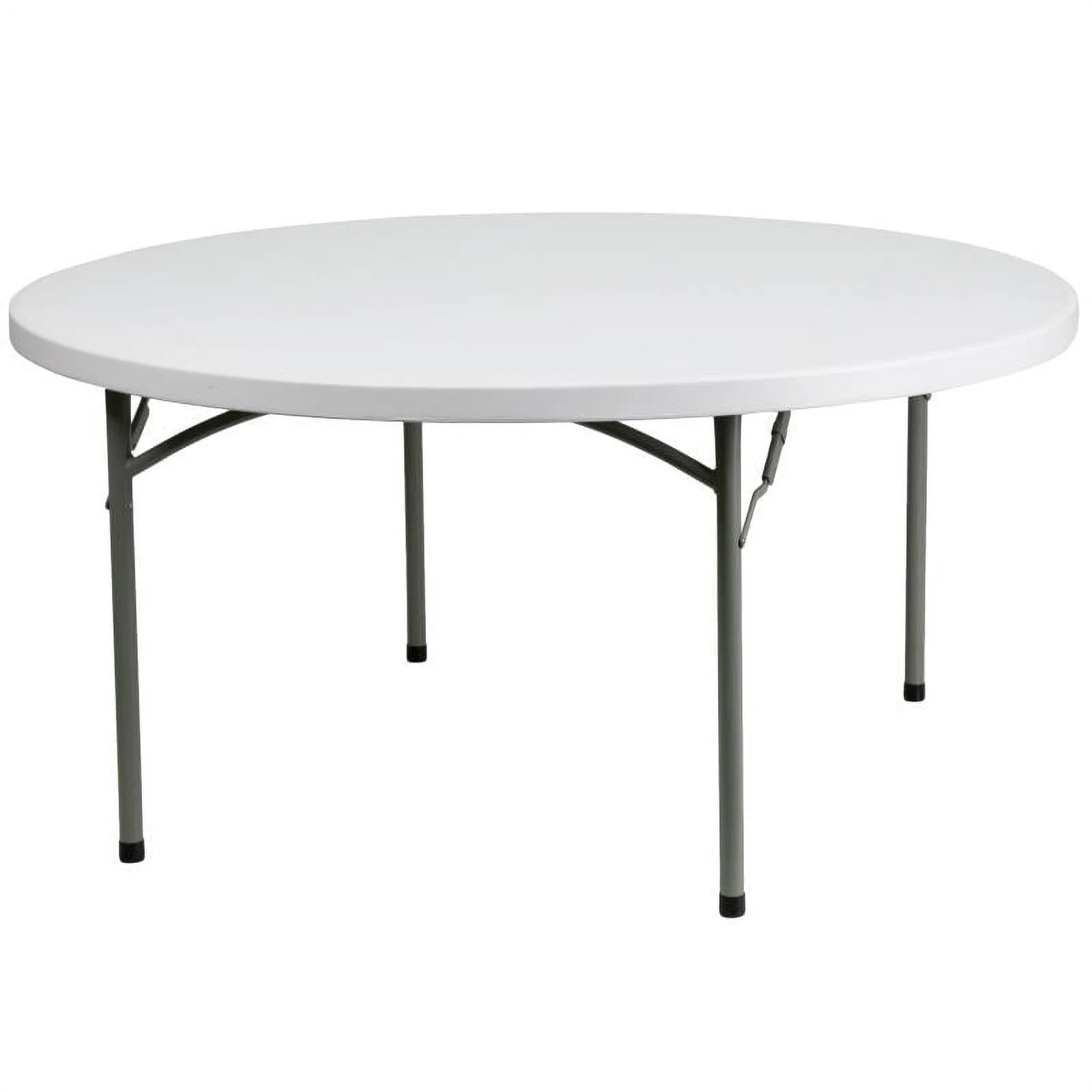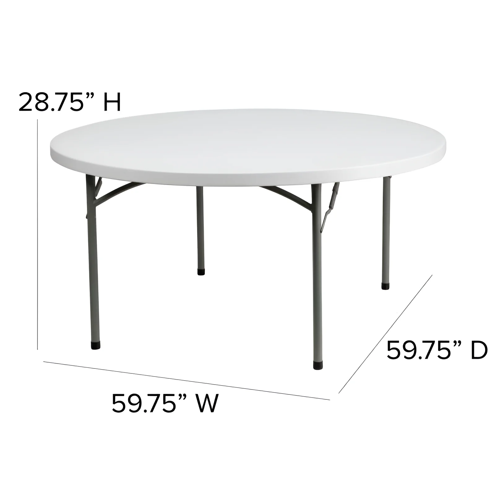 Set of 10 tables . Ensure you have enough surface space for any function and take the stress out of hosting your next gathering. The round dining folding table is a great option for special event planners, catering companies and banquet facilities. This durable, easy to clean table is commercial rated for use in banquet halls, convention centers and at trade shows. Use during game night, dress it up for holiday parties, and coordinate crafts night. The thick, granite white tabletop is 60" in diameter, 2" thick, and will comfortably seat up to 6-8 adults. Its waterproof, impact and stain resistant top have a 600 pound static load capacity. Attractive gray powder coated legs lock securely in place while in use and non-marring floor caps protect your floor by sliding smoothly when you need to move the table. Designed for both indoor and outdoor use, store table indoors and protect the frame from extreme moisture. The 60" Round Granite White Plastic Folding Table is a convenient option for your next home, school or business event. Ready To Use Commercial Table 5' Folding Table Seats up to 6-8 Adults 600 lb. Static Load Capacity 2" Thick Granite White Top is waterproof, impact and stain resistant Gray Powder Coated Locking Legs with protective floor caps Legs fold underneath top for flat storage Single Unit Weight: 45 lbs Fixed Width: 59.75 Inches Fixed Depth: 59.75 Inches Fixed Height: 28.75 Inches Fixed Leg Width: 1 Inches Fixed Leg Height: 27.36 Inches Weight Capacity: 600 lbs 1 Year Warranty