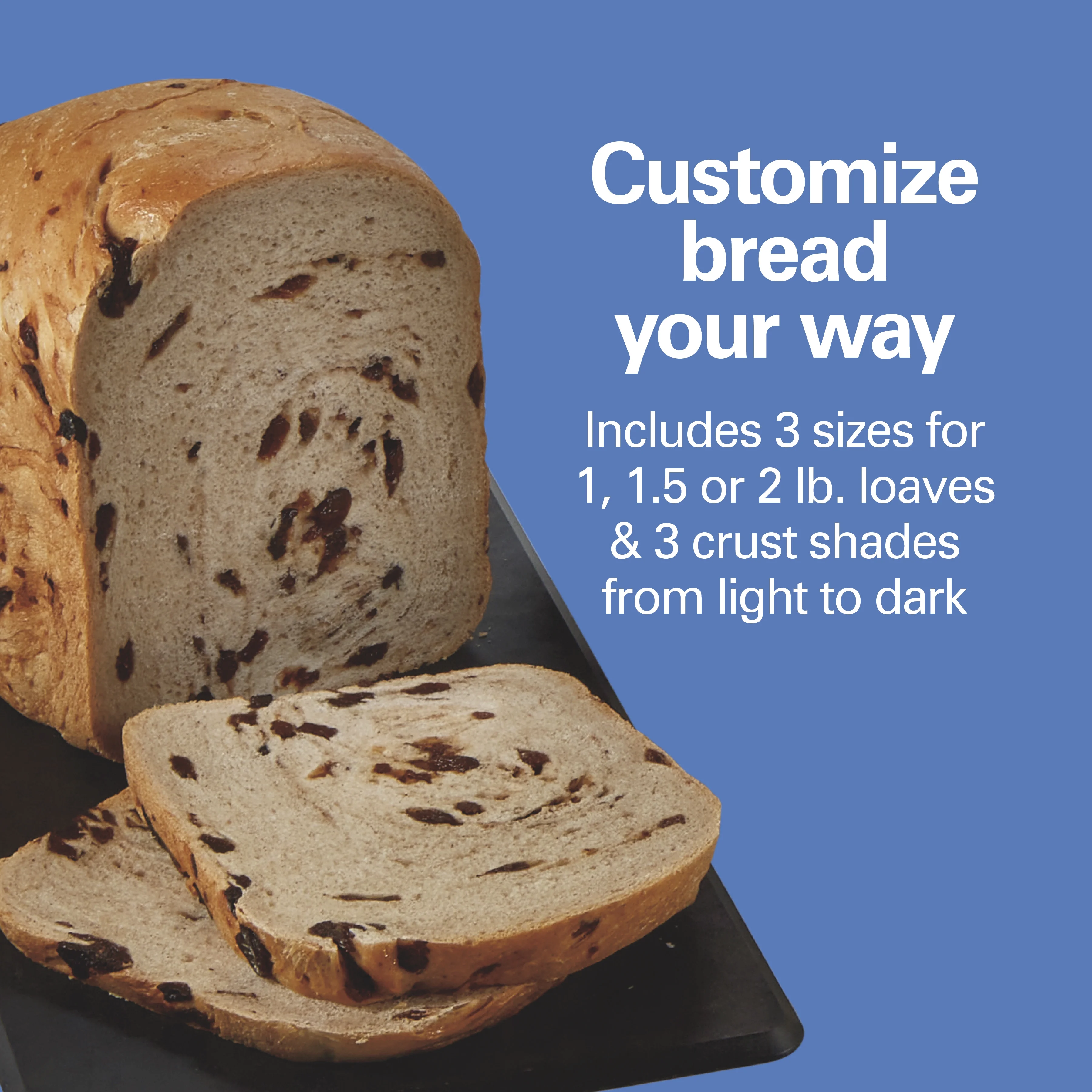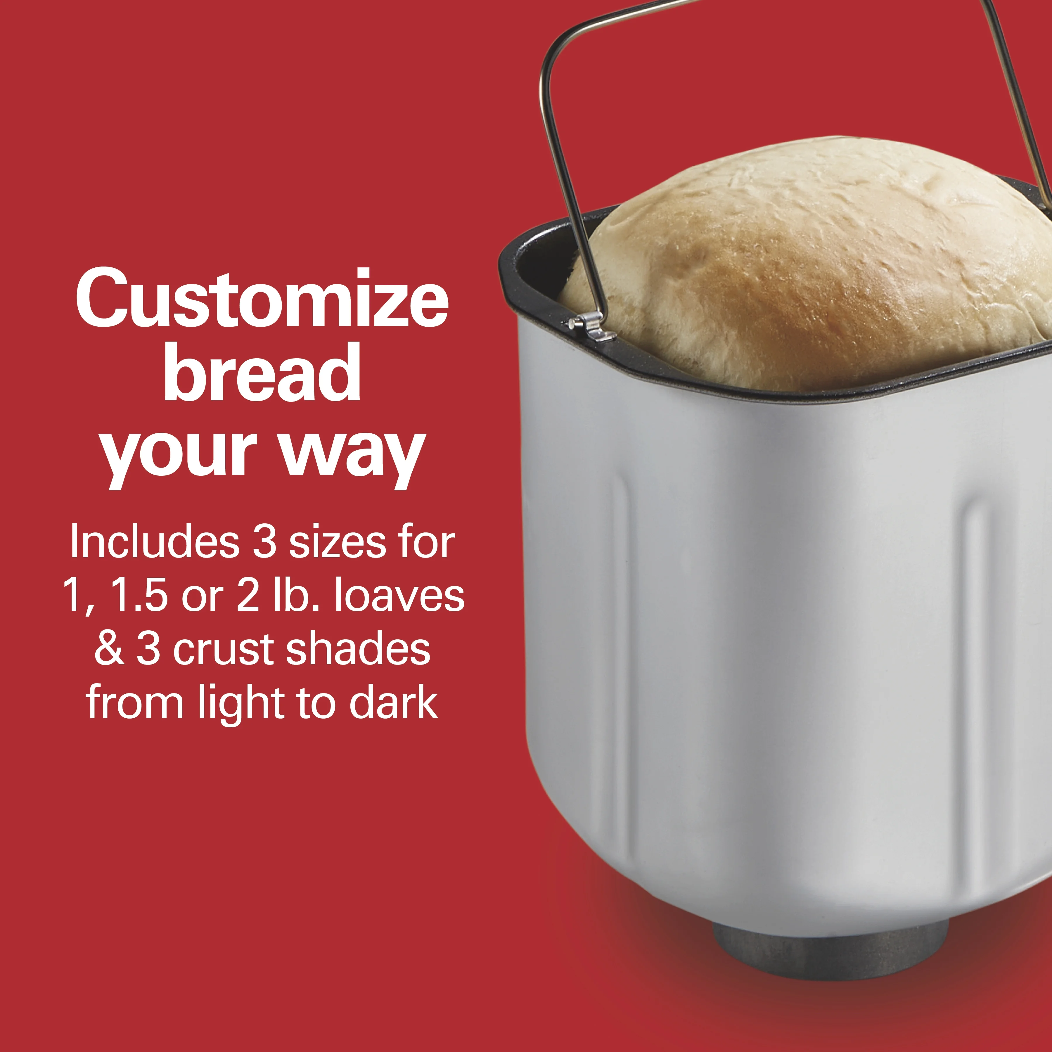 - Custom Loaf Options: Choose from 3 loaf sizes (1, 1.5, or 2 lb.) and 3 crust shades (light, medium, dark) for perfect results every time.