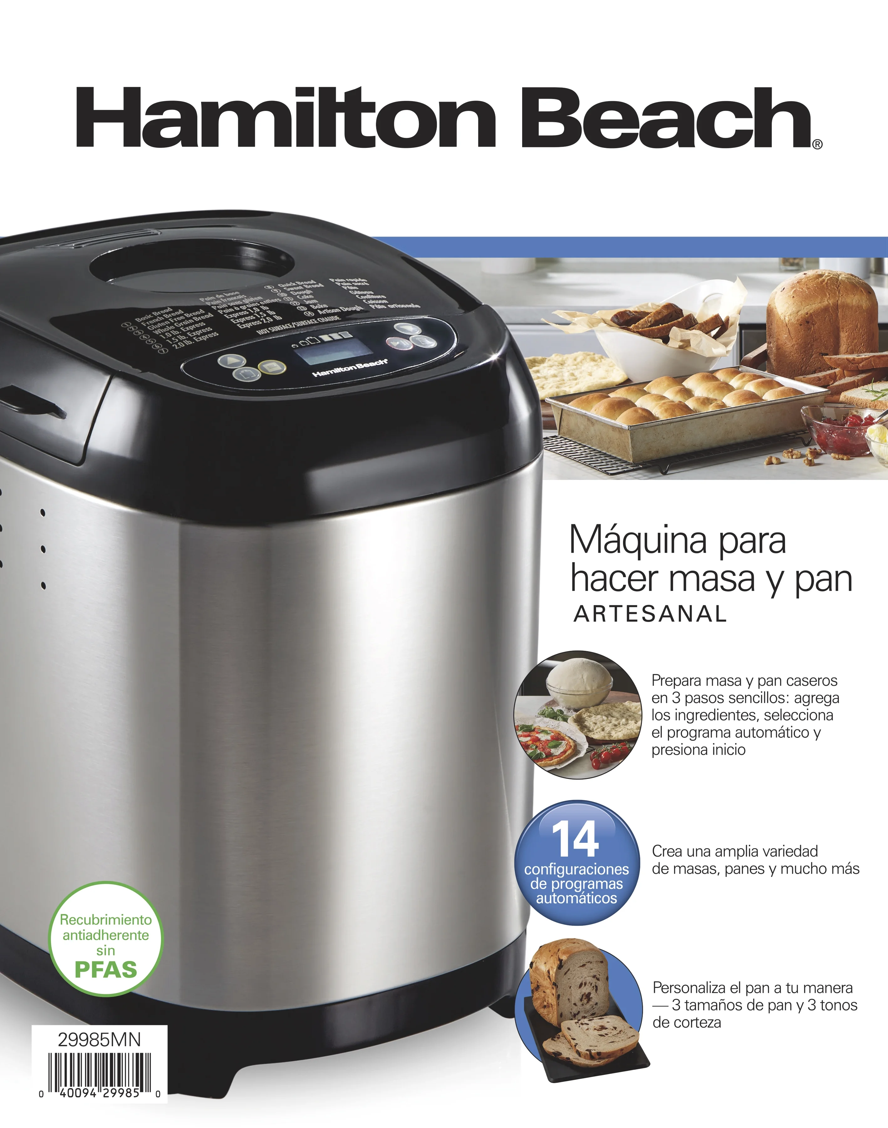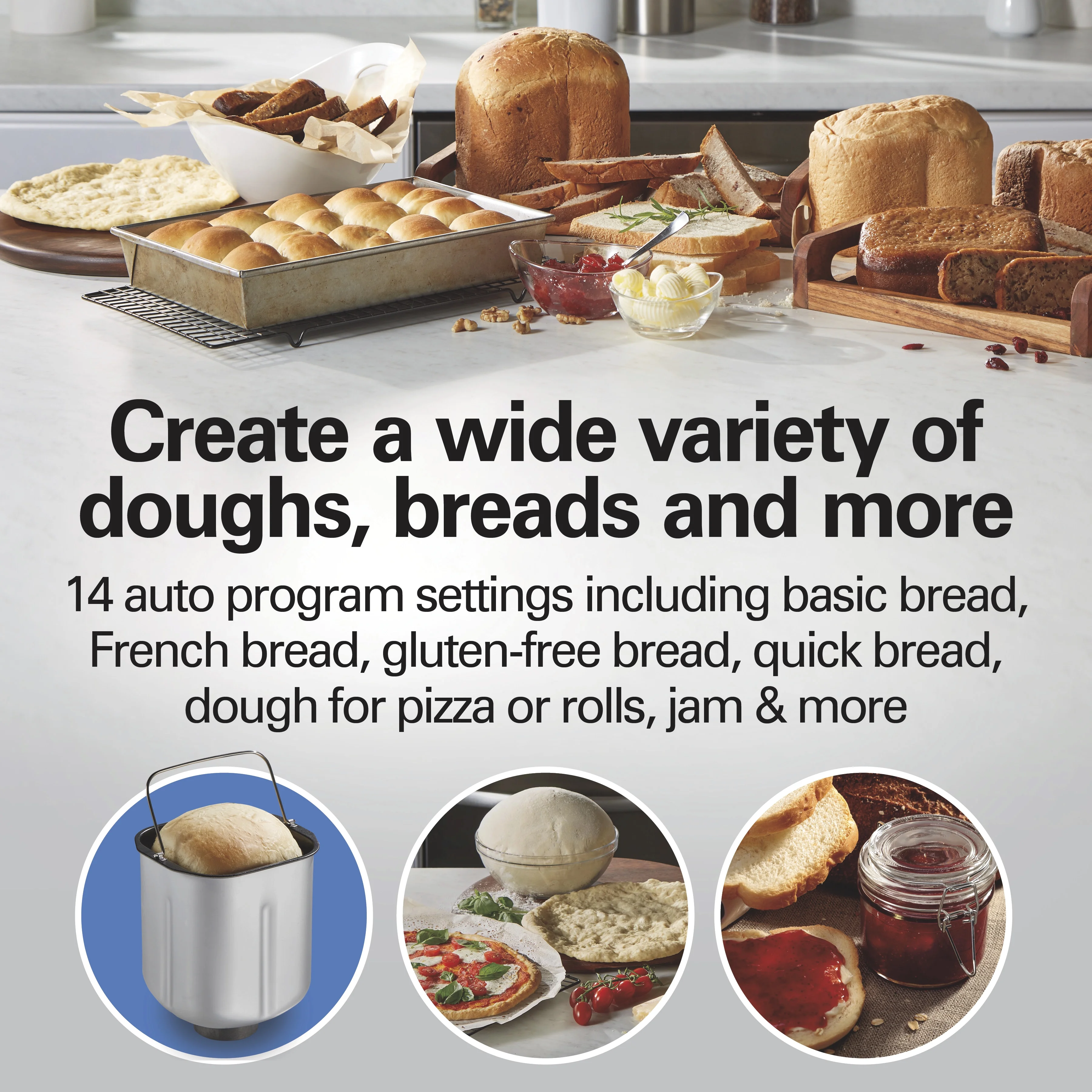 - 14 Versatile Settings: Bake basic, French, gluten-free, whole grain, sweet, and quick breads, plus dough, cake, jam, and artisan-style recipes.
