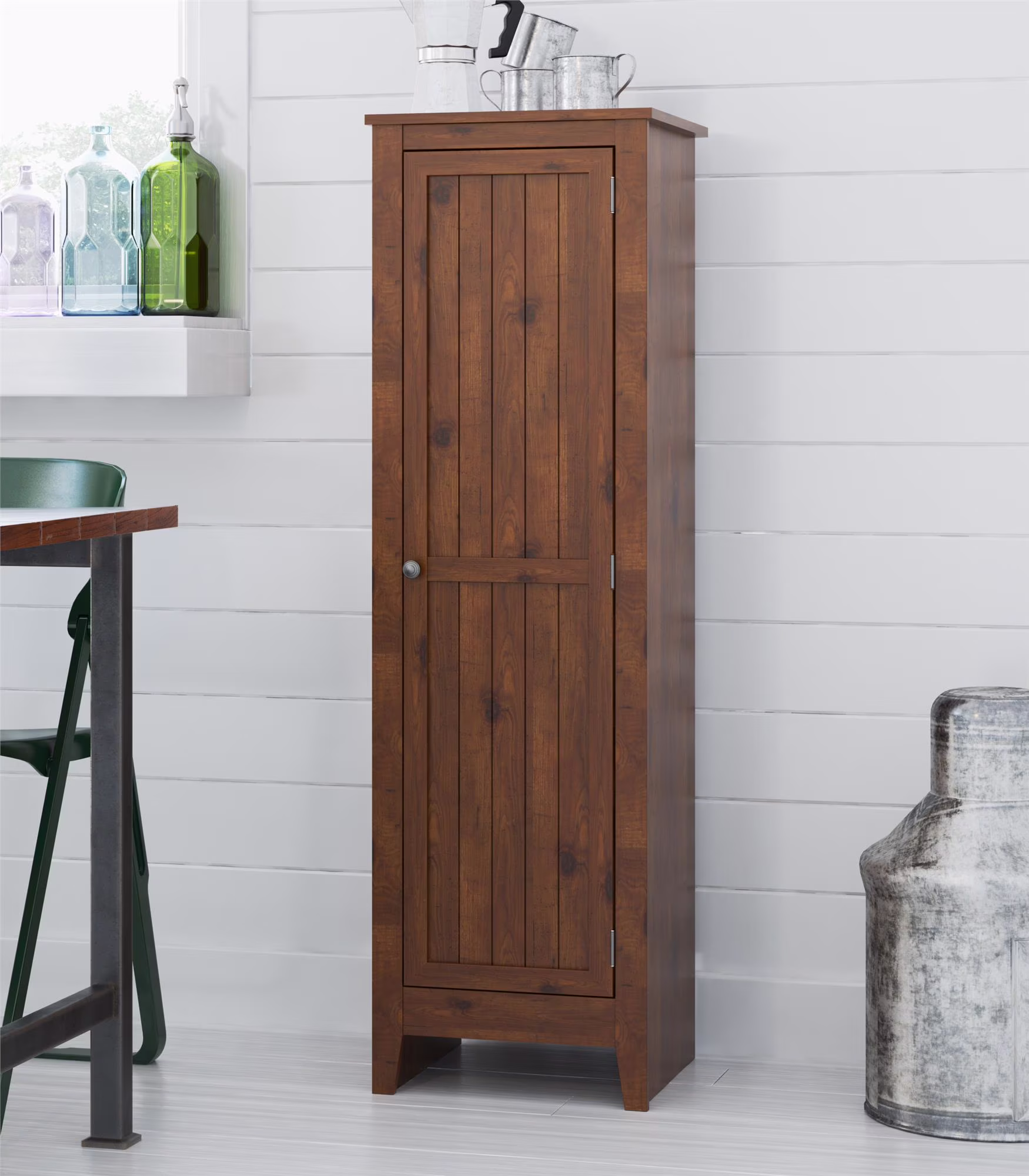 - The Milford Single Door Storage Pantry Cabinet is constructed of laminated particleboard. The Old Fashioned Pine finish, along with the wainscoting detail on the door front gives this piece a charming country feel