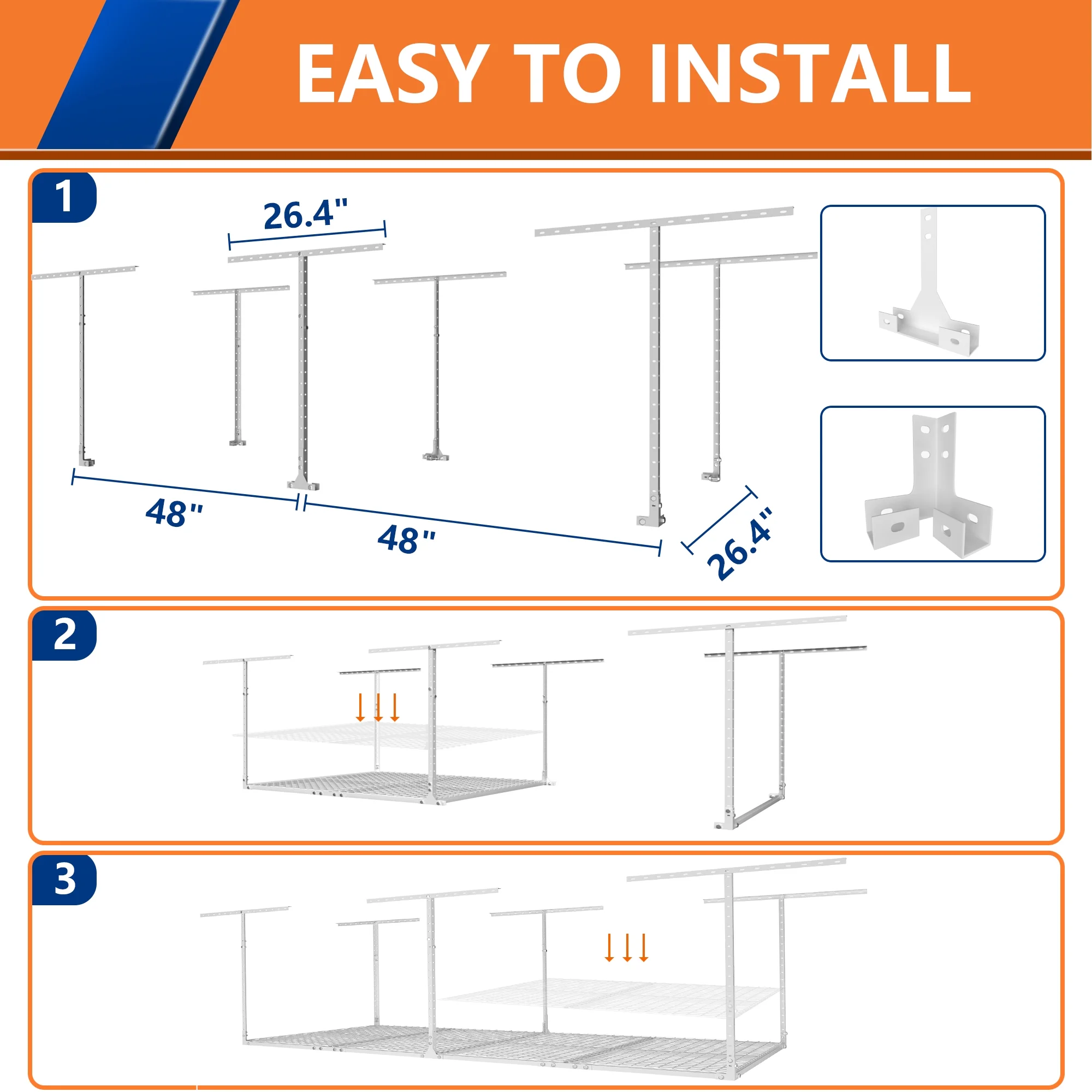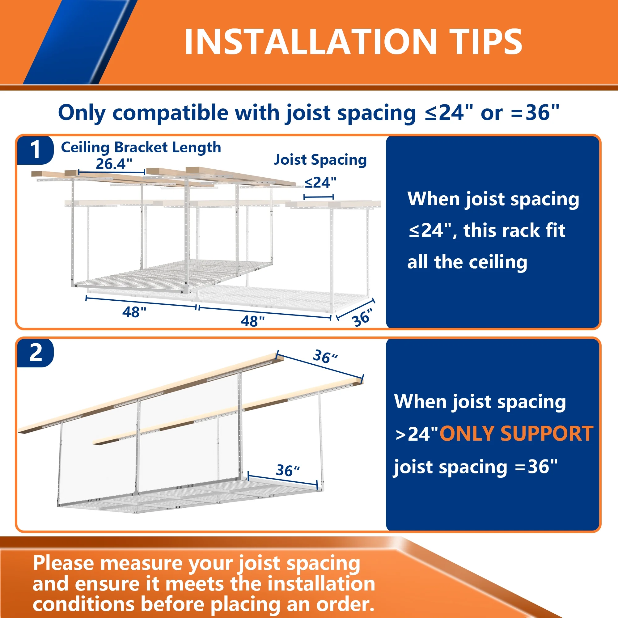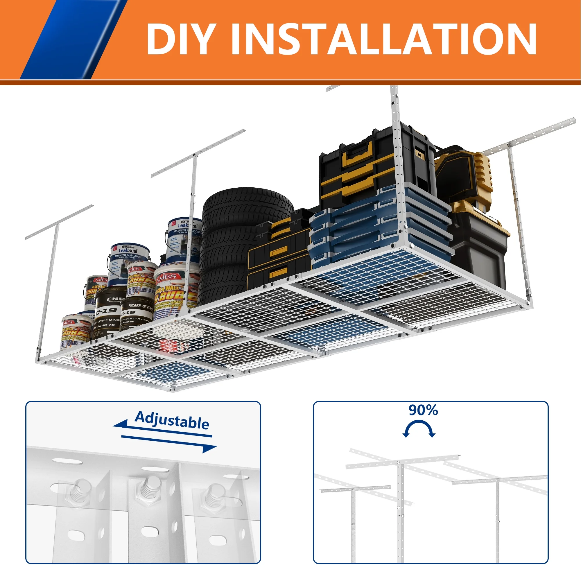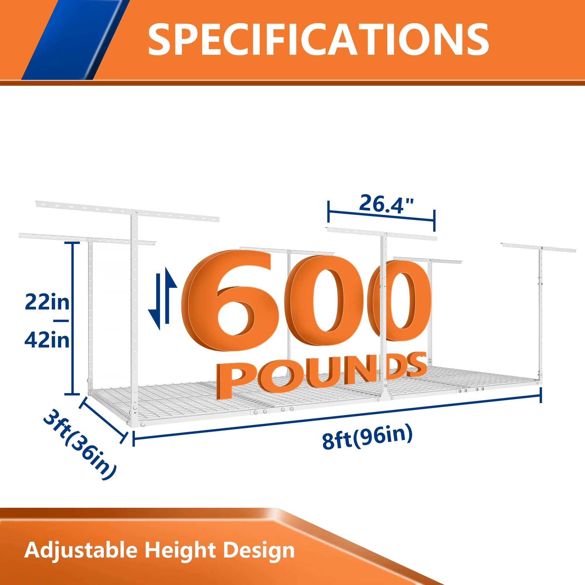 - ADJUSTABLE HEIGHT: Our garage storage racks are height adjustable,giving you the freedom to adjust the distance between the rack and the ceiling from 22 inches to 42 inches. This 3 FT x 8 FT ceiling mount rack adds up to 82 cubic feet of storage space.