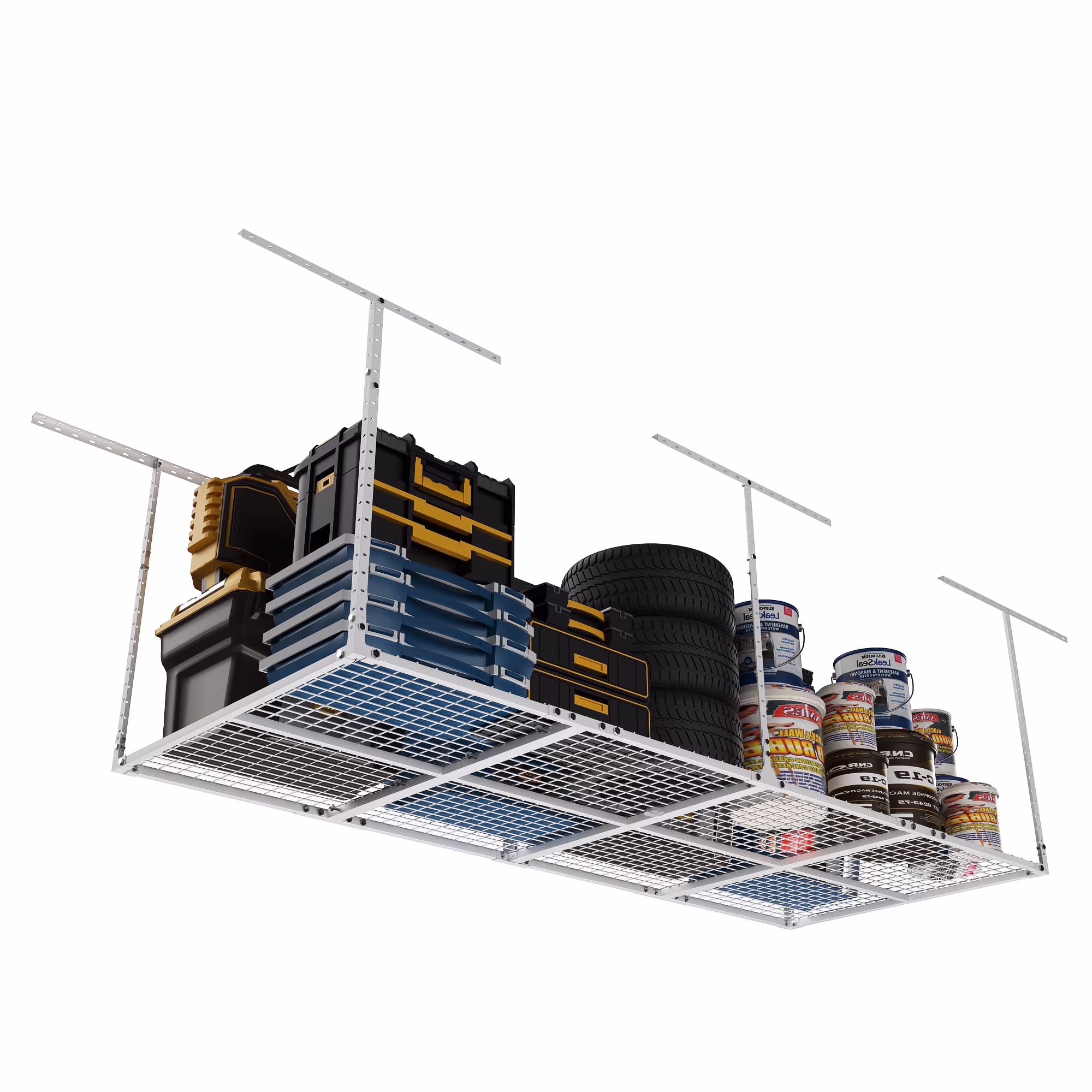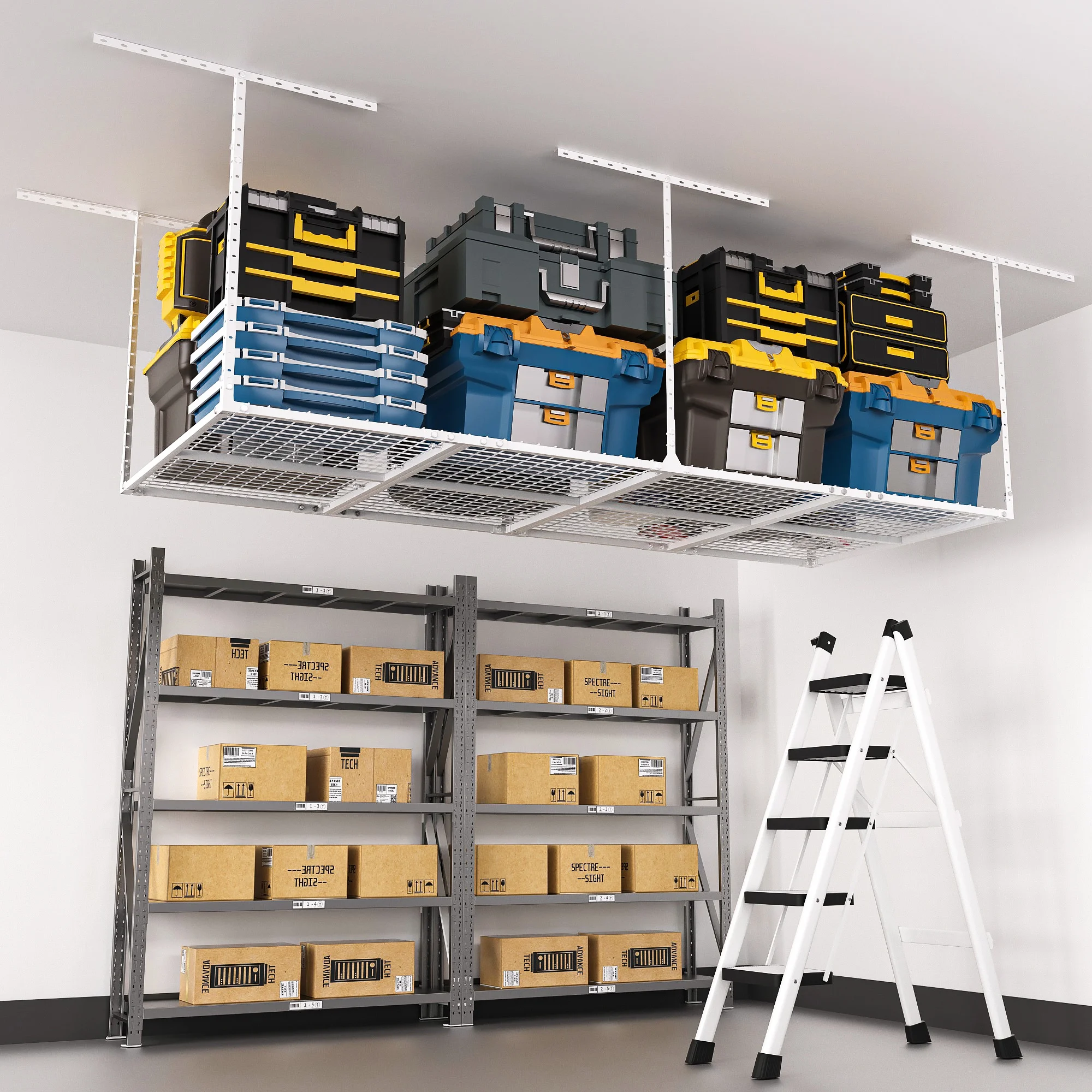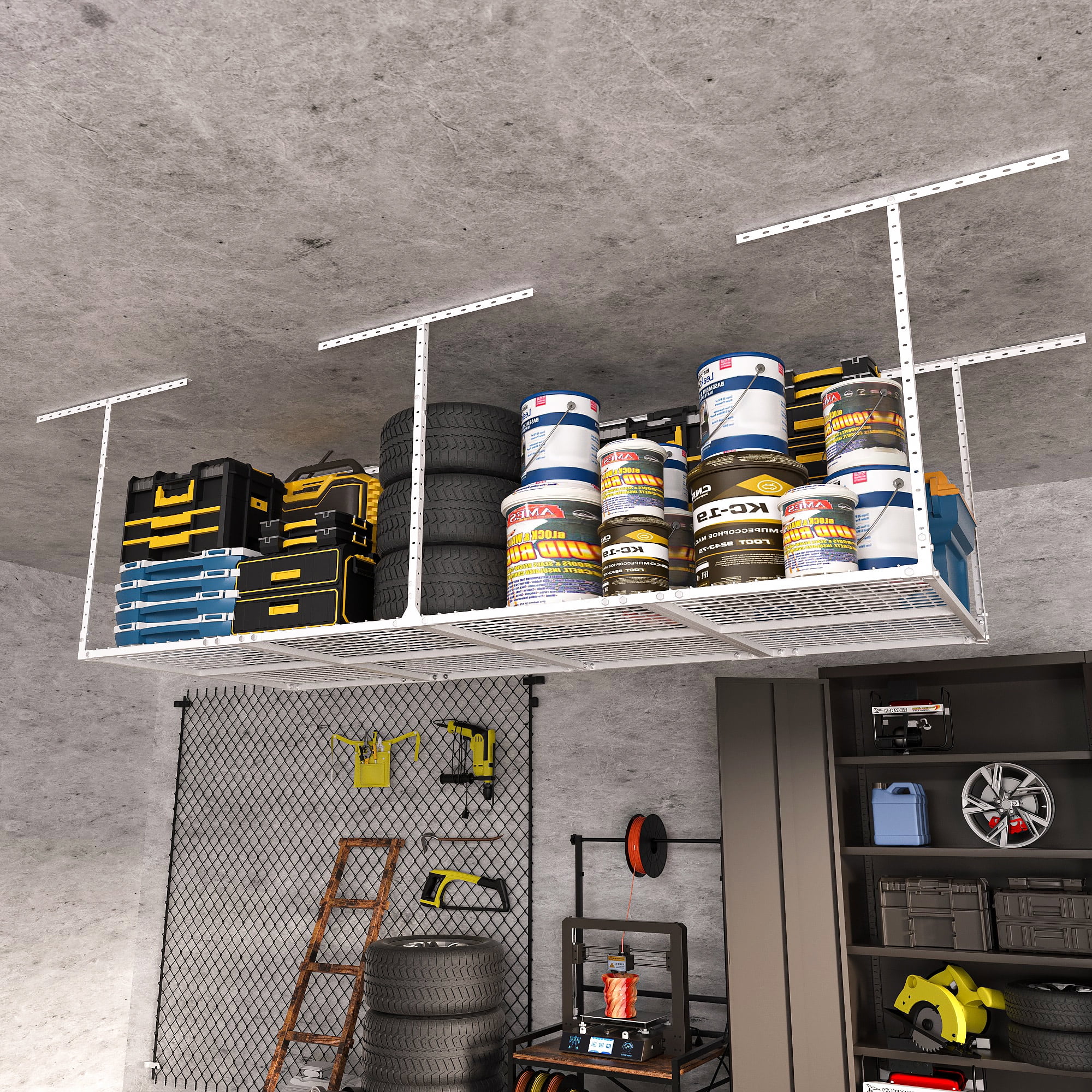 - MORE SPACE: Meet your storage needs with a ceiling mounted garage storage system for storing unused items. This hanging storage system is a great space saver, providing you with more storage space and better organization.