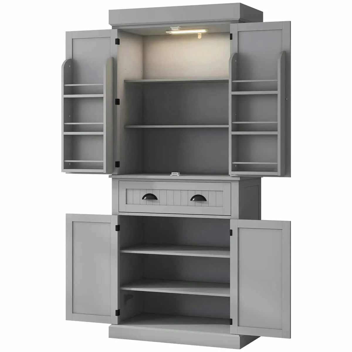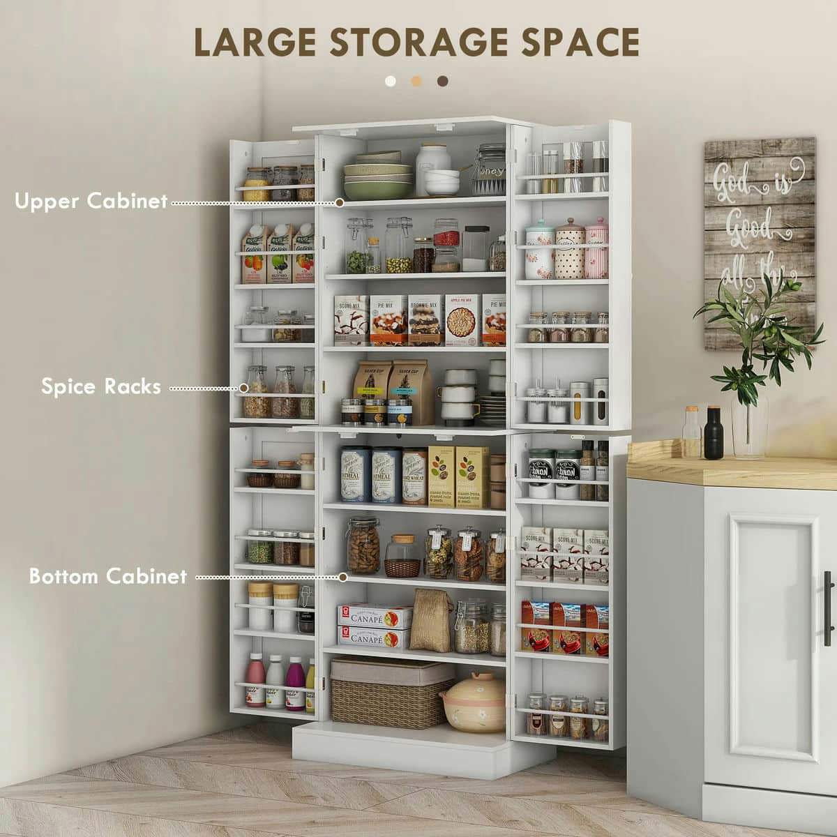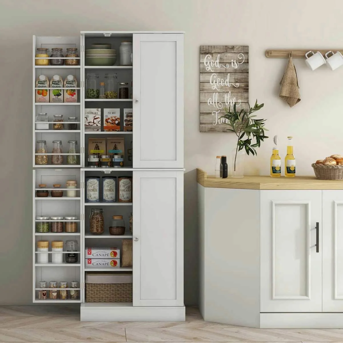 - Stylish Appearance: The polished and painted surface has a distinctive shine when illuminated by light making the kitchen cupboard look more exquisite. Meanwhile, its all-white appearance greatly increases the versatility in terms of decorating styles. Whether it's a modern or vintage style, the portable pantry for small space can fit in perfectly.