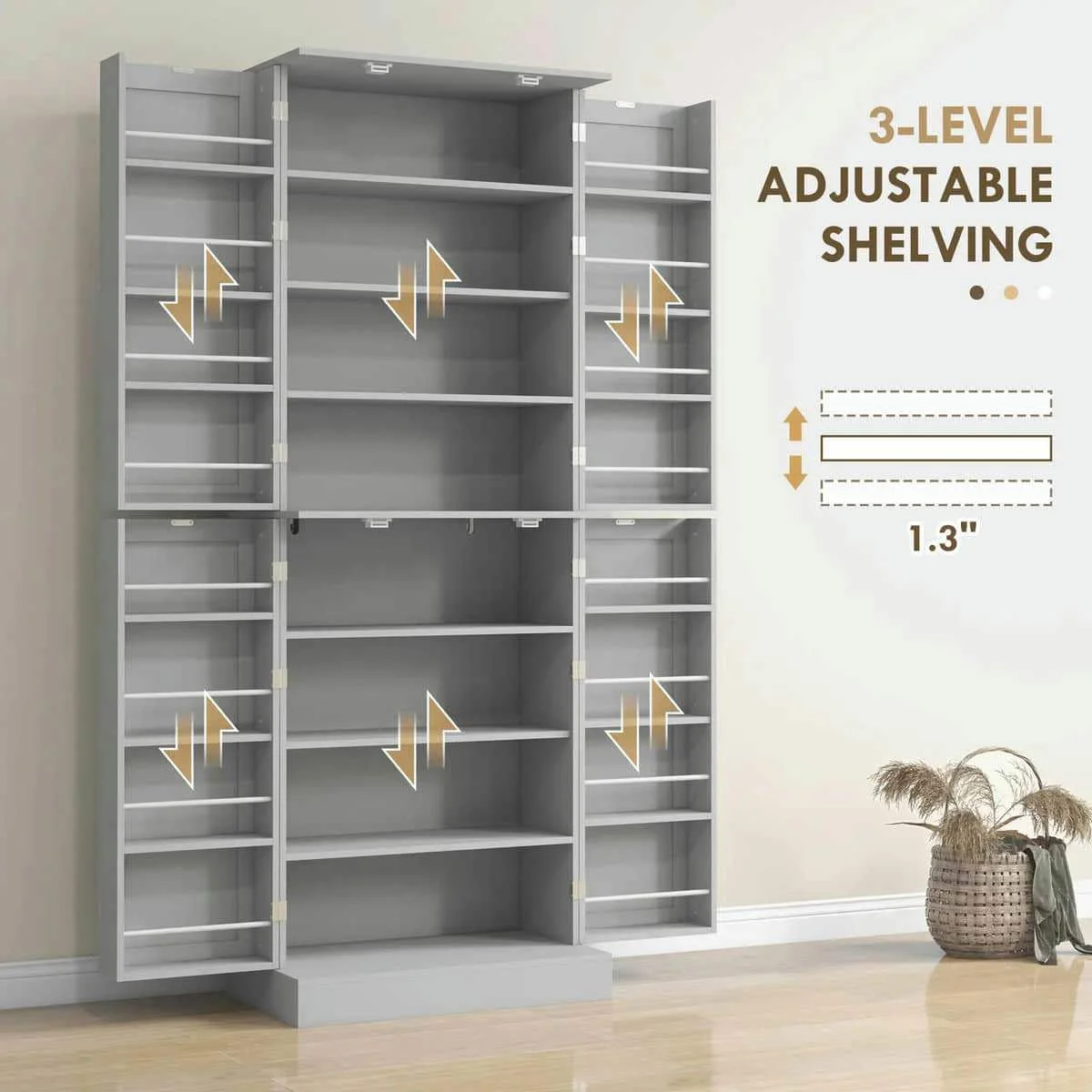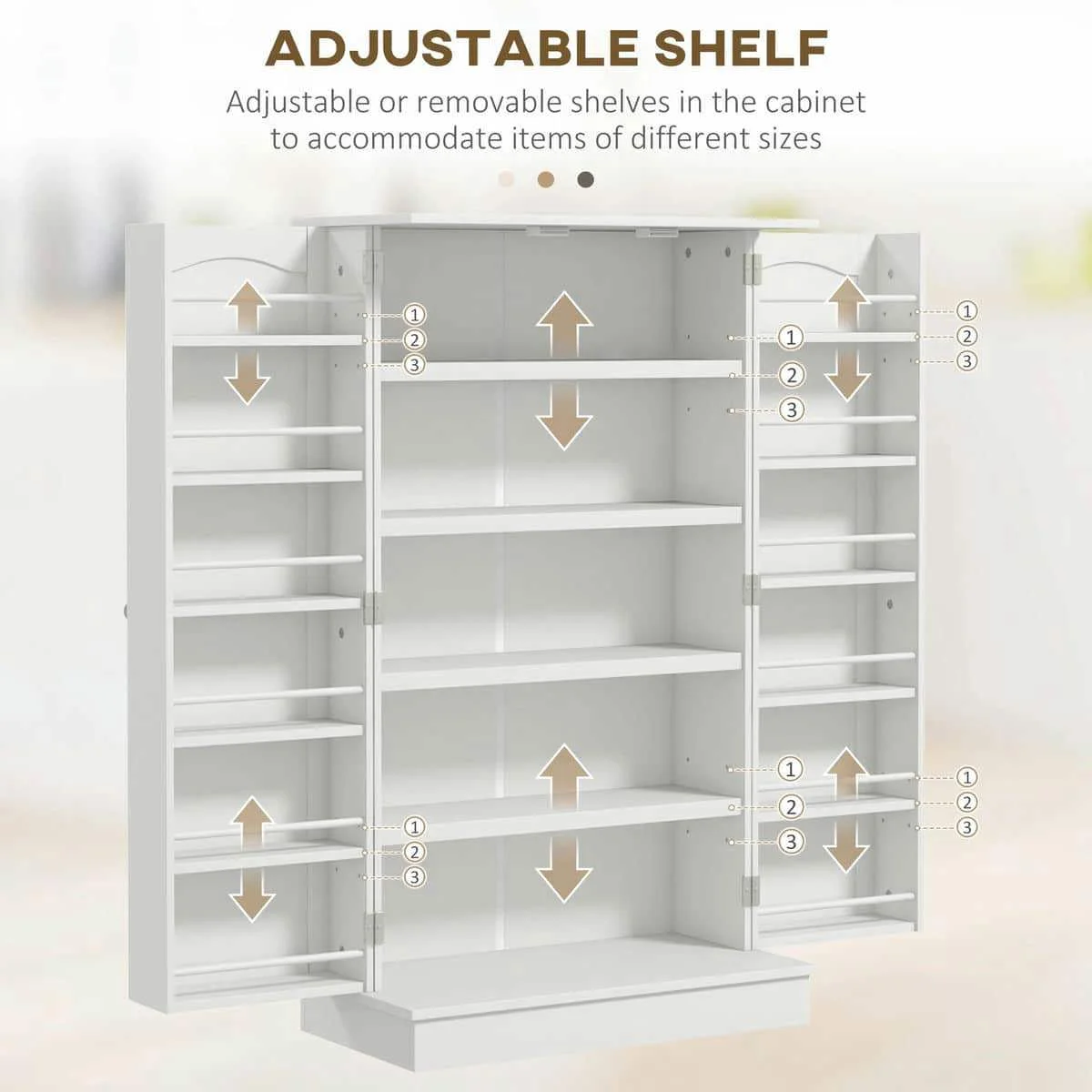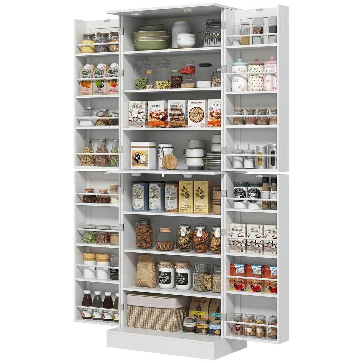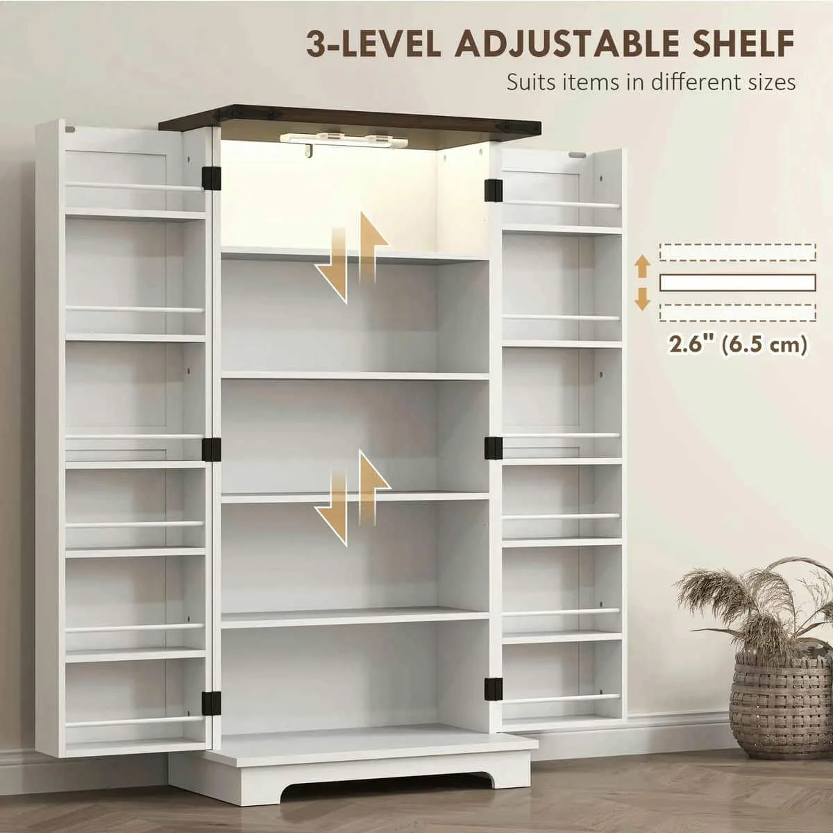 - Multi-Tier Design: Undoubtedly, mini pantry with multi-tier shelved design is a good way to extend storage space and sort diverse items. With two 6-tier shelves and a 5-layer compartment, the small pantry cabinet offers great hidden storage space. Plus, six 3-position adjustable shelves are evenly located inside for customized arrangement.