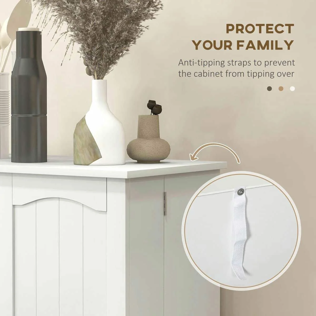 -Six 3-position adjustable dividers for free space arrangement-Spacious cabinet top suitable for decoration display-Two 6-tier side storage shelves for drinks and condiments-5-layer compartment for a variety of tableware-Anti-toppling device firmly fixes the organization cabinet to the wall-Better stability with a reliable MDF base-Magnetic catches tightly close the door-Applicable to kitchen dining room living room etc-Minimalist all-white appearance for more fashionable furnishing style Installation guide