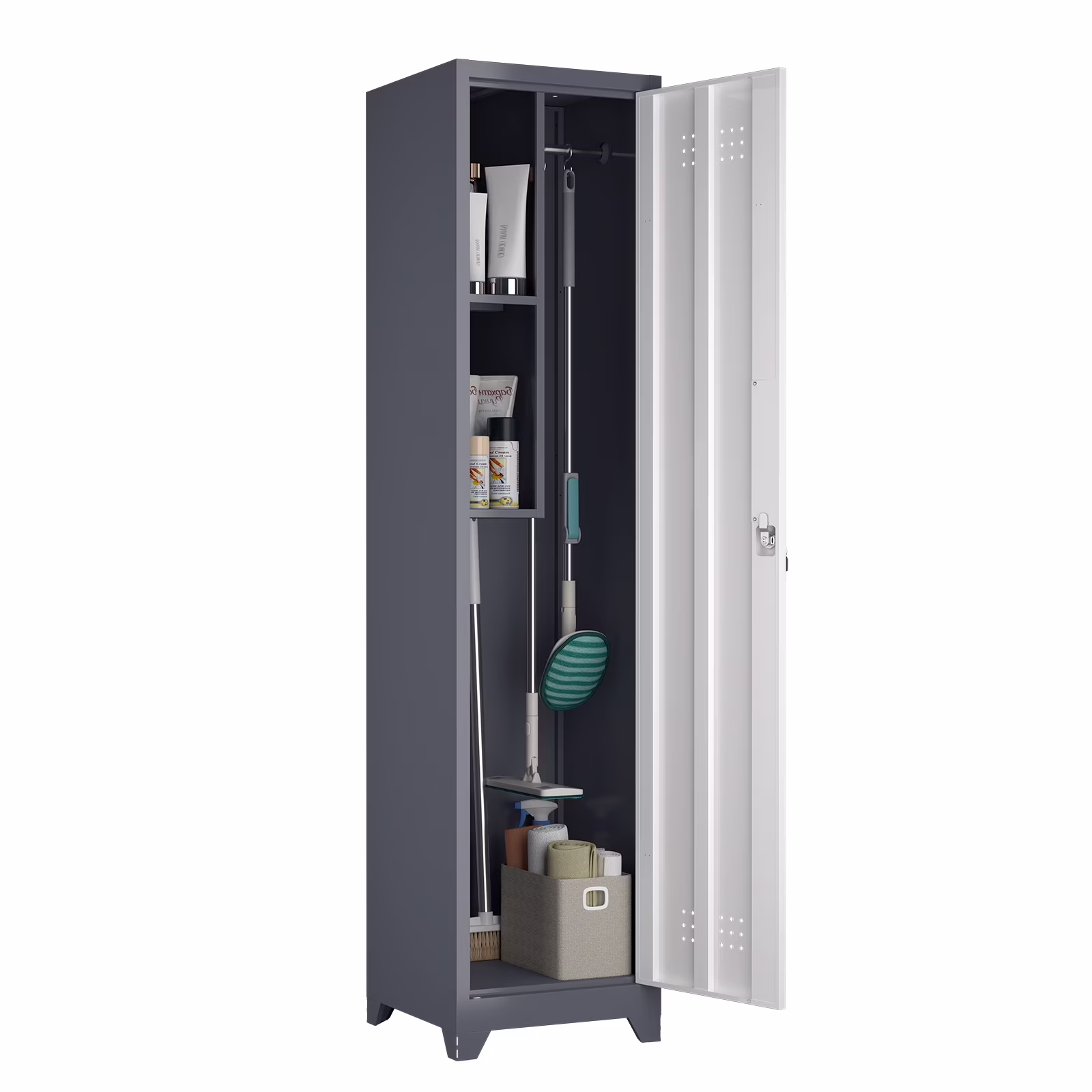[Multifunctional design] This cleaning tool storage cabinet design with clothes rails, pegboard and adjustable shelves allows you to flexibly arrange the internal space to meet the storage needs of different items, suitable for offices, storage rooms, utility room, gym, garage