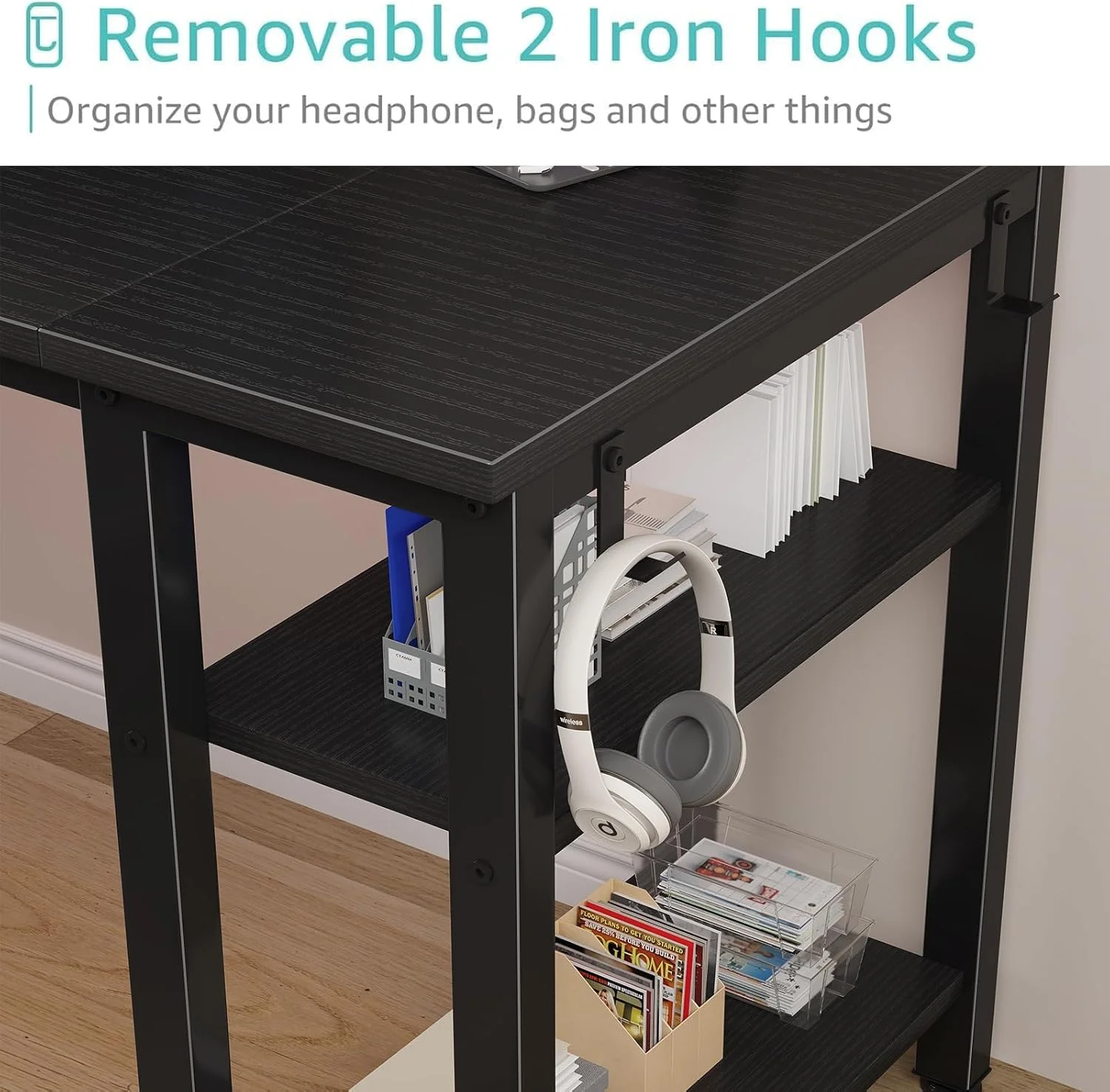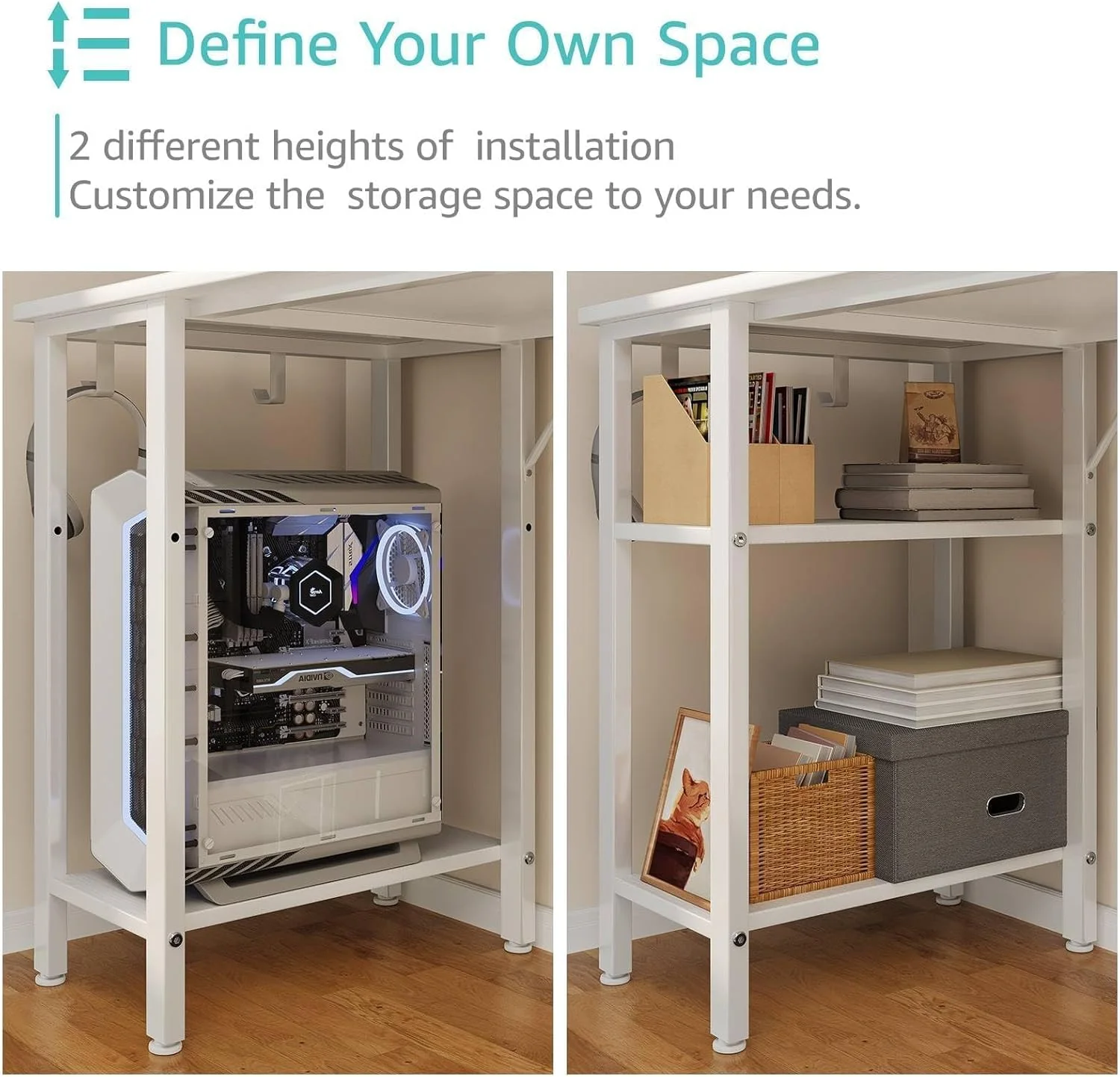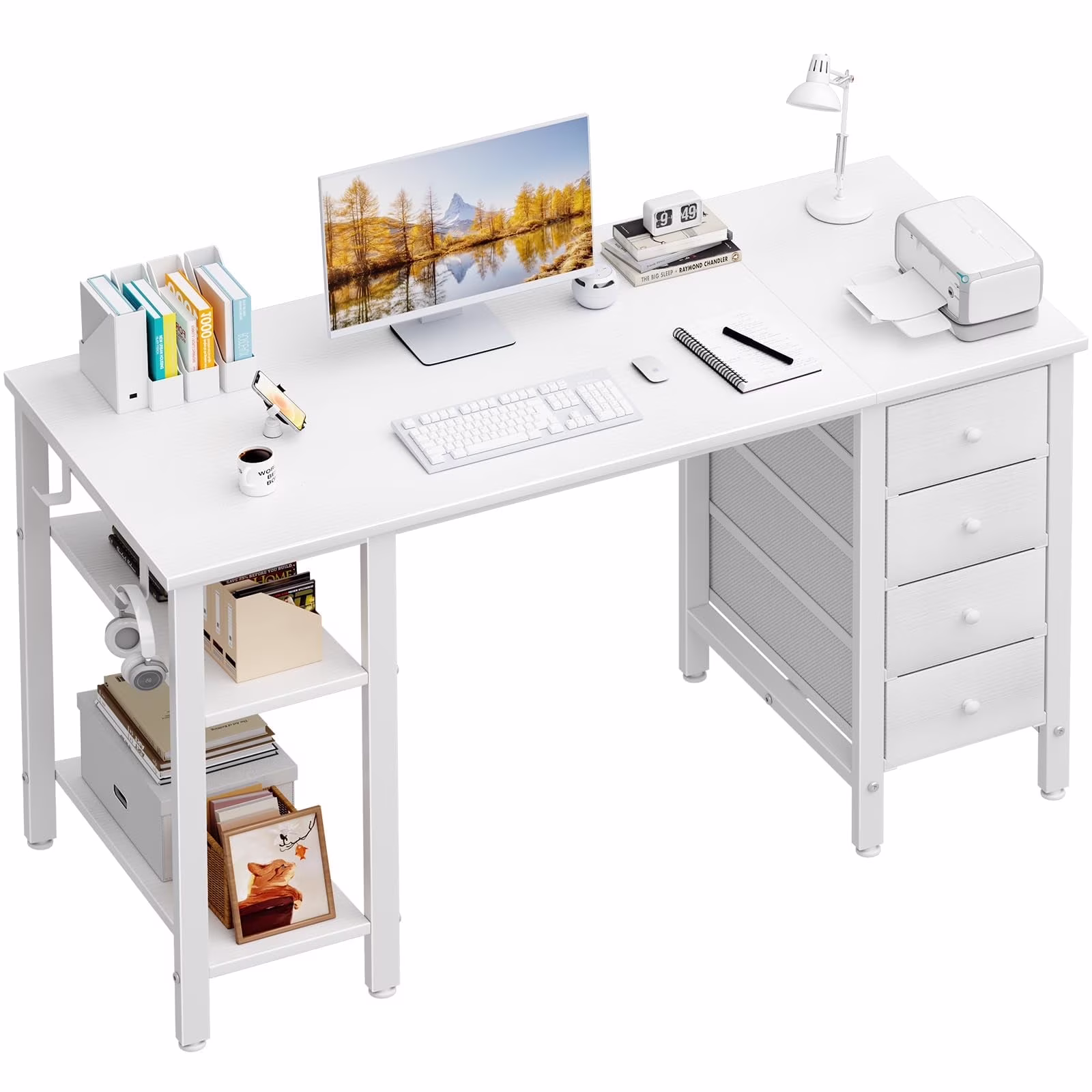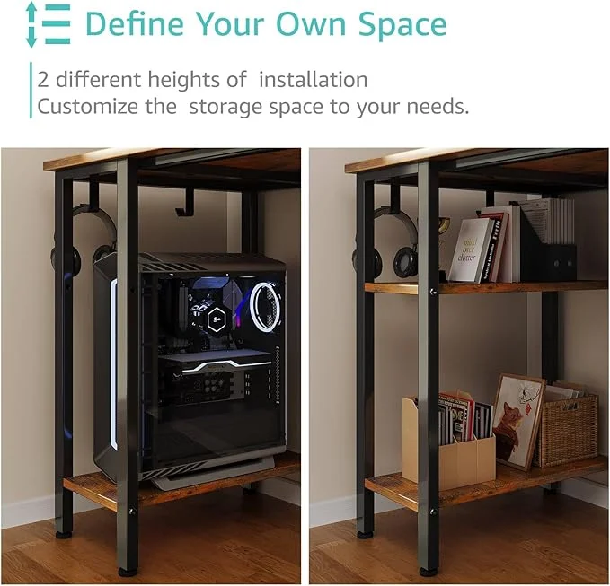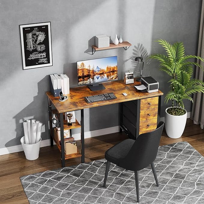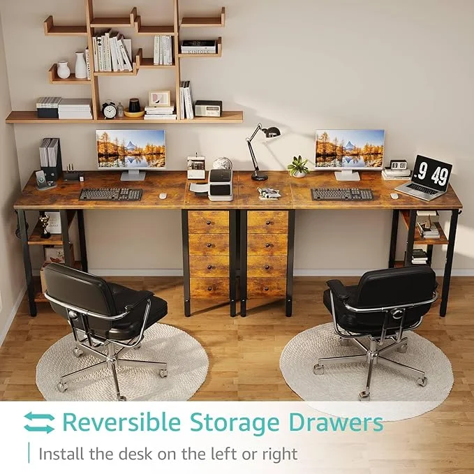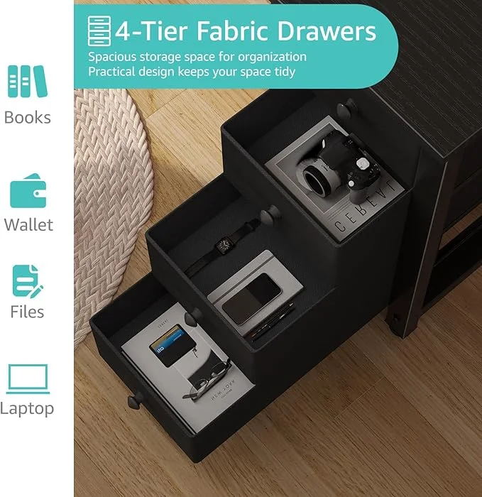 - Modern Simple Style Design: Computer desk with 2 storage shelves and 4 FABRIC DRAWERS with wooden front, you can try this two installation methods (left or right), and the shelves have two different heights of installation, you can customize the storage space to your needs. This desk is made of thick P2 particle wood board with scratch-resistant, anti-collision and waterproof, protect home office desk surface from daily wear and tear.