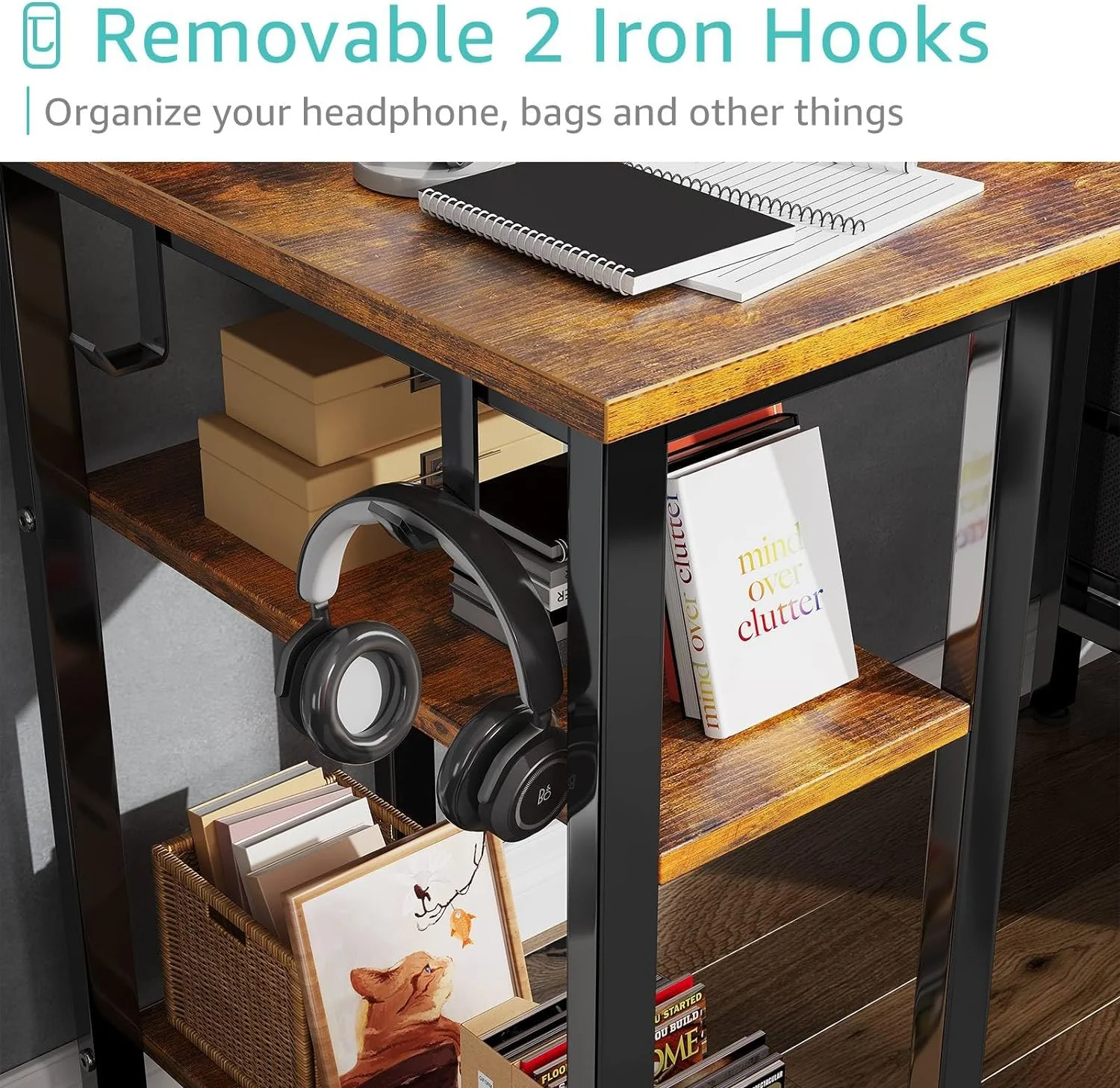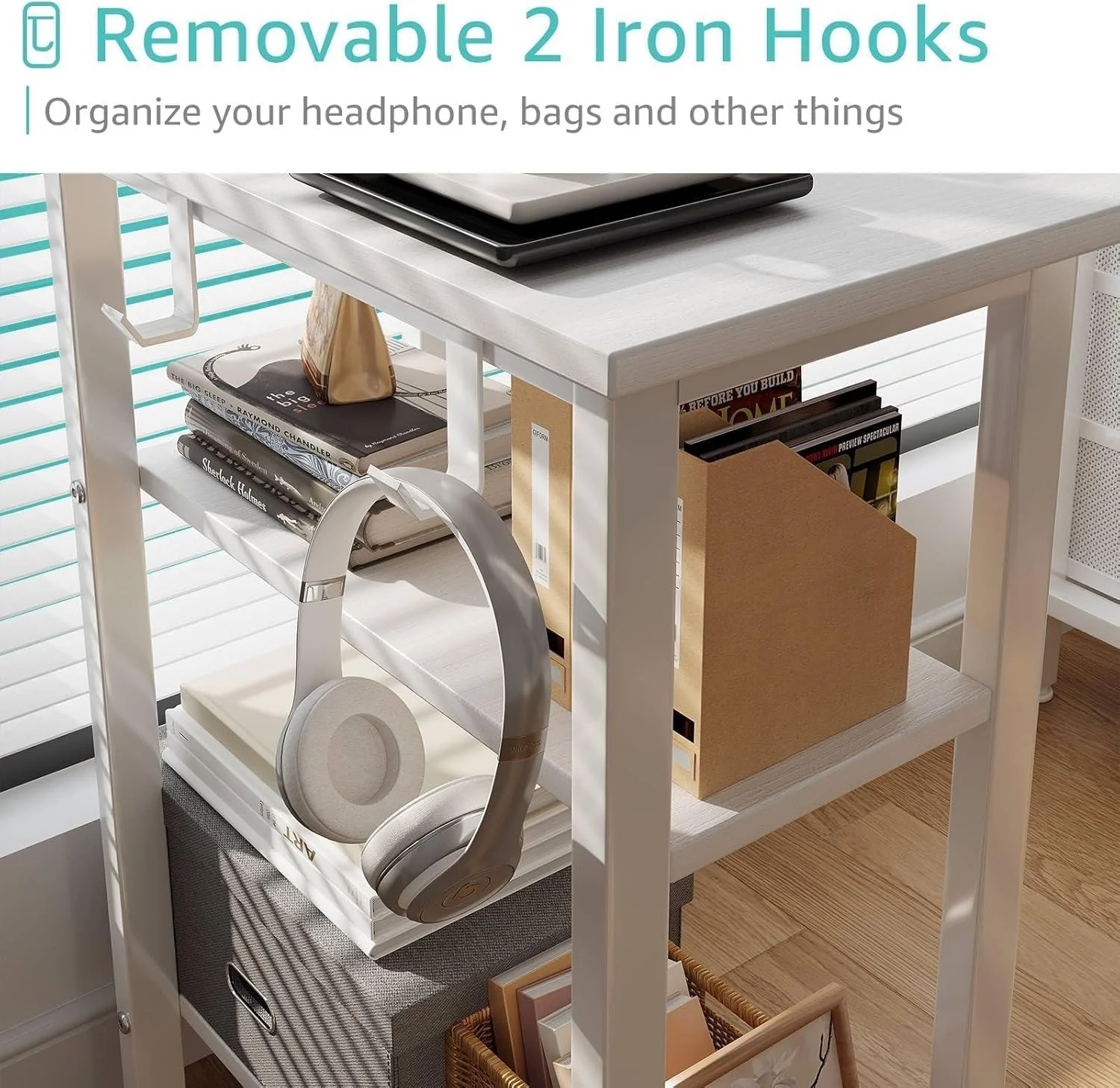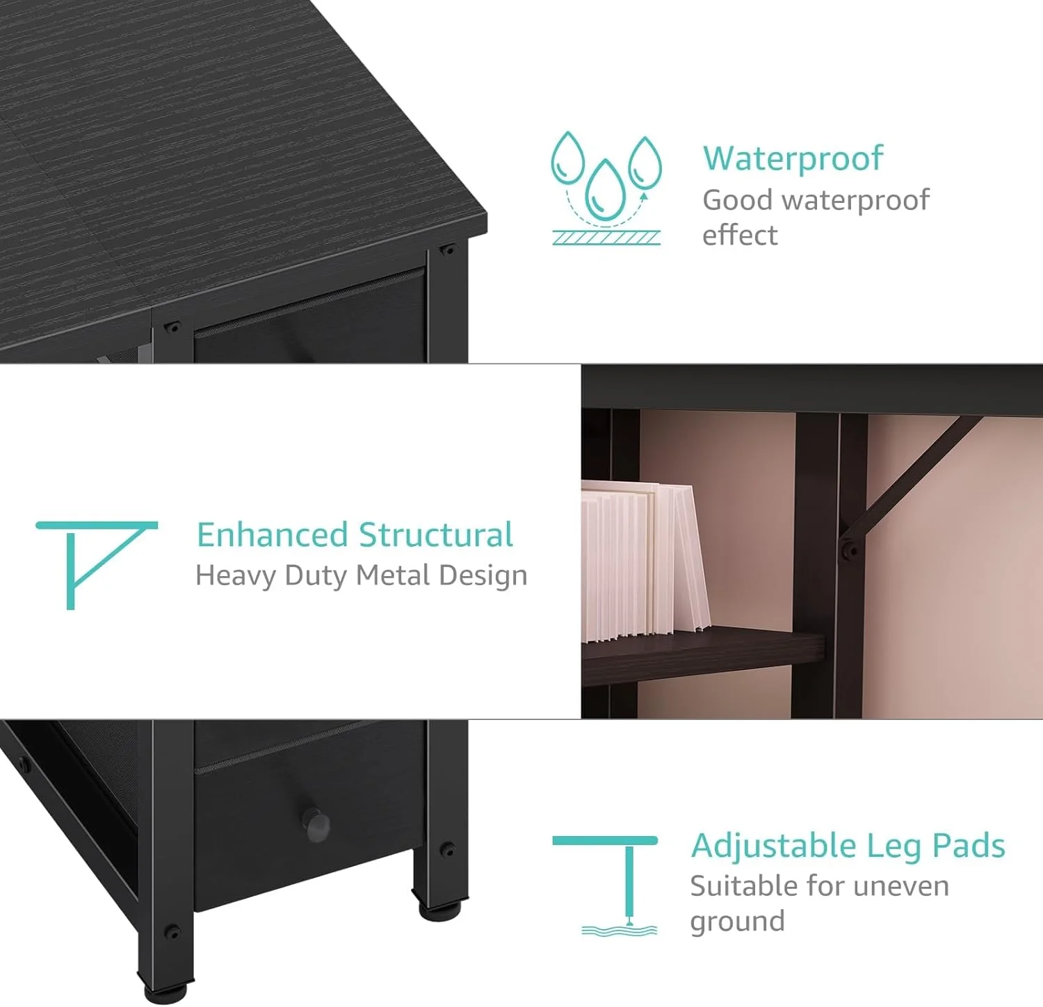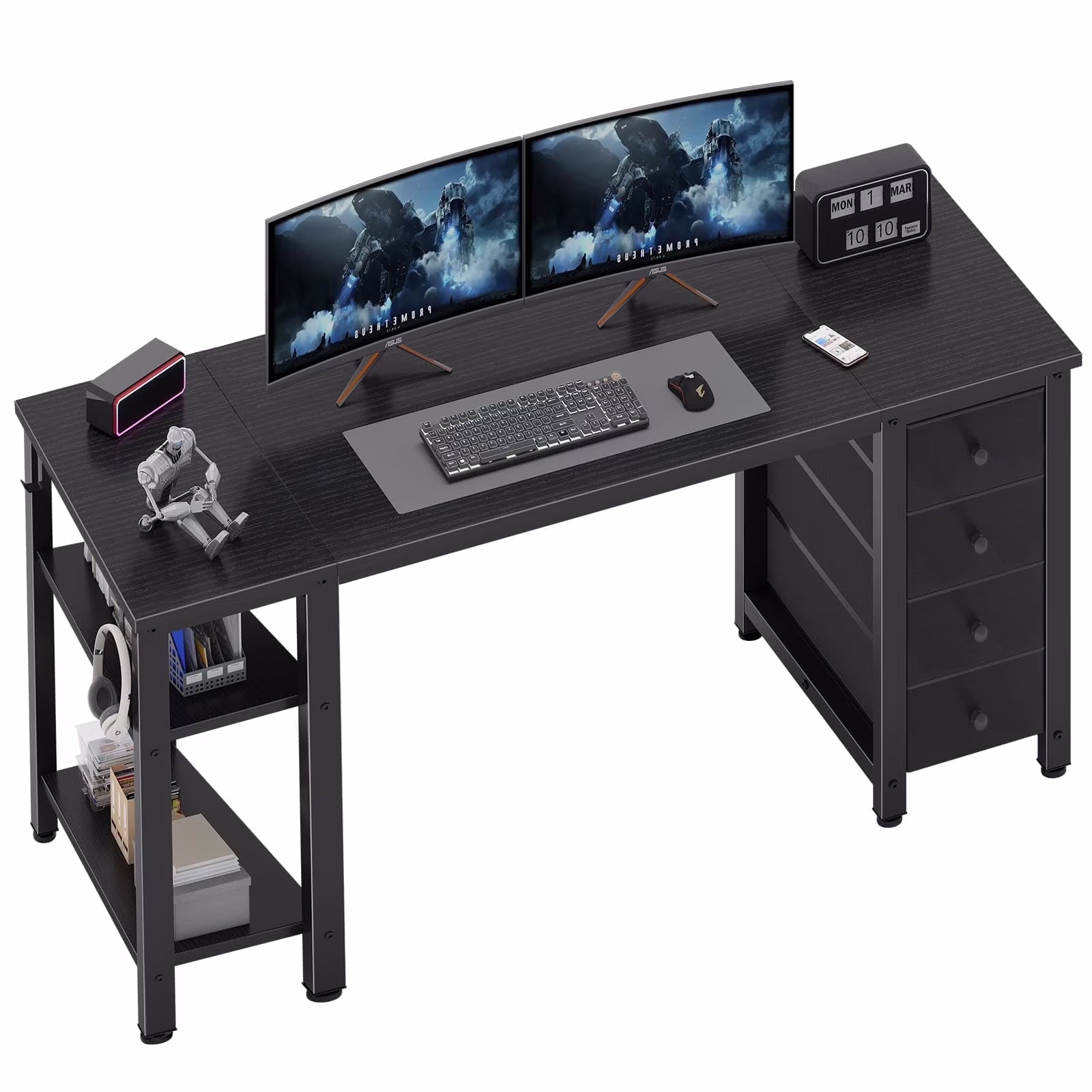- Modern Simple Style Design: Computer desk with 2 storage shelves and 4 FABRIC DRAWERS with wooden front, you can try this two installation methods (left or right), and the shelves have two different heights of installation, you can customize the storage space to your needs. This desk is made of thick P2 particle wood board with scratch-resistant, anti-collision and waterproof, protect home office desk surface from daily wear and tear.