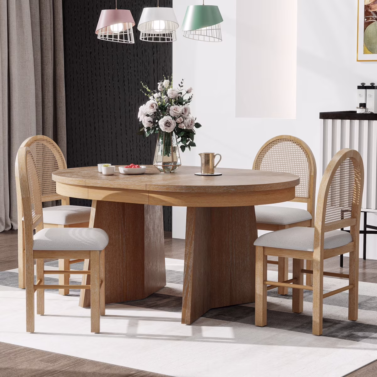 Our 5-piece retro dining set combines style and function with an extendable solid wood table and 4 upholstered chairs featuring rattan backrests. The table extends from 42 to 58 inches, seating 4-6 people effortlessly. Durable oak-veneered MDF resists scratches, while rubberwood legs ensure stability. Comfortable linen cushions and rattan accents add vintage charm. Easy to assemble and maintain, it’s perfect for family meals and gatherings!