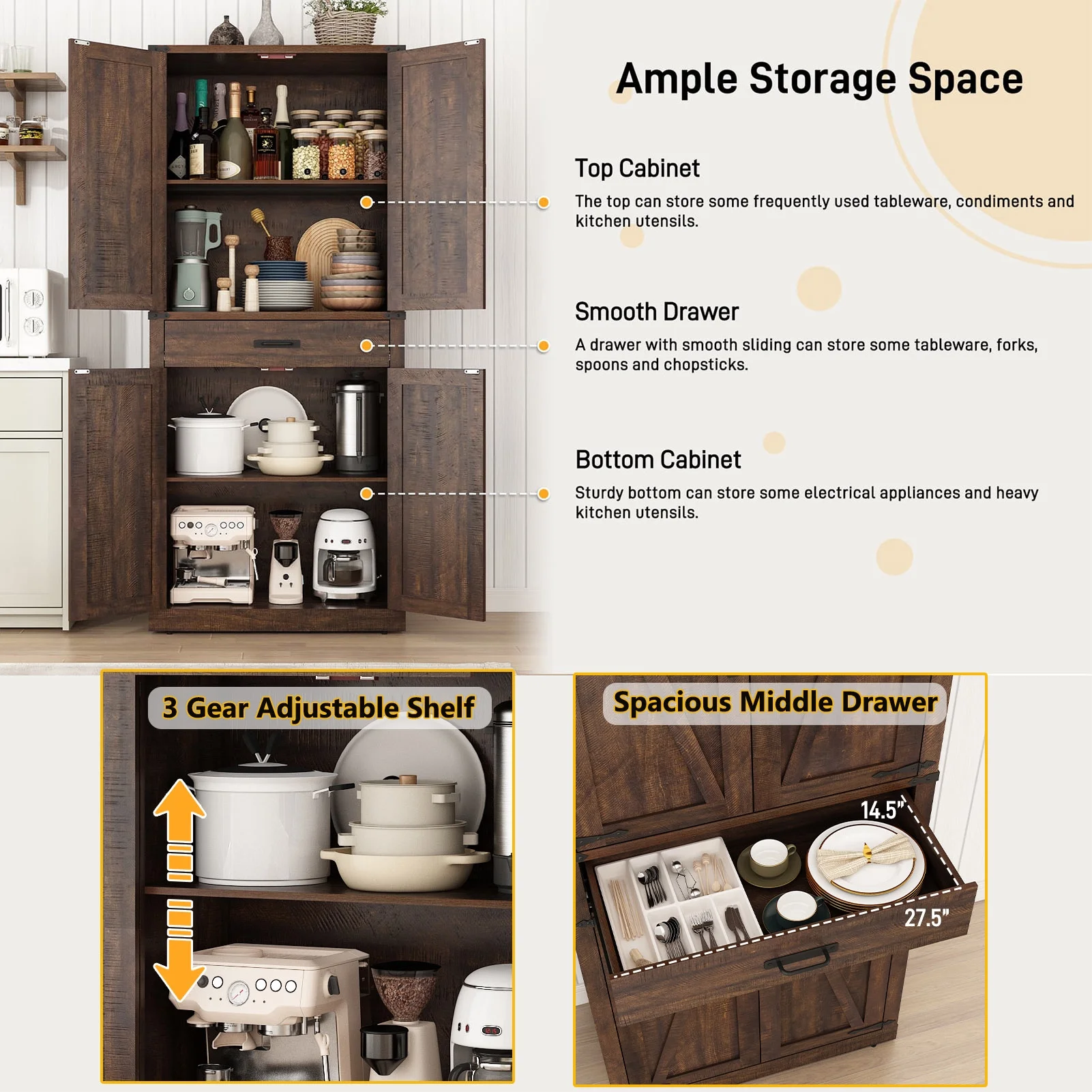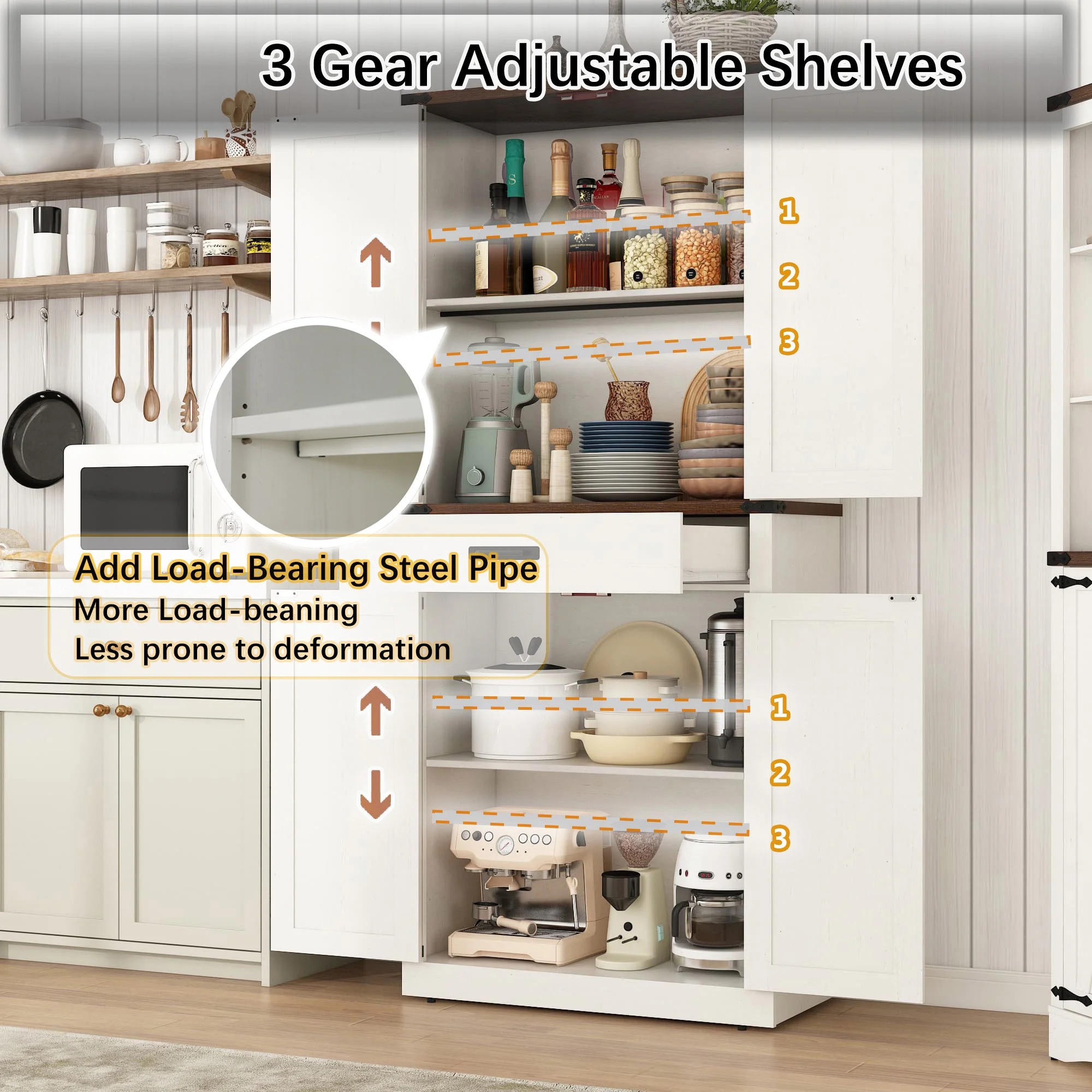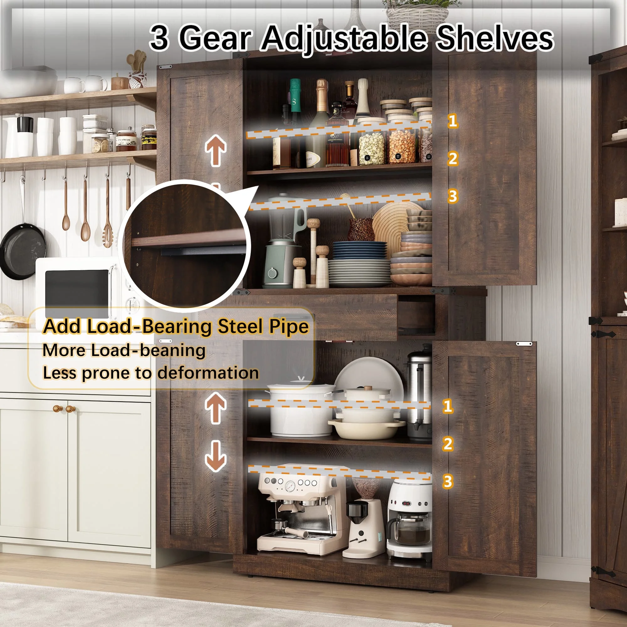 Roomy Storage Space: 72-inch tall pantry design with 4-level storage sapce and 1 drawer. Storage Shelves can 3 level height adjustable and great store diffenernt height of things like spice jars, snacks, drinks, food, plates, and various bottles and cans. Middle large storage drawer can store forks, utensils and dinnerware that is easy to take at hand. Sturdy bottom cabinet suit for store small appliances and some cookwares for a clean and tidy kitchen.